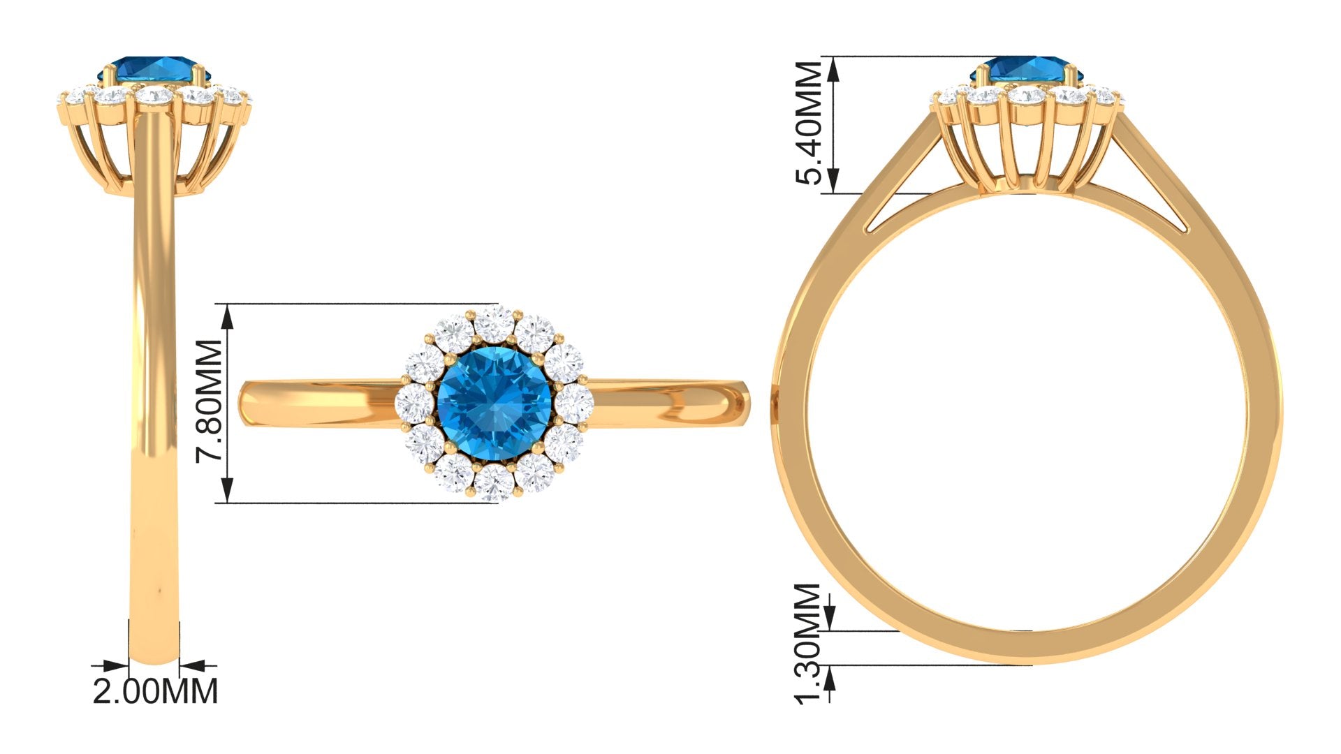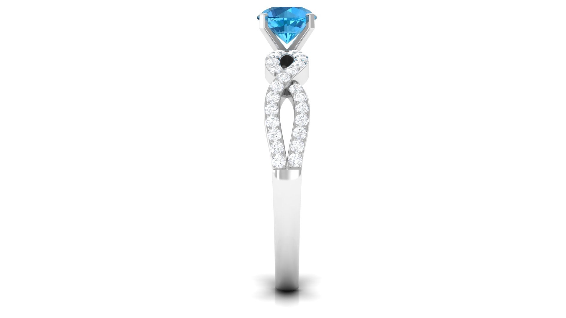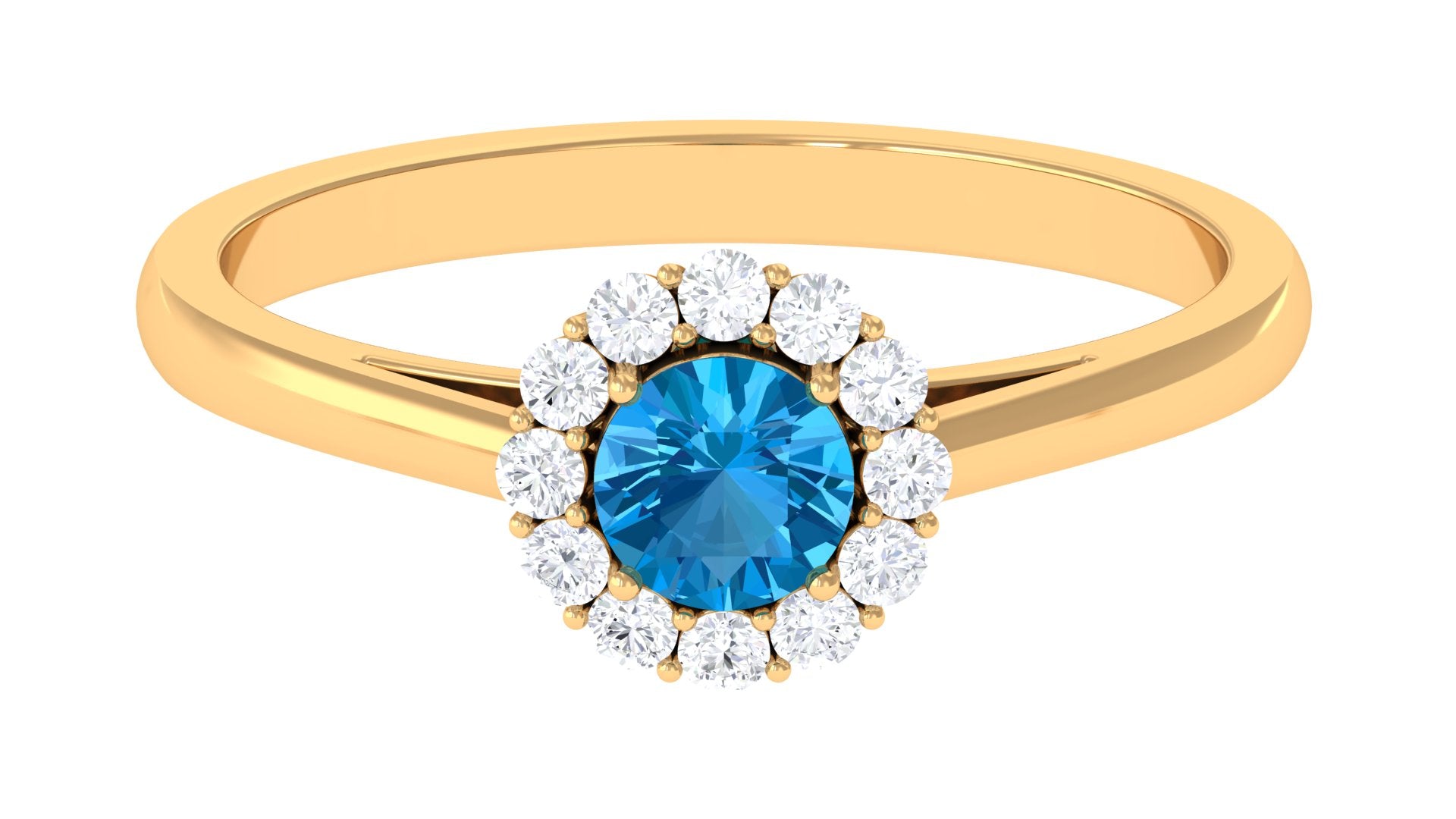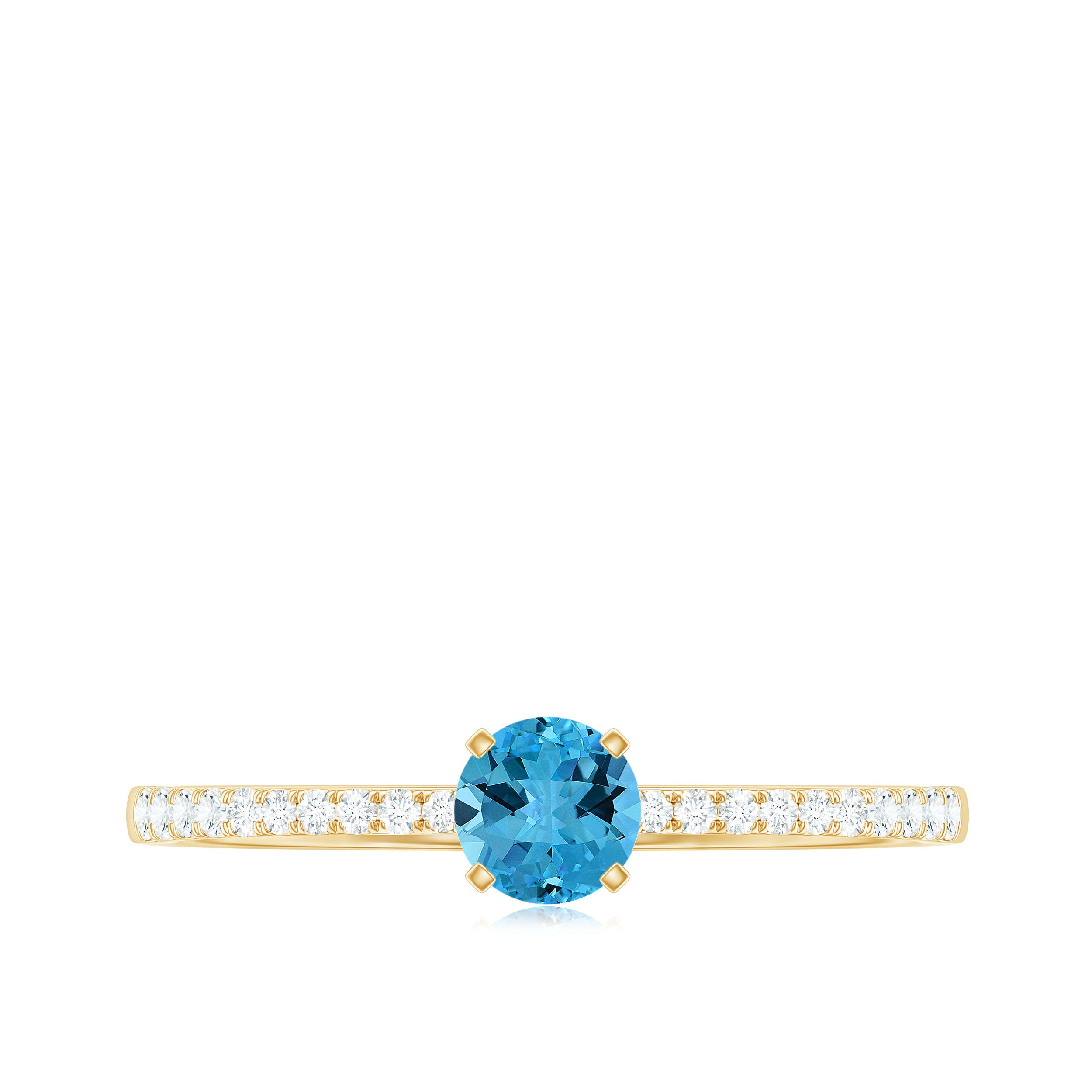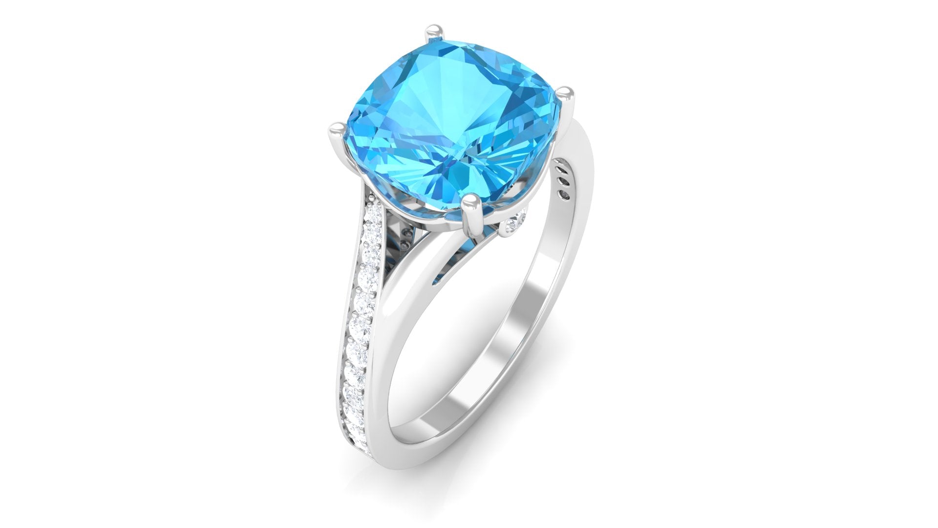 The center-stone of Swiss Blue Topaz here is sparkled up with the encircling of Diamond/Moissanite (that we fondly term ‘Halo’). That makes the Swiss Blue Topaz appear even brighter while highlighting its beauty at its best. Surprisingly, it also gives off the illusion of a bigger Topaz. So, if a Swiss Blue Topaz and Diamond Ring is on your list, this style might turn out to be your best bet.