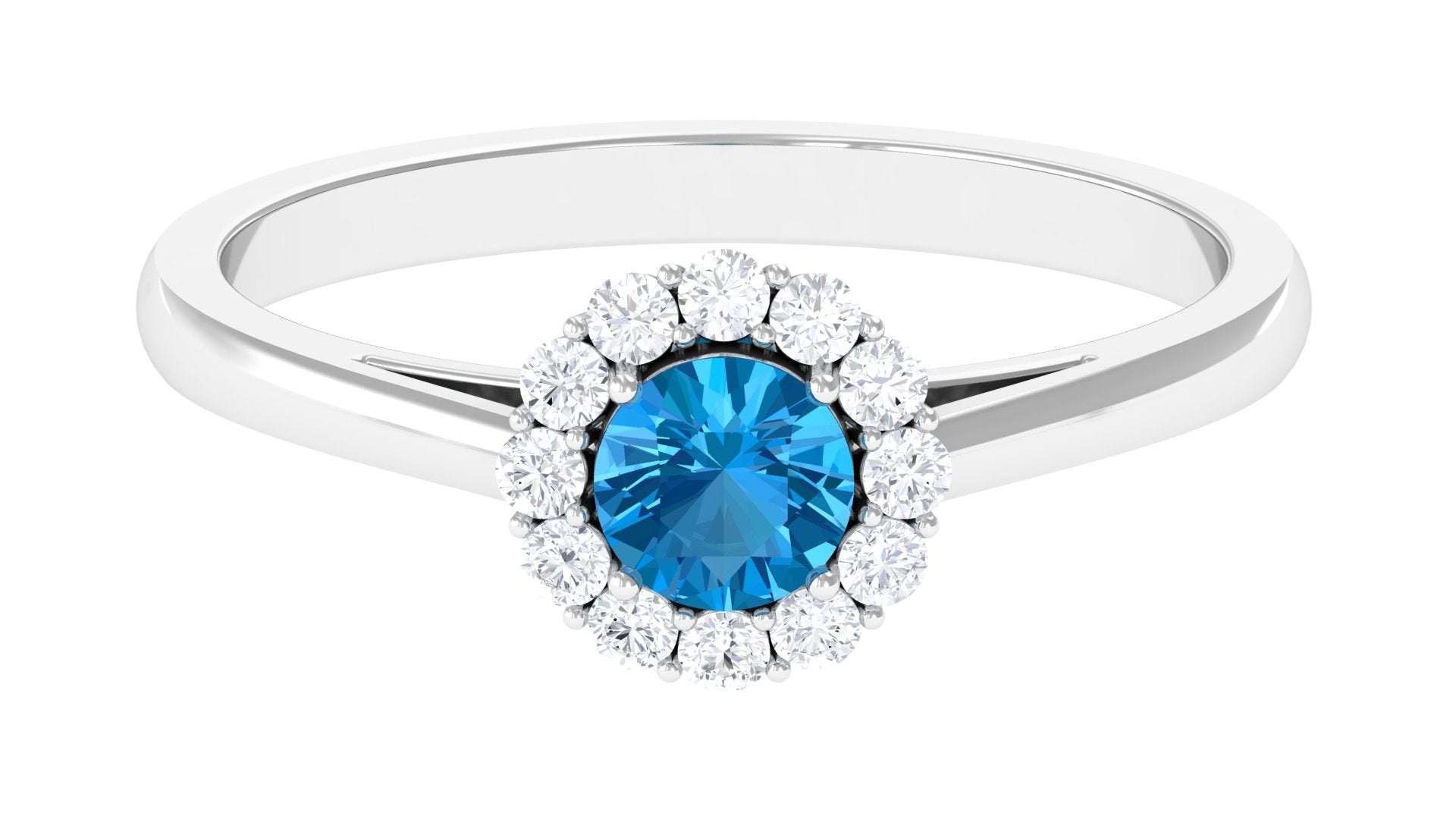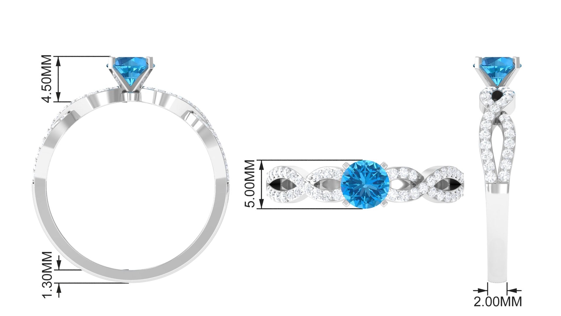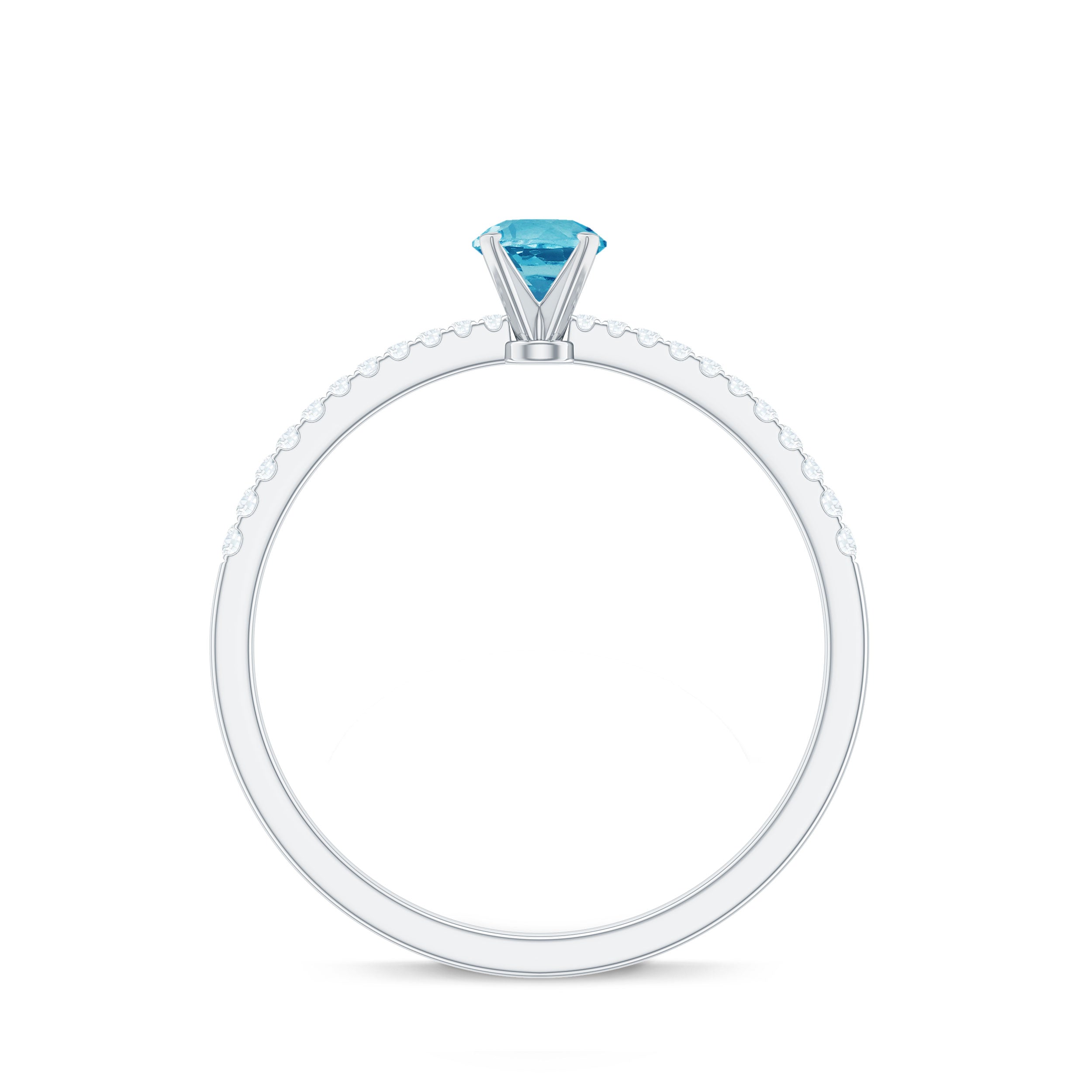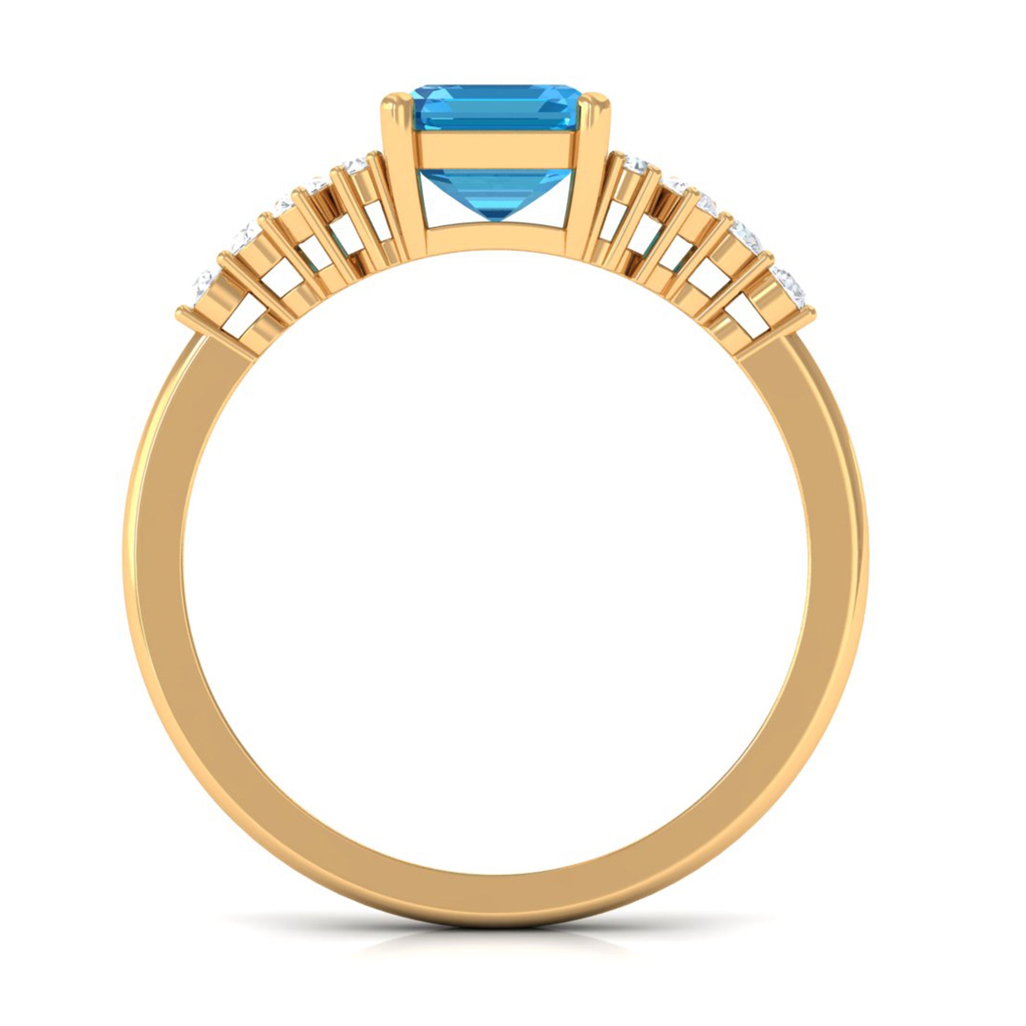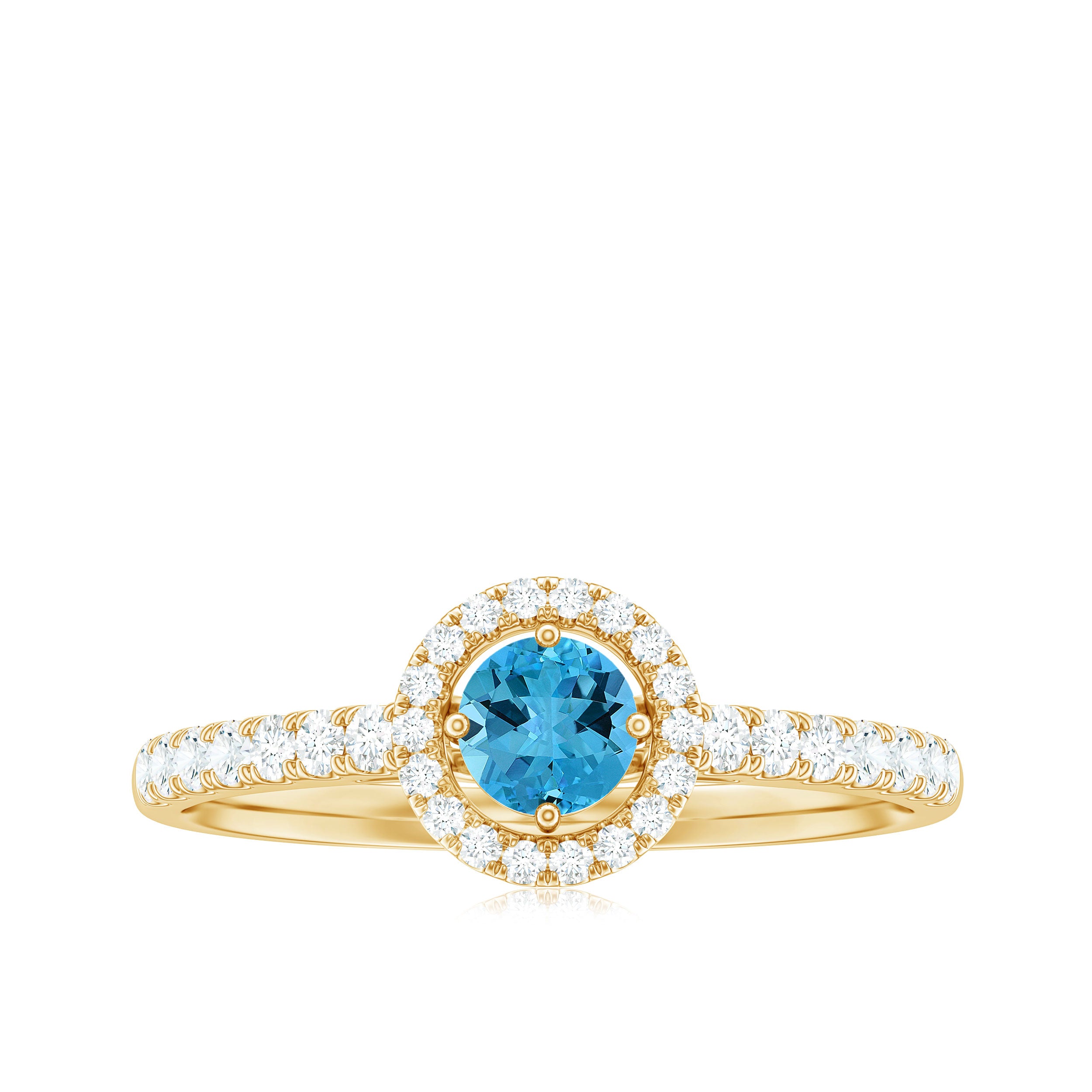 The center-stone of Swiss Blue Topaz here is sparkled up with the encircling of Diamond/Moissanite (that we fondly term ‘Halo’). That makes the Swiss Blue Topaz appear even brighter while highlighting its beauty at its best. Surprisingly, it also gives off the illusion of a bigger Topaz. So, if a Swiss Blue Topaz and Diamond Ring is on your list, this style might turn out to be your best bet.
