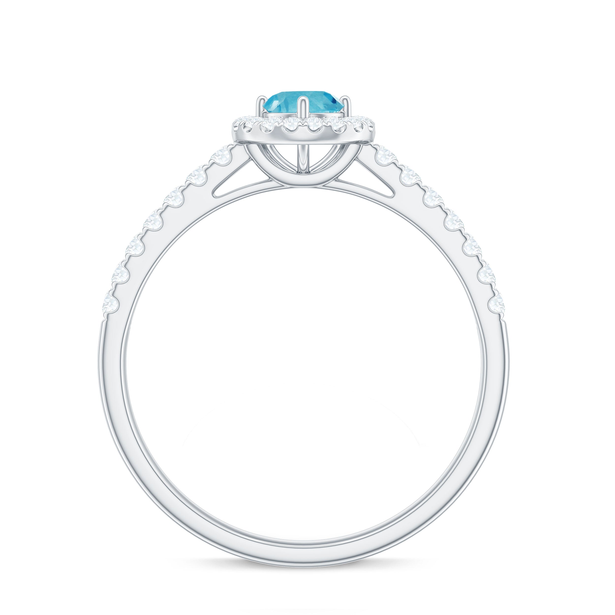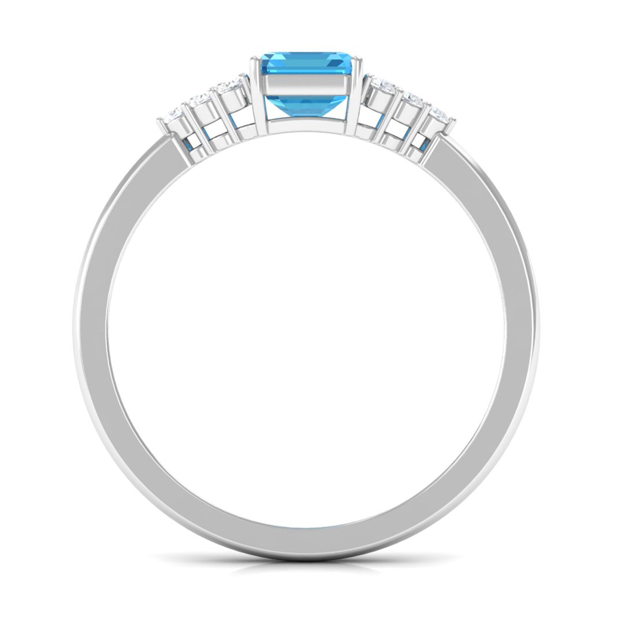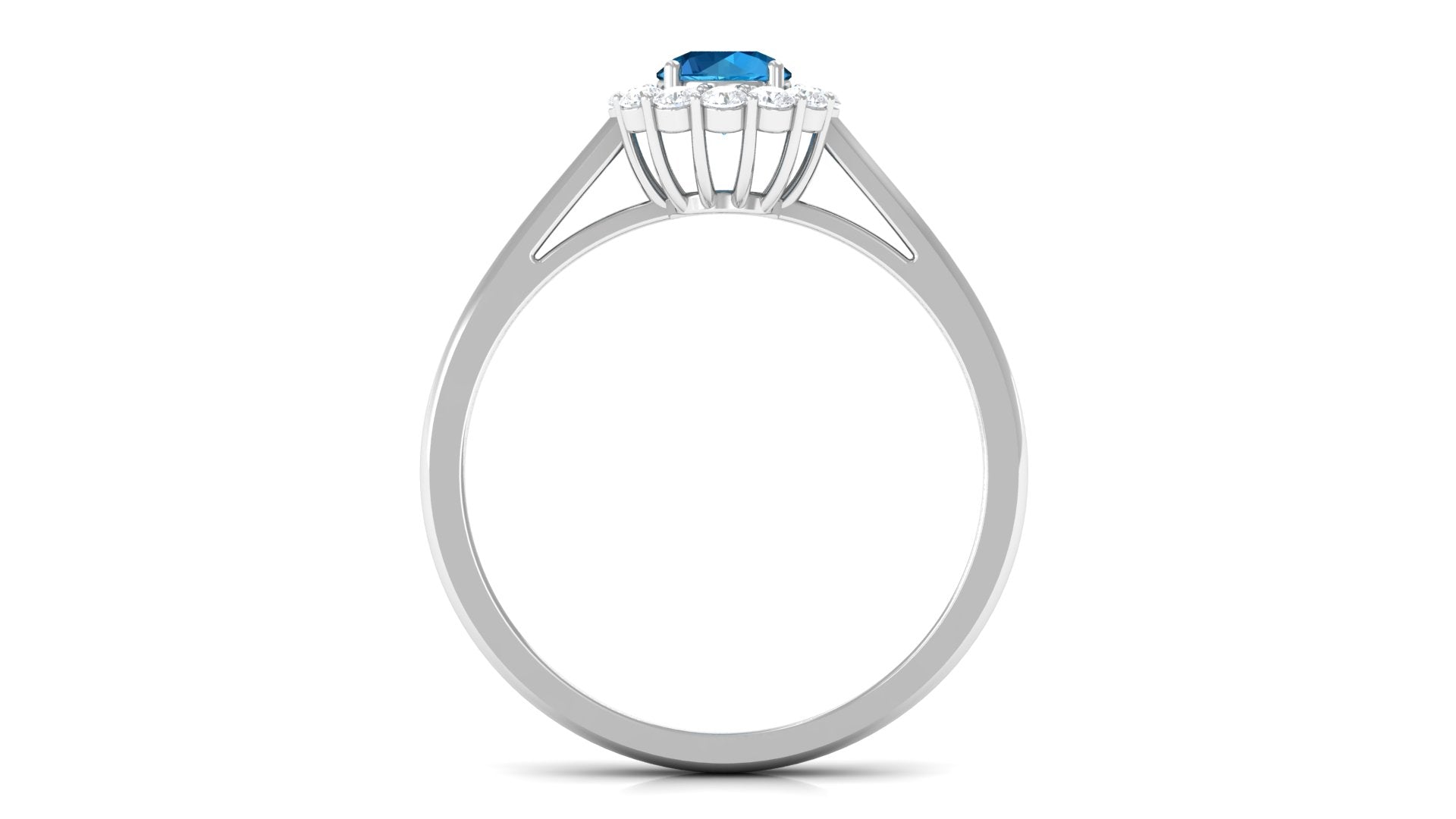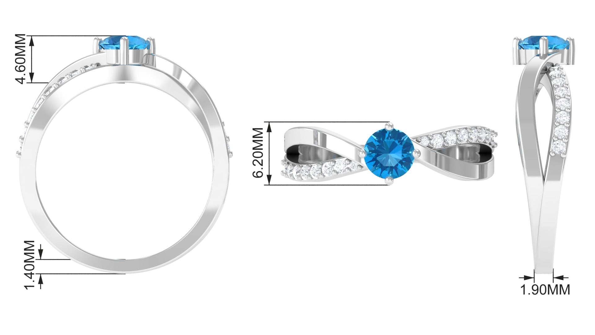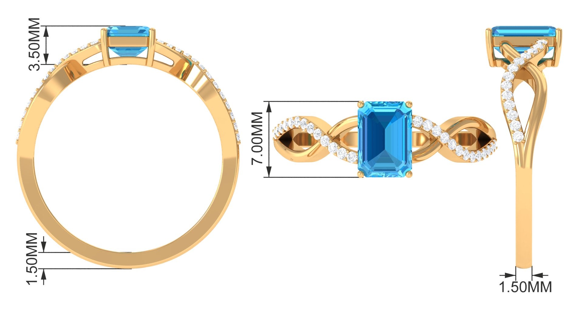 The center-stone of Swiss Blue Topaz here is sparkled up with the encircling of Diamond/Moissanite (that we fondly term ‘Halo’). That makes the Swiss Blue Topaz appear even brighter while highlighting its beauty at its best. Surprisingly, it also gives off the illusion of a bigger Topaz. So, if a Swiss Blue Topaz and Diamond Ring is on your list, this style might turn out to be your best bet.