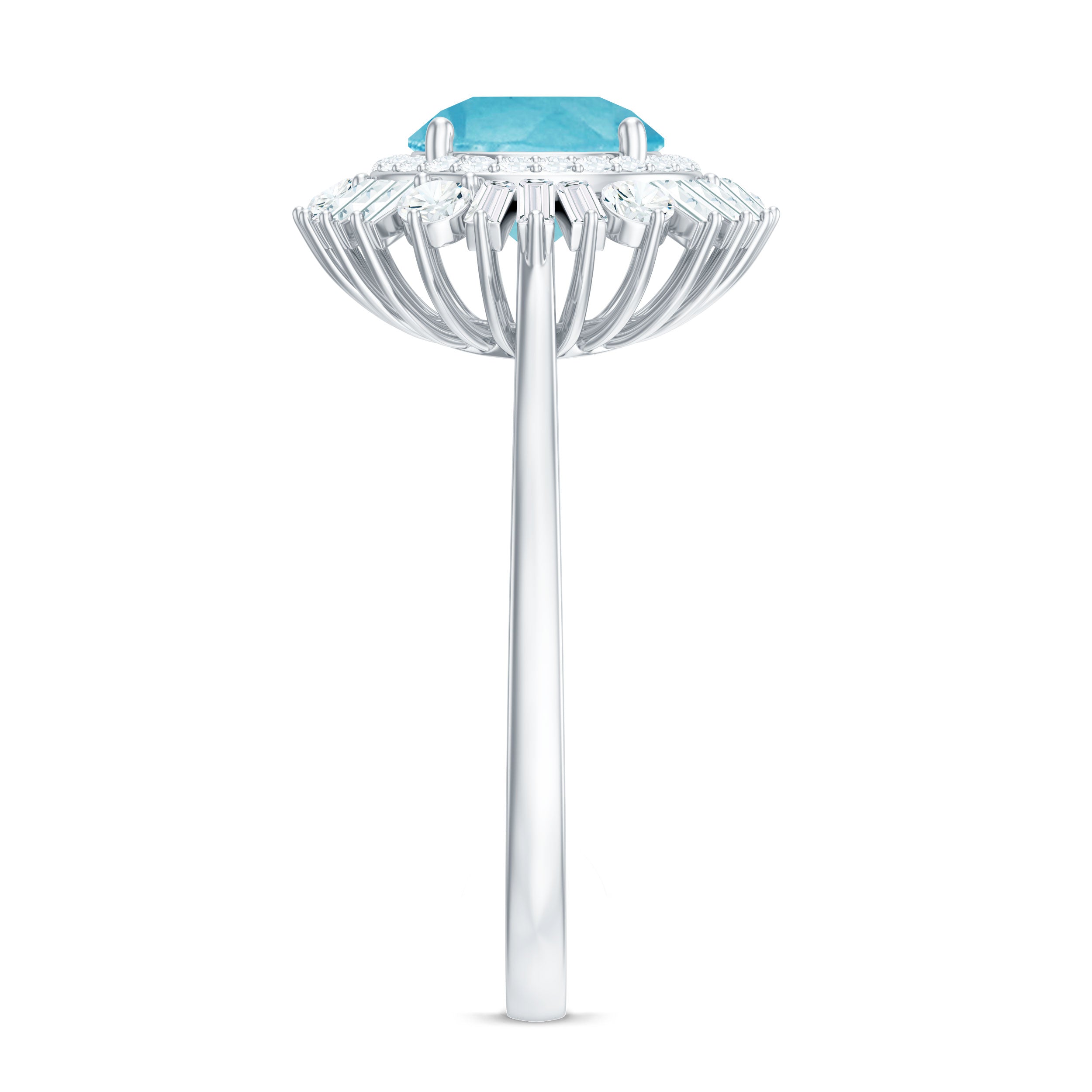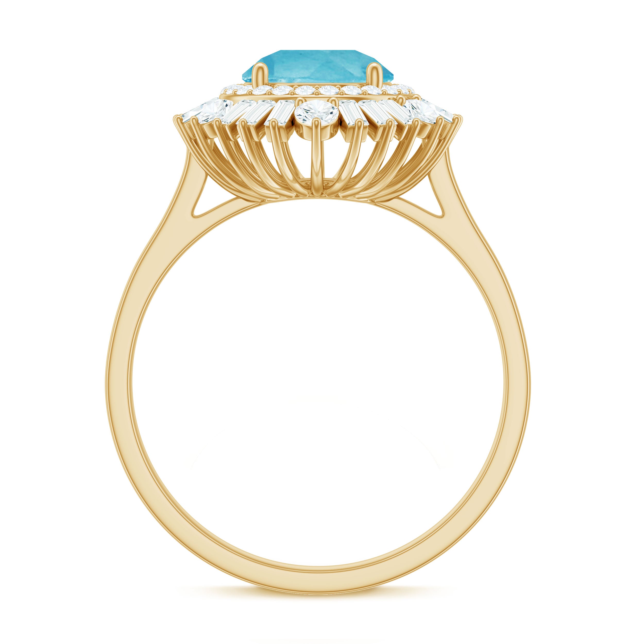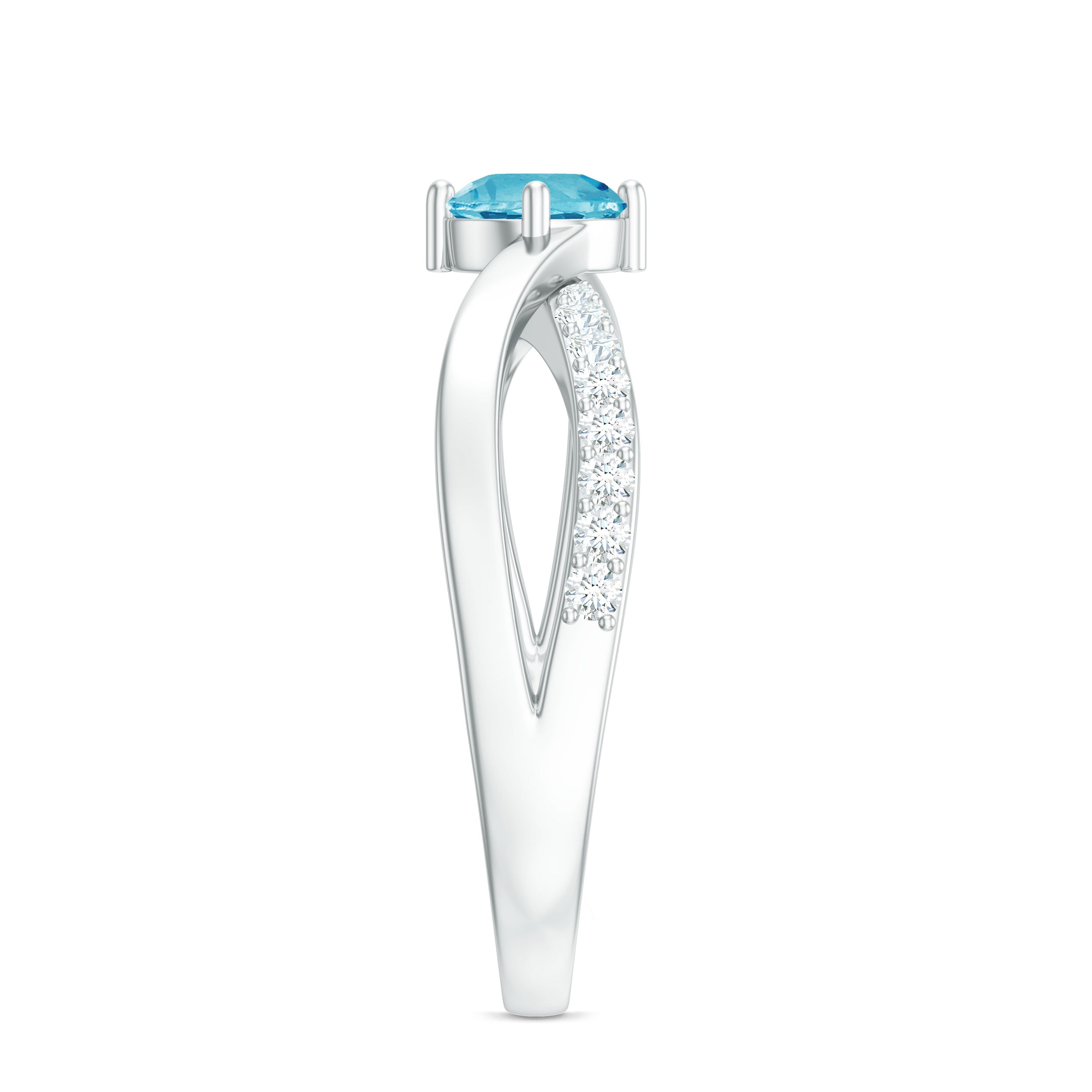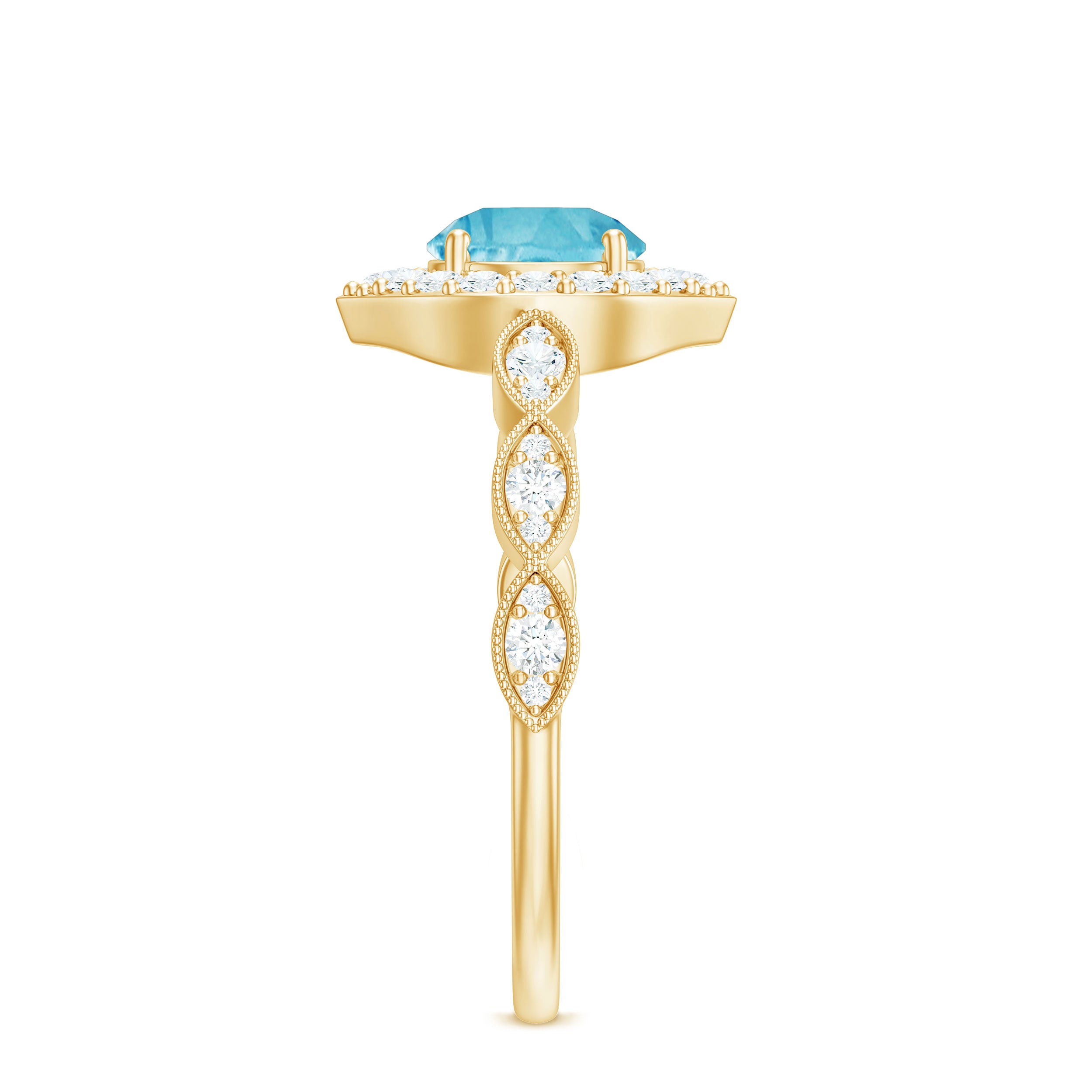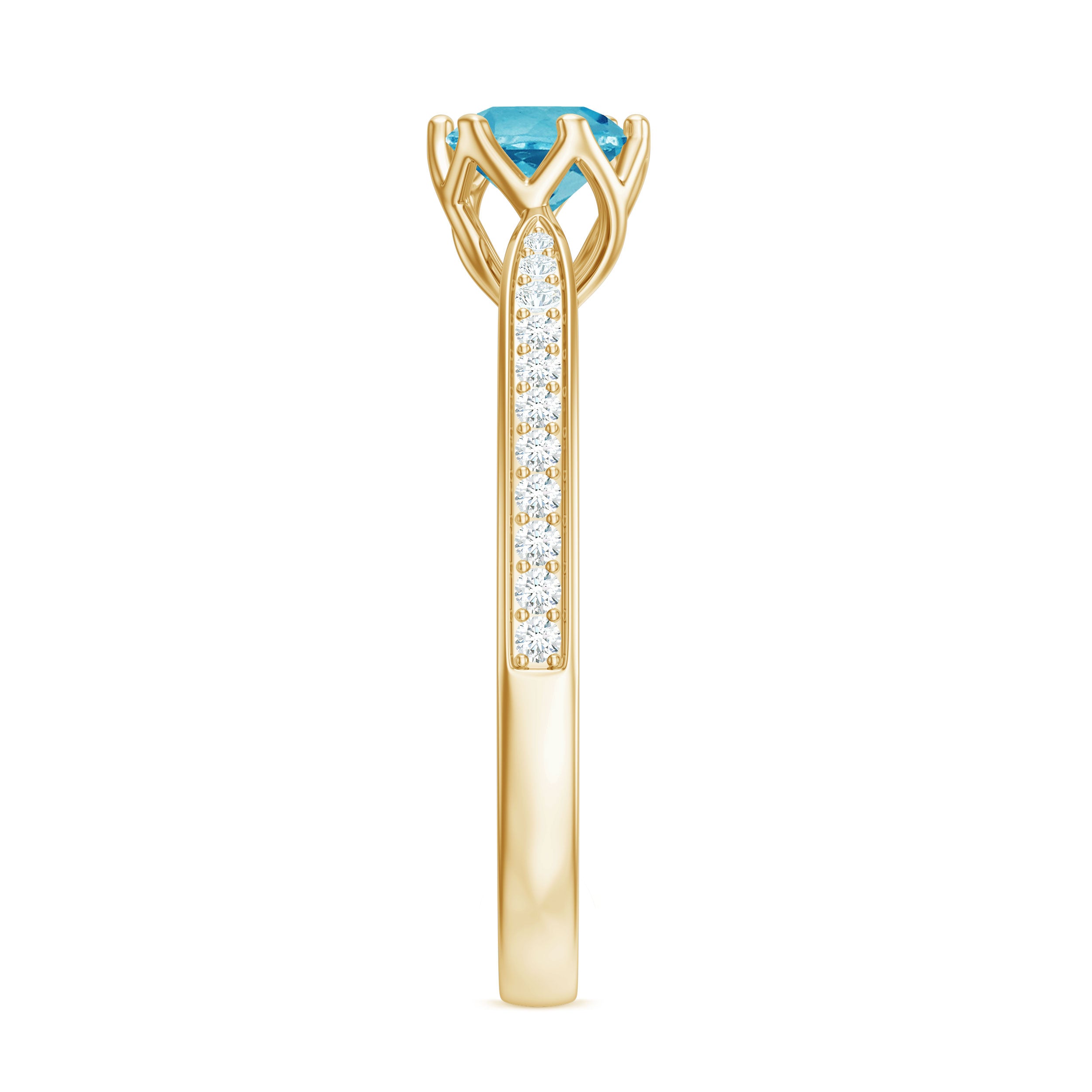 The center-stone of Swiss Blue Topaz here is sparkled up with the encircling of Diamond/Moissanite (that we fondly term ‘Halo’). That makes the Swiss Blue Topaz appear even brighter while highlighting its beauty at its best. Surprisingly, it also gives off the illusion of a bigger Topaz. So, if a Swiss Blue Topaz and Diamond Ring is on your list, this style might turn out to be your best bet.