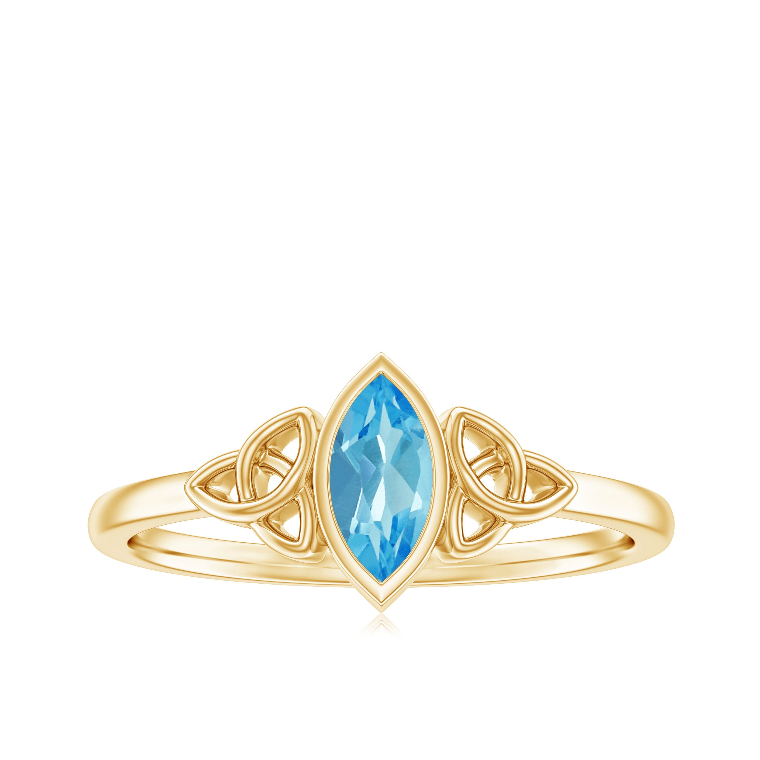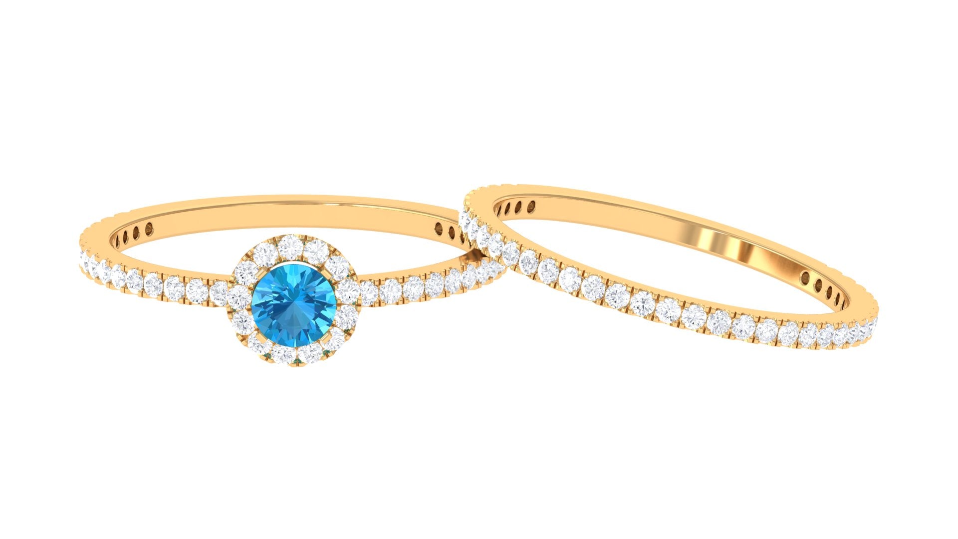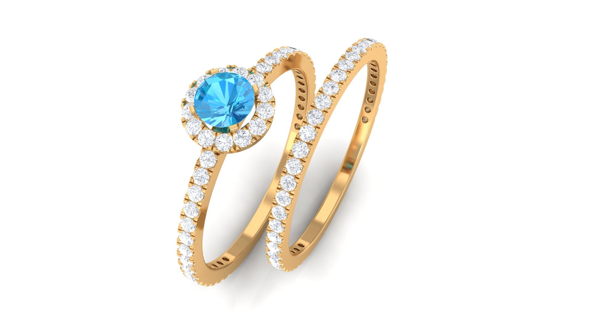 This Wedding Ring is bejeweled by Swiss Blue Topaz all over the band. It could be a classic band that is meant to fit with your Swiss Blue Topaz Engagement Ring or be more ornate by featuring a floating halo, old-world designs, or even a triple-row band. Thanks to its conventional aesthetics, a Yellow Gold Swiss Blue Topaz Ring is considered most appealing in this category. Symbolically, it commemorates the lifelong union of two souls as one and is thus, exchanged along with the wedding vows.