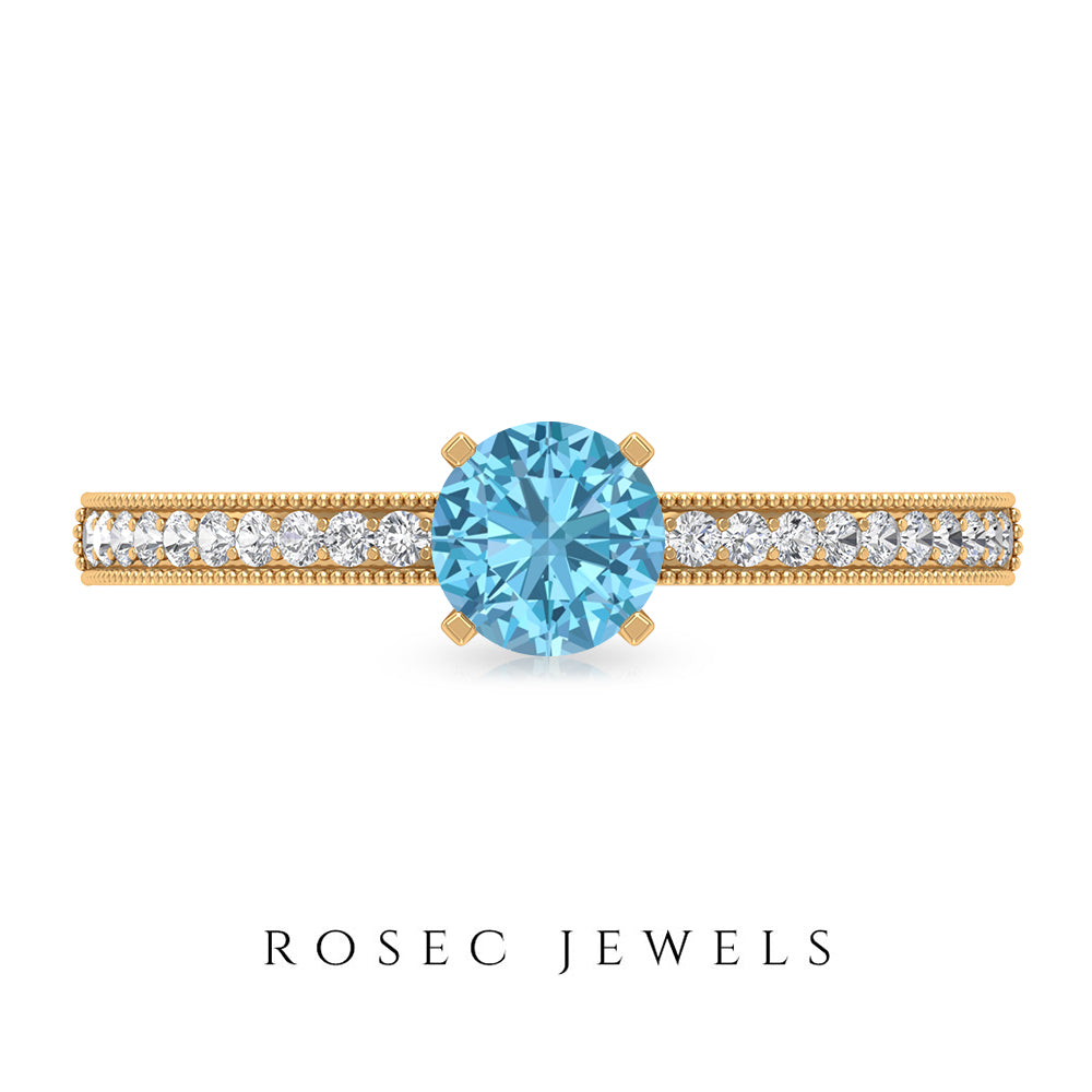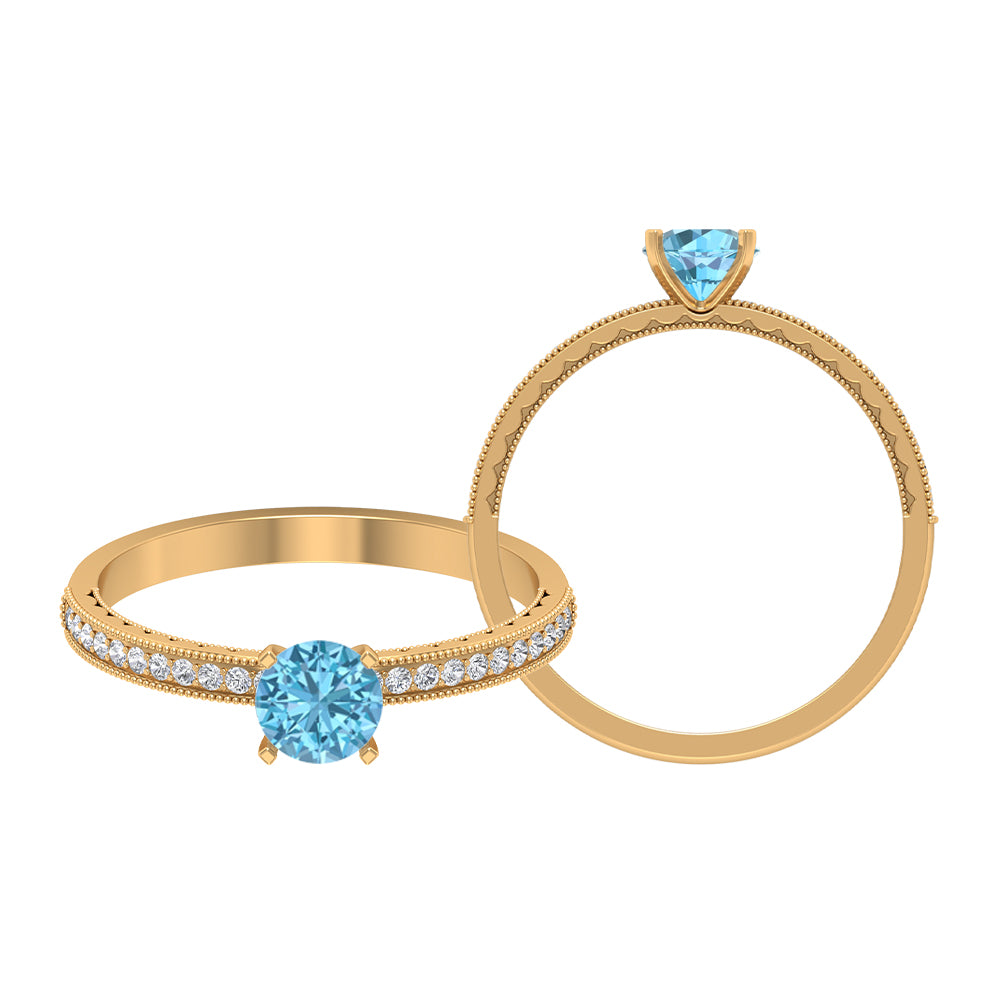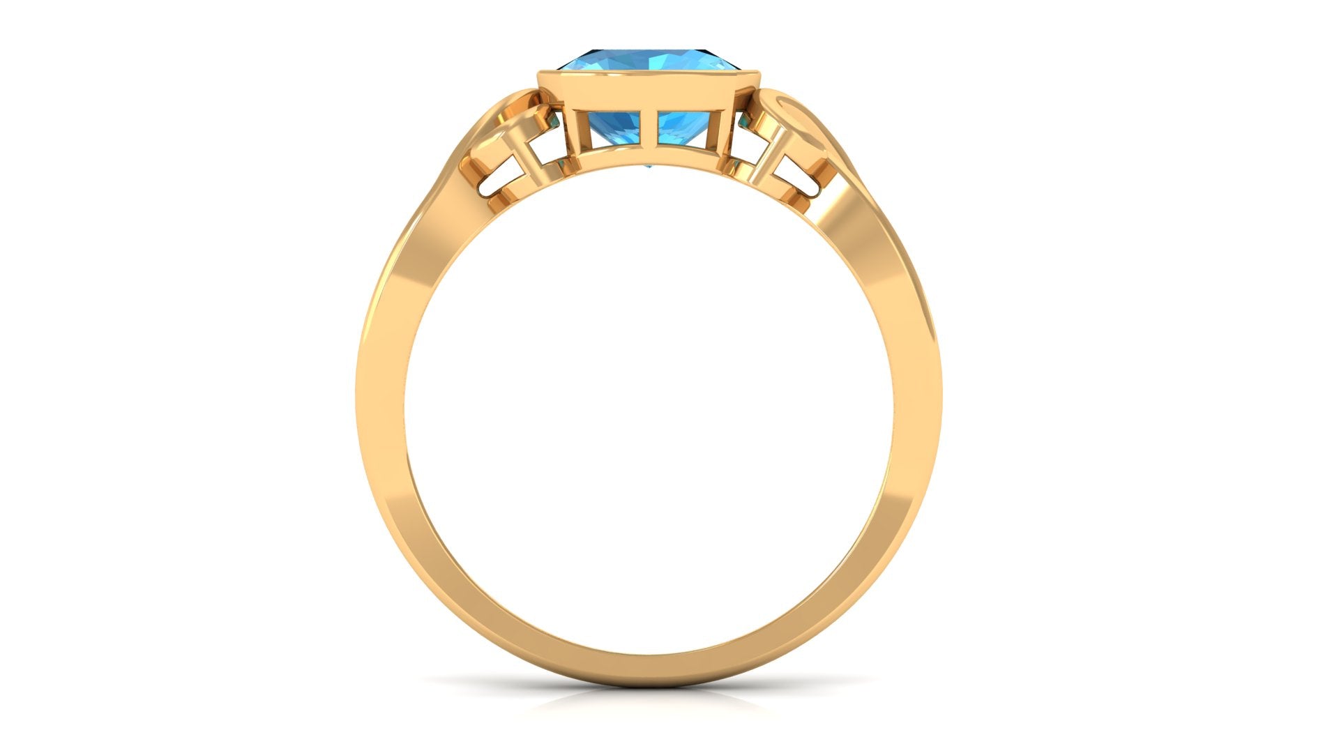 Highly prized as one of the most conventional Swiss Blue Topaz Engagement Rings out there, it is characterized by a Single Centerpiece of Swiss Blue Topaz of any shape. Technically, the Swiss Blue Topaz here appears much more flashy than any other ring style (with a stone size of 6 MM or more). It could range from an understated Round Cut Swiss Blue Topaz Ring to fancier ones such as those fashioned in Marquise, Princess, and Pear Cut. Or if you fancy a little old-school touch, an Asscher or Emerald Cut Swiss Blue Topaz Ring might be the one.