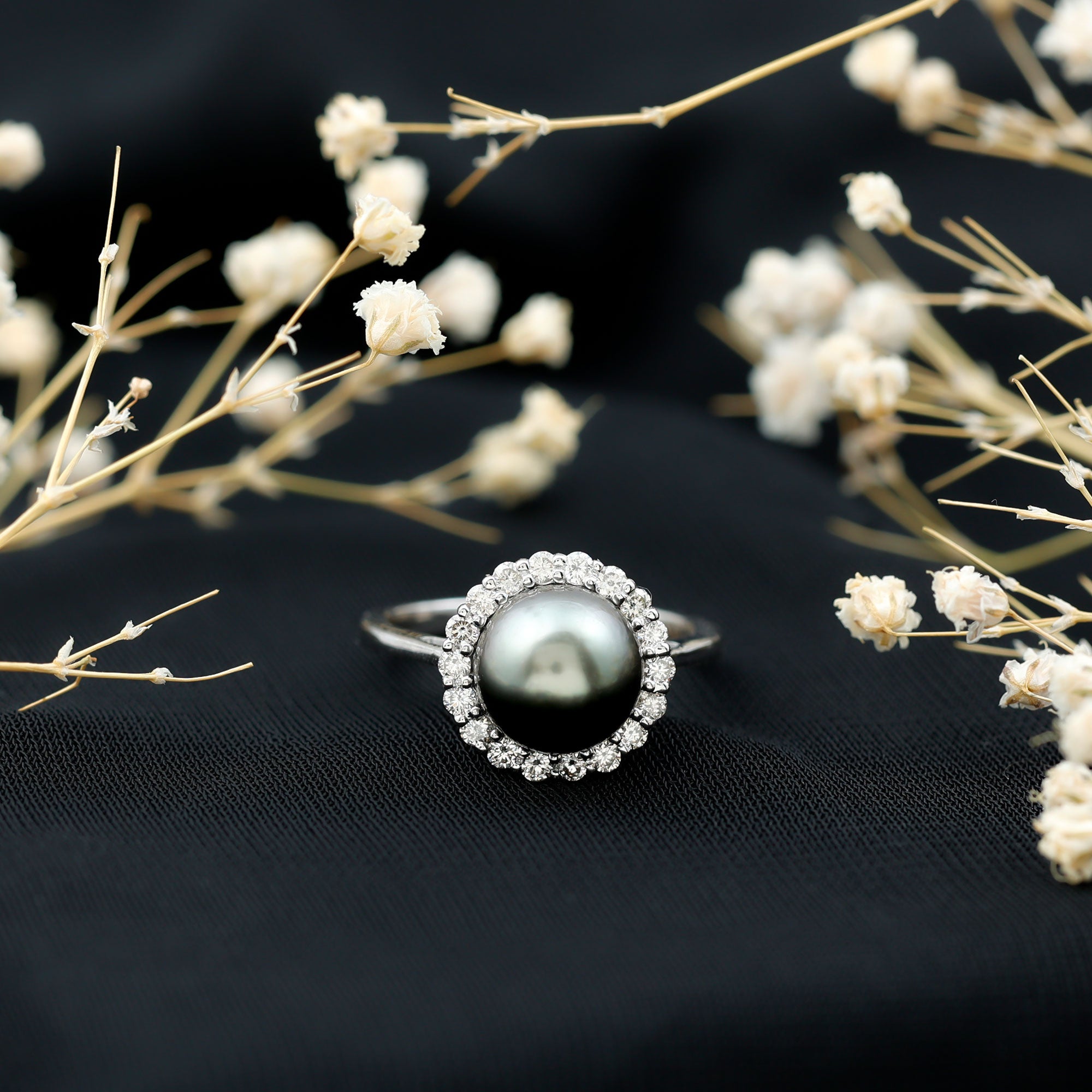 Halo Tahitian Pearl Rings: - featuring center pearl, accentuating the style of ring ring. Encircled by small shimmery diamonds or moissanite in the halo. These captivating rings seamlessly marry the sophisticated charm of black pearls with the mesmerizing brilliance of diamond accent making a timeless beauty and a must-have piece of ring.