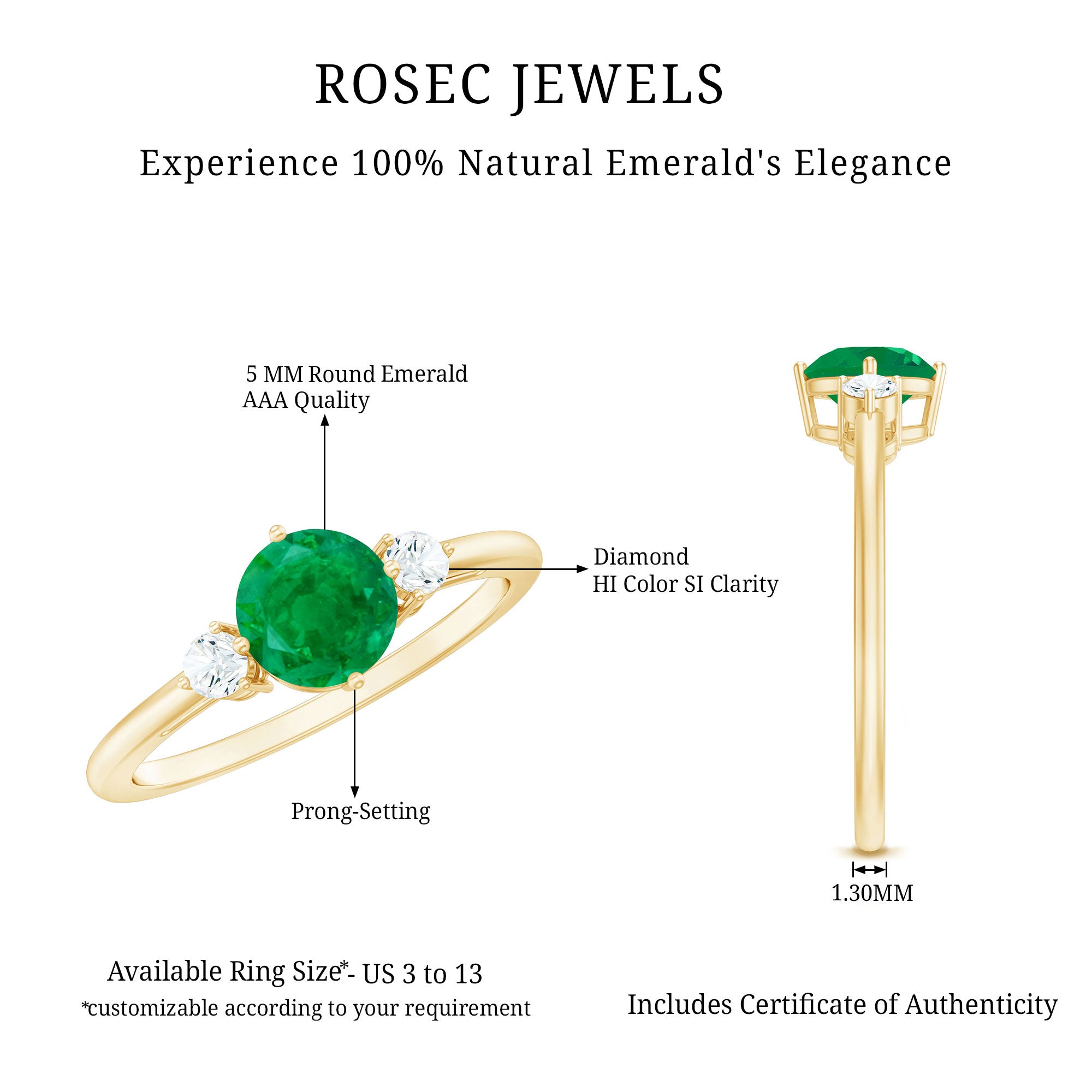 Genuine and Pure: Rosec Jewels proudly offers authentic Three Stone Engagement Rings crafted from real gold and silver. Each ring comes with a certificate to guarantee its authenticity, ensuring you experience the genuine and captivating beauty of an authentic three stone engagement ring.