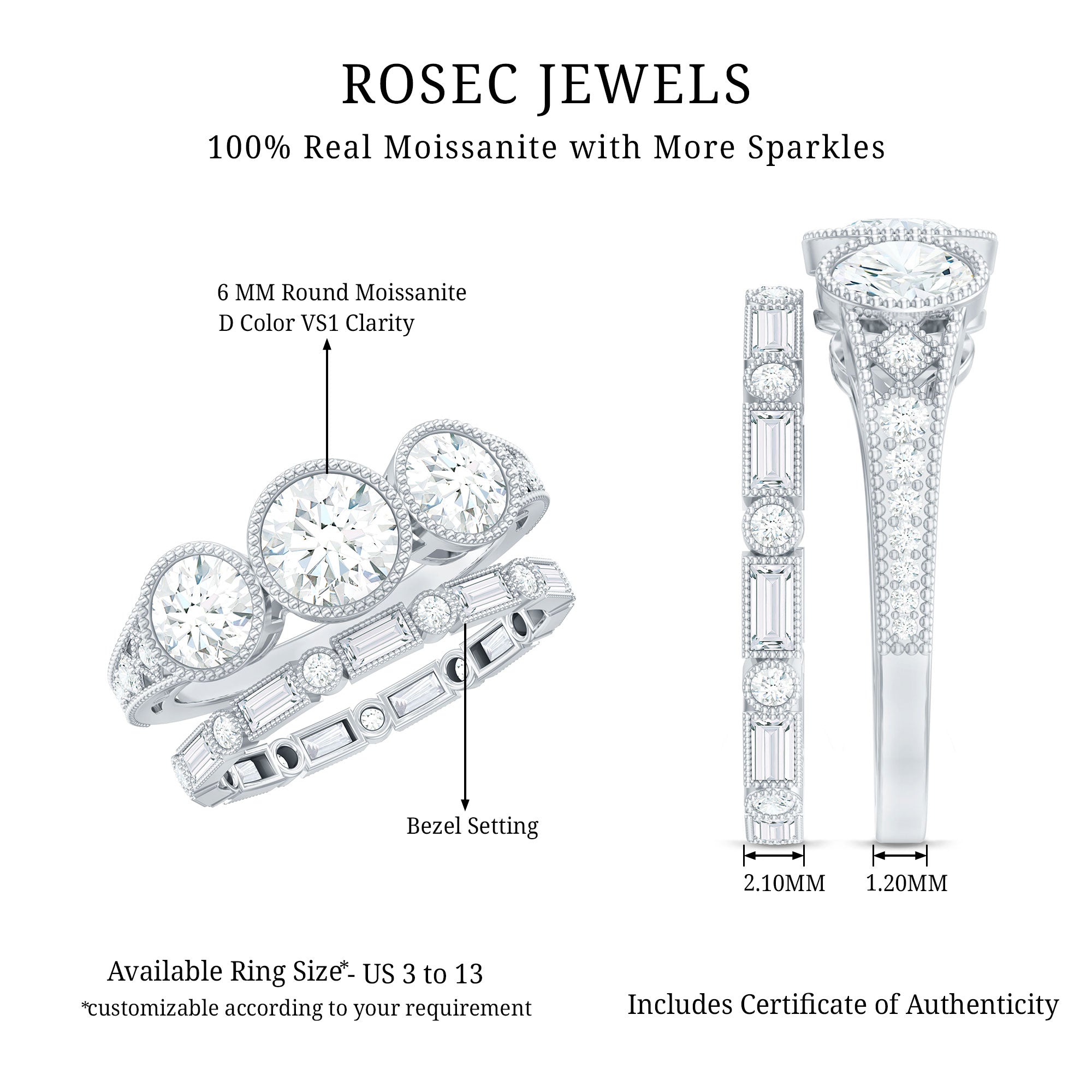 Genuine and Pure: Rosec Jewels proudly offers authentic Three Stone Engagement Rings crafted from real gold and silver. Each ring comes with a certificate to guarantee its authenticity, ensuring you experience the genuine and captivating beauty of an authentic three stone engagement ring.