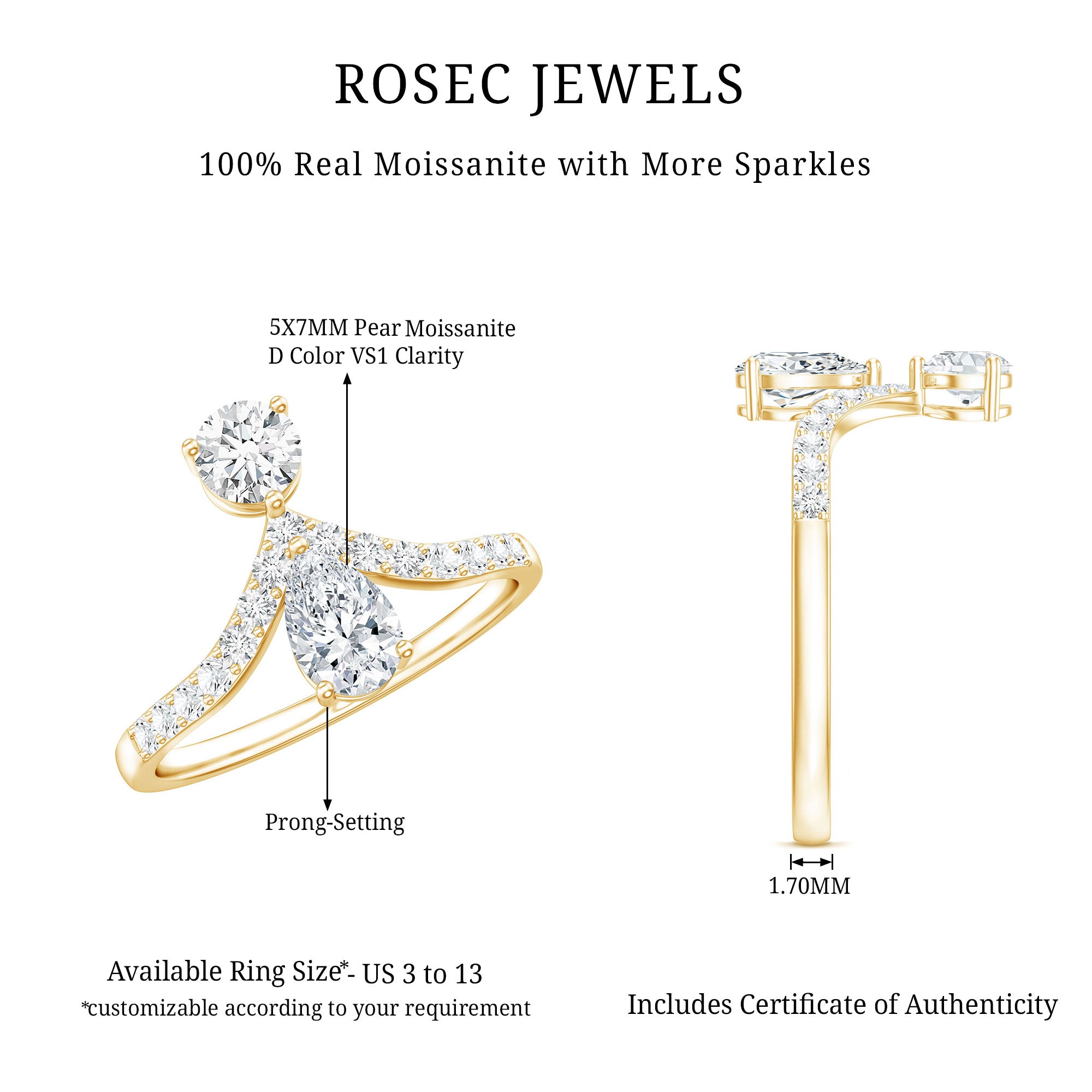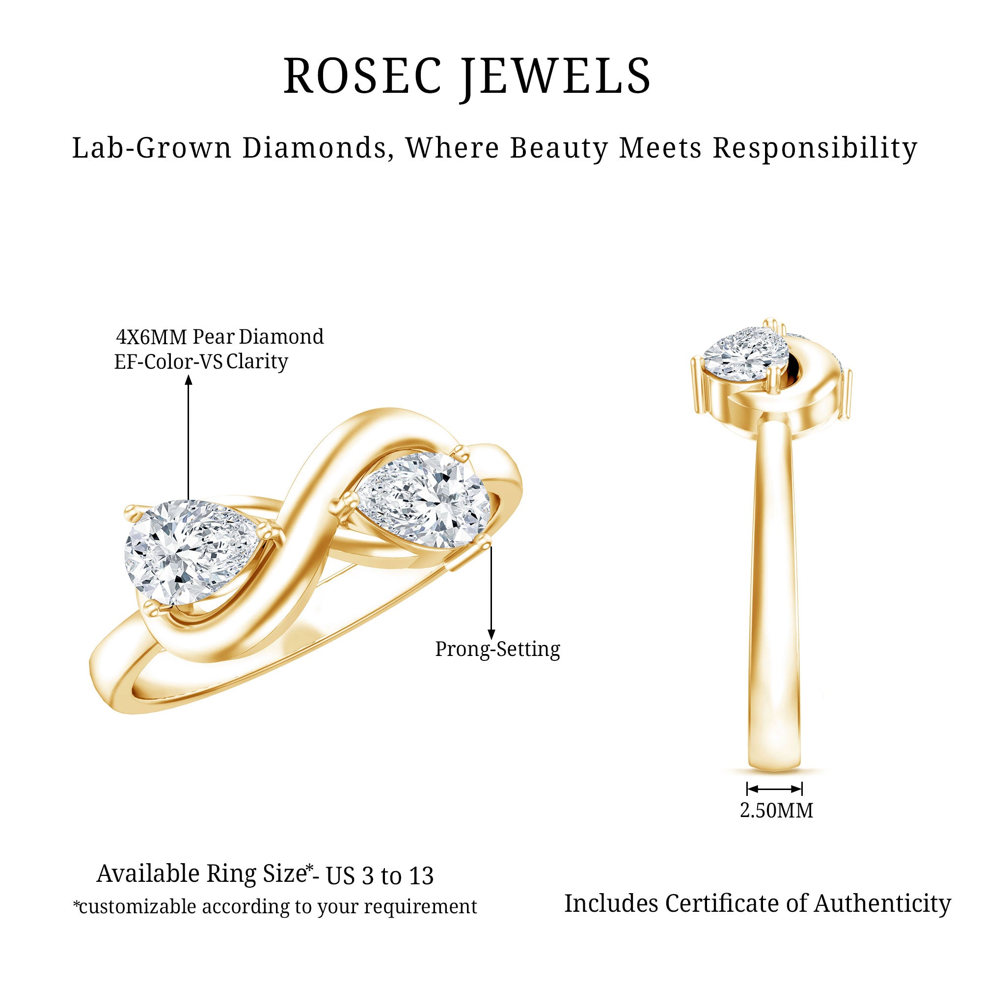 Your stone choice sets the tone of the ring. Diamond + diamond reads timeless and bridal.Diamond + lab-grown diamond is a modern way to keep a high-sparkle look with a value-focused approach.Diamond + gemstone adds personality and symbolism—ideal for shoppers who want a ring that feels truly “theirs.”When mixing stones, aim for visual harmony (similar brightness) and a pairing that doesn’t feel random.
