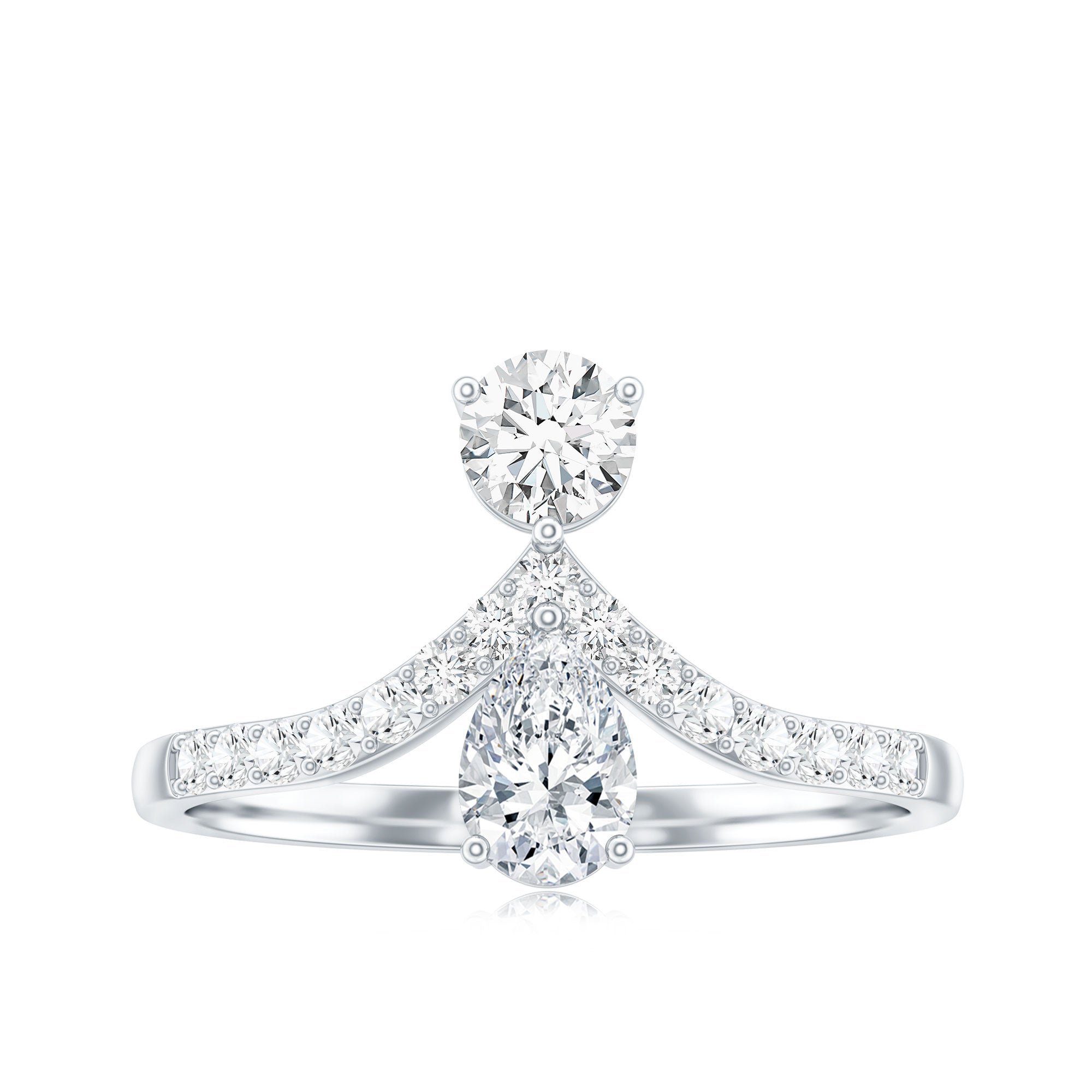 A high-contrast “soft + structured” look. The pear adds romance and motion; the emerald cut adds clean geometry.