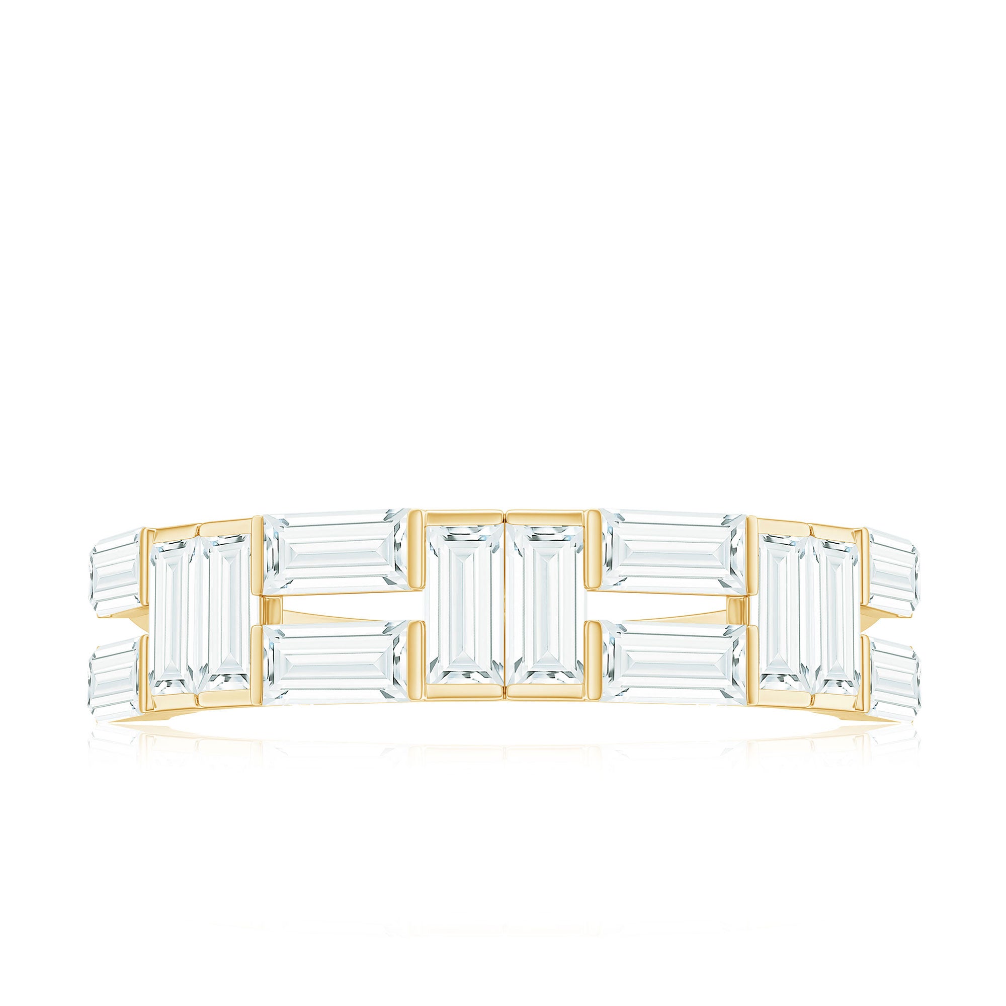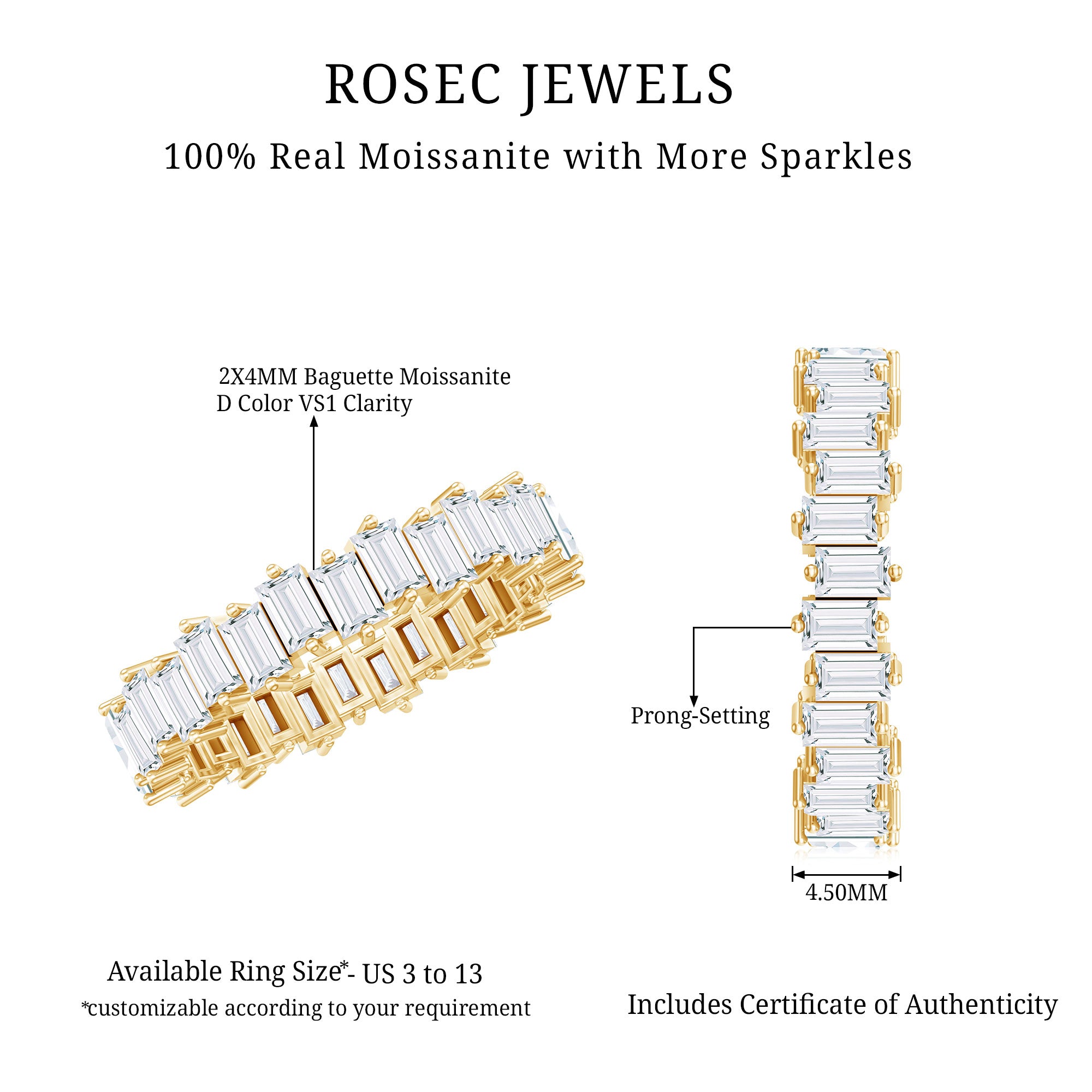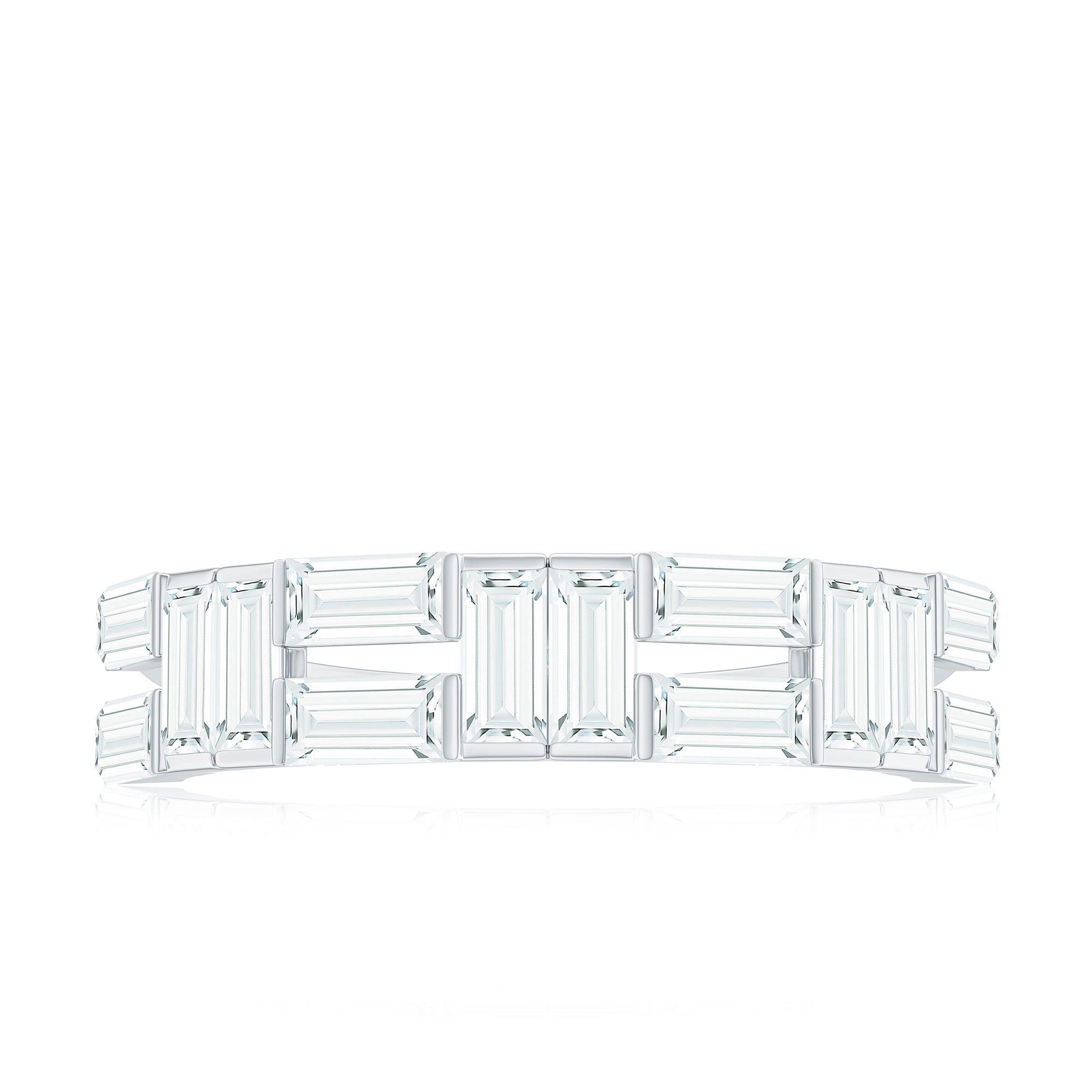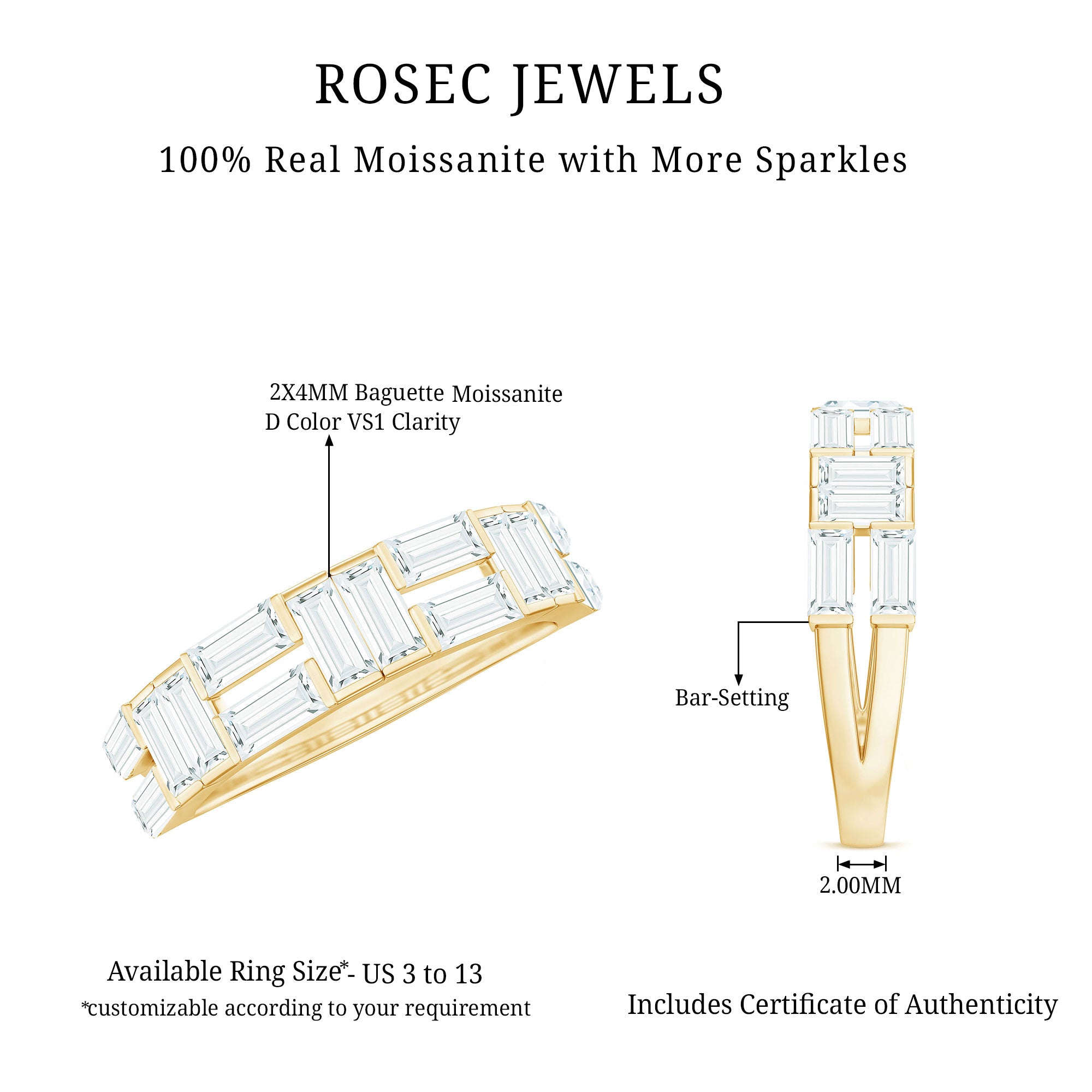 Baguette Wedding Rings: Baguette wedding bands are known for their larger gemstone illusion, vintage glam, and distinctive yet understated elegance. Tilted baguette sapphires, straight baguette moissanites, or any other colored or sparkling gemstone wedding bands can add a touch of sparkle to your engagement ring.