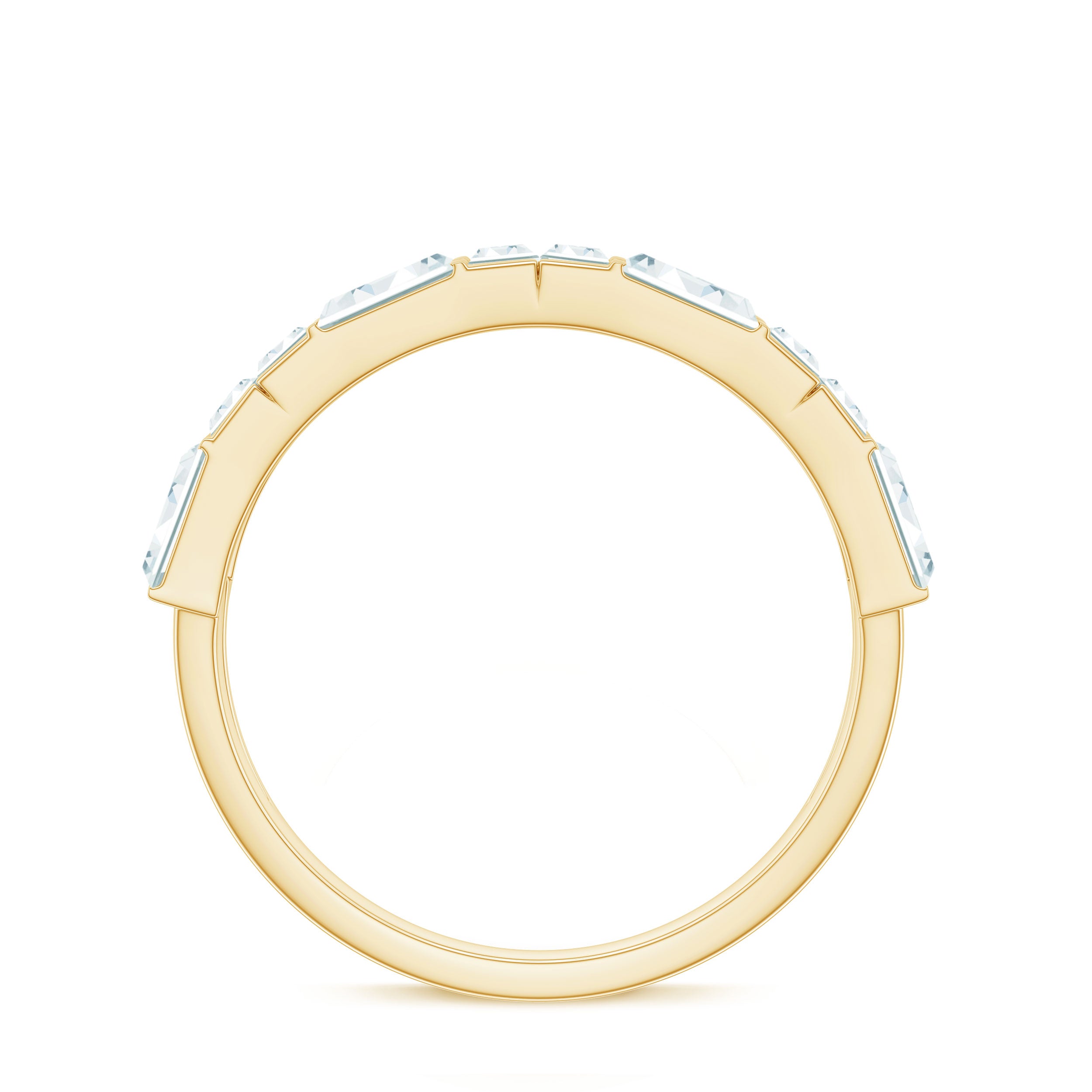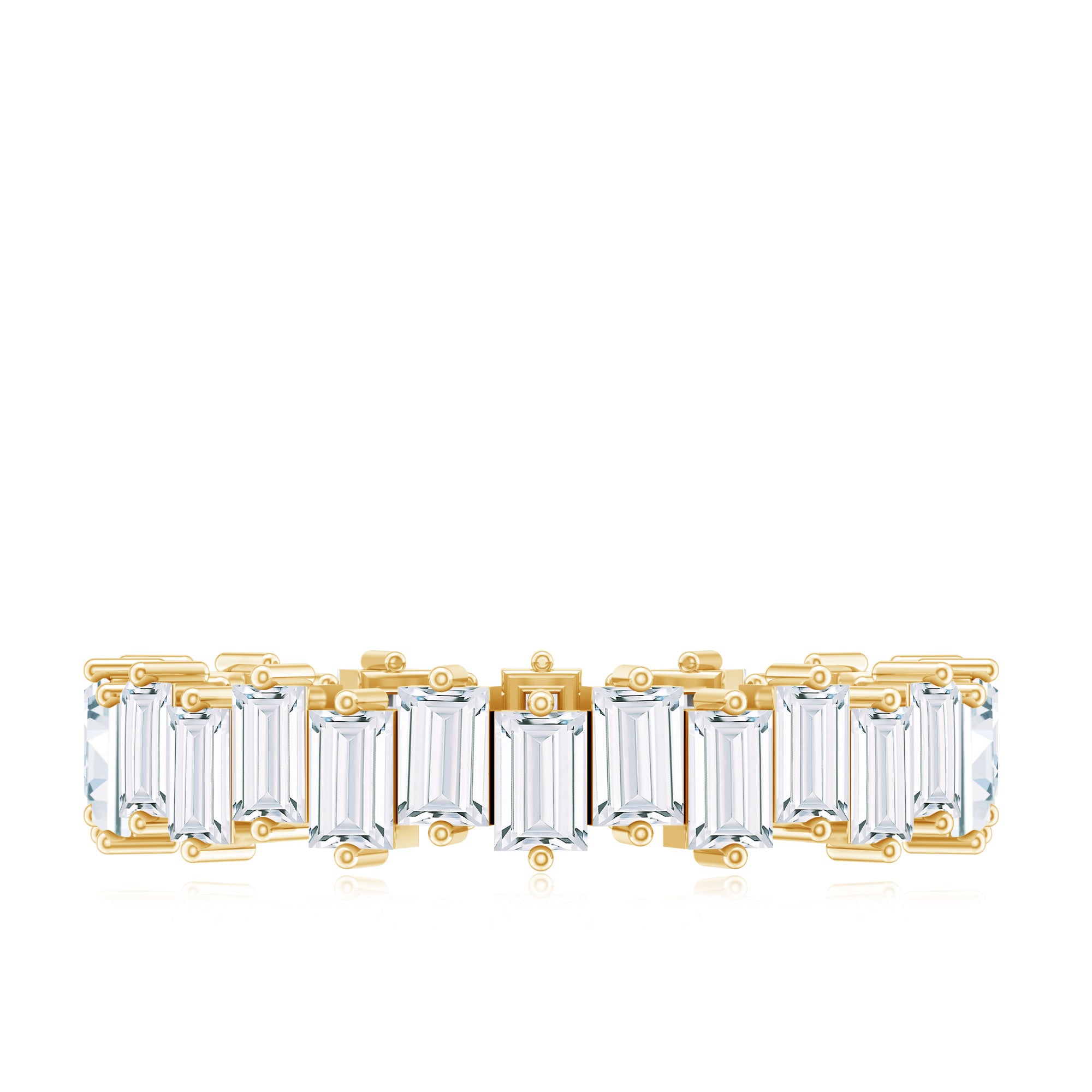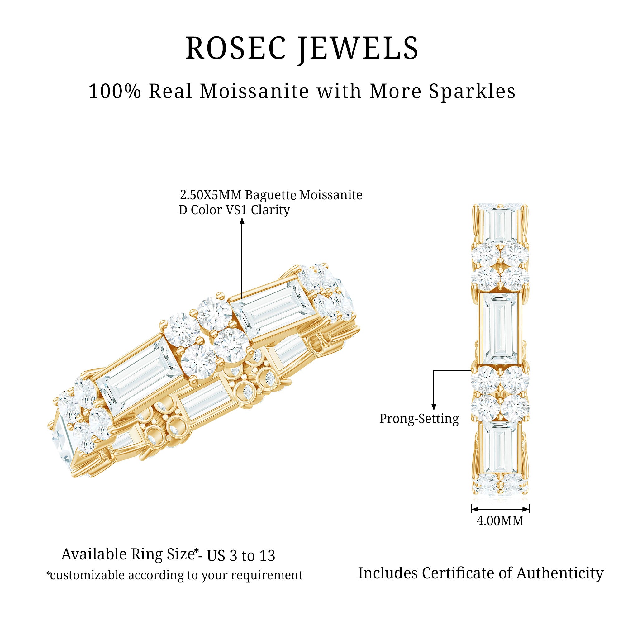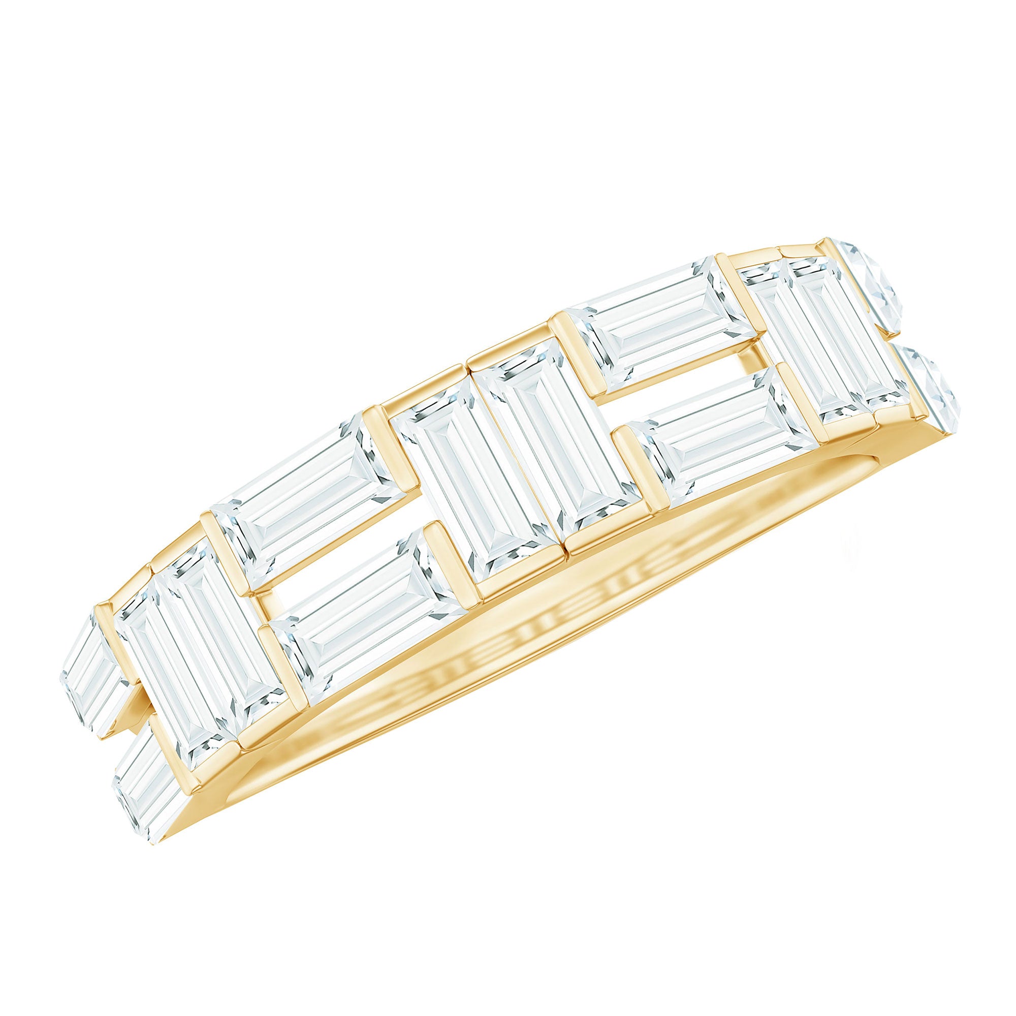 Baguette Wedding Rings: Baguette wedding bands are known for their larger gemstone illusion, vintage glam, and distinctive yet understated elegance. Tilted baguette sapphires, straight baguette moissanites, or any other colored or sparkling gemstone wedding bands can add a touch of sparkle to your engagement ring.