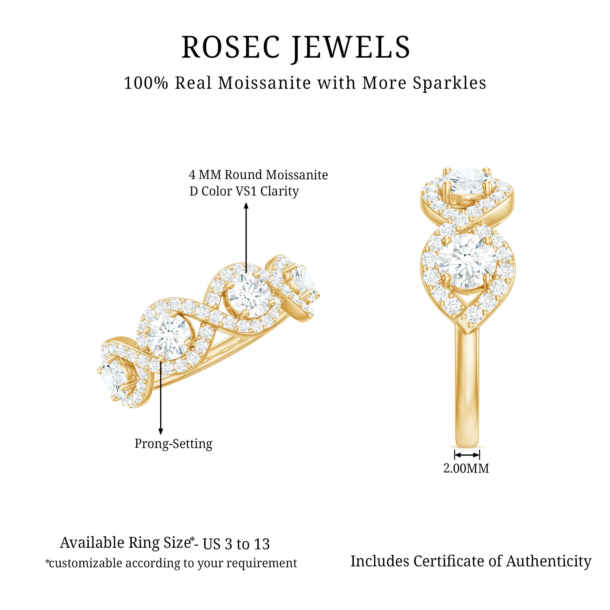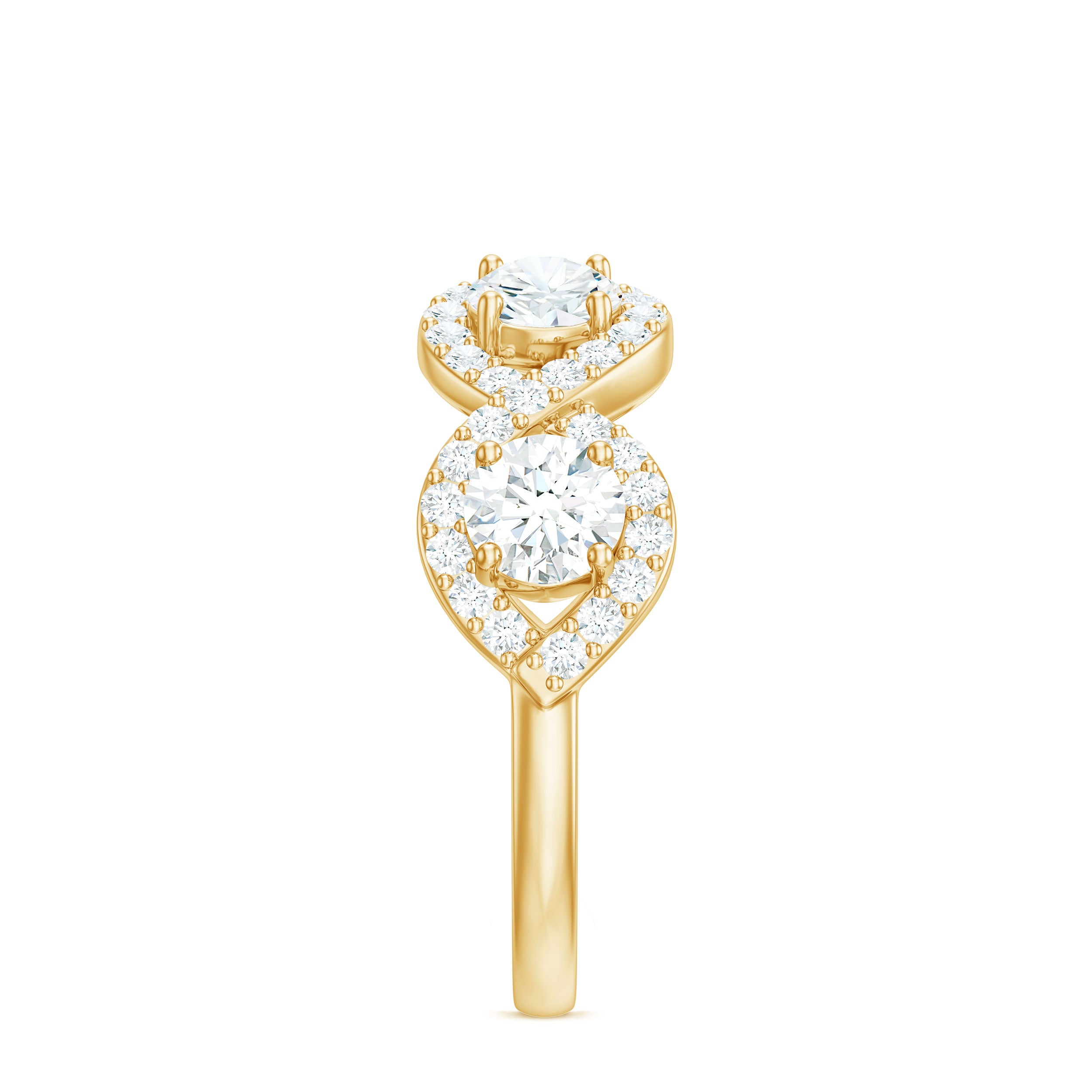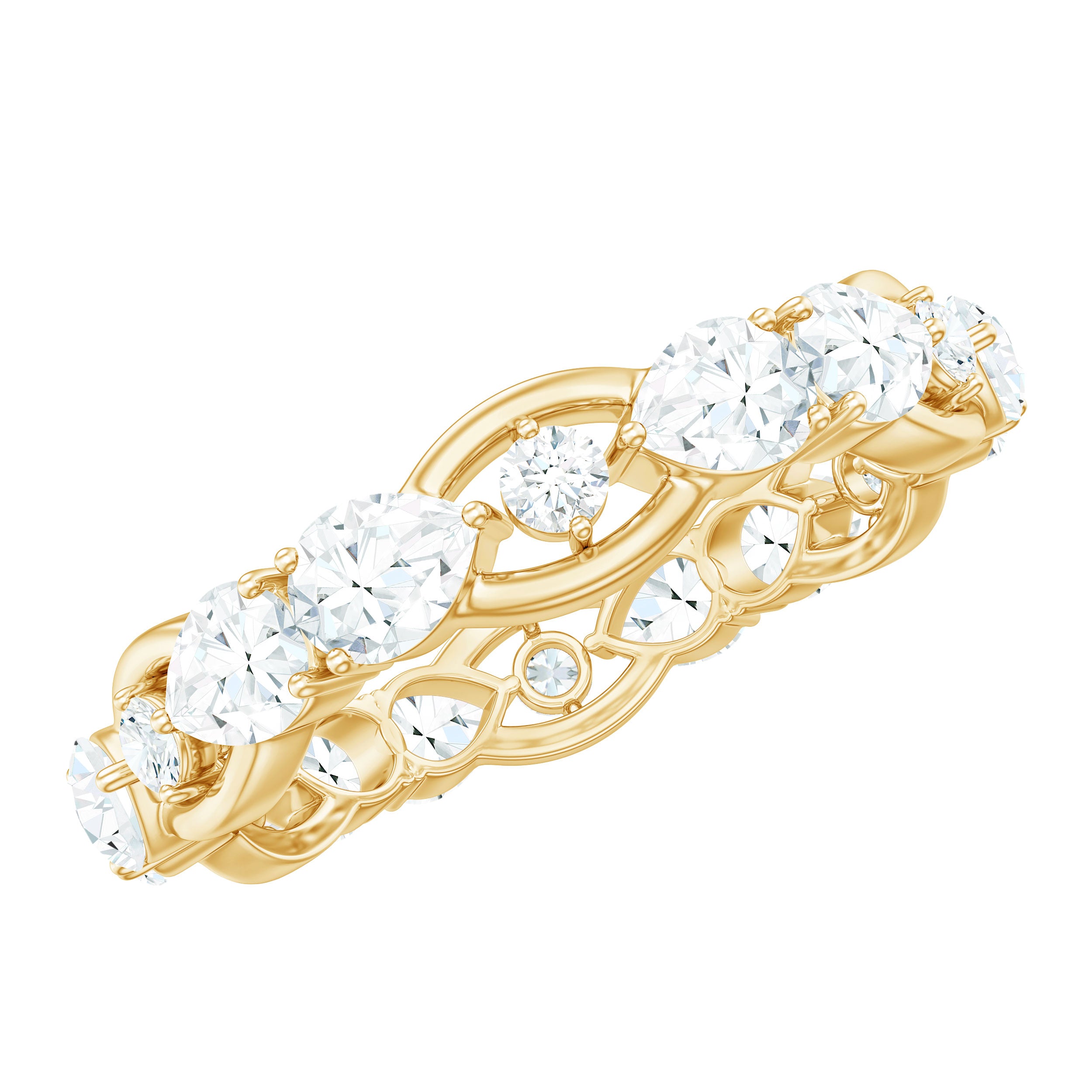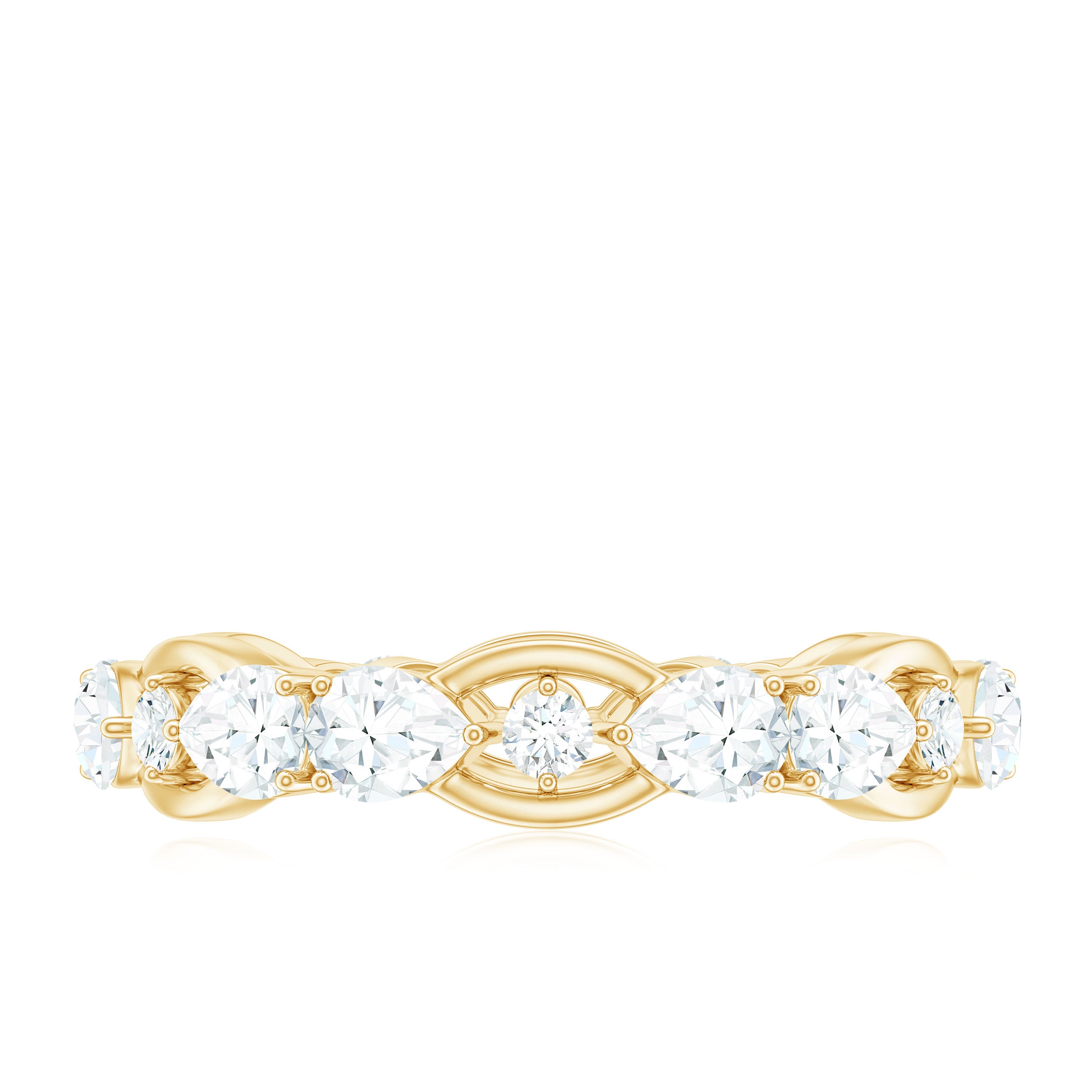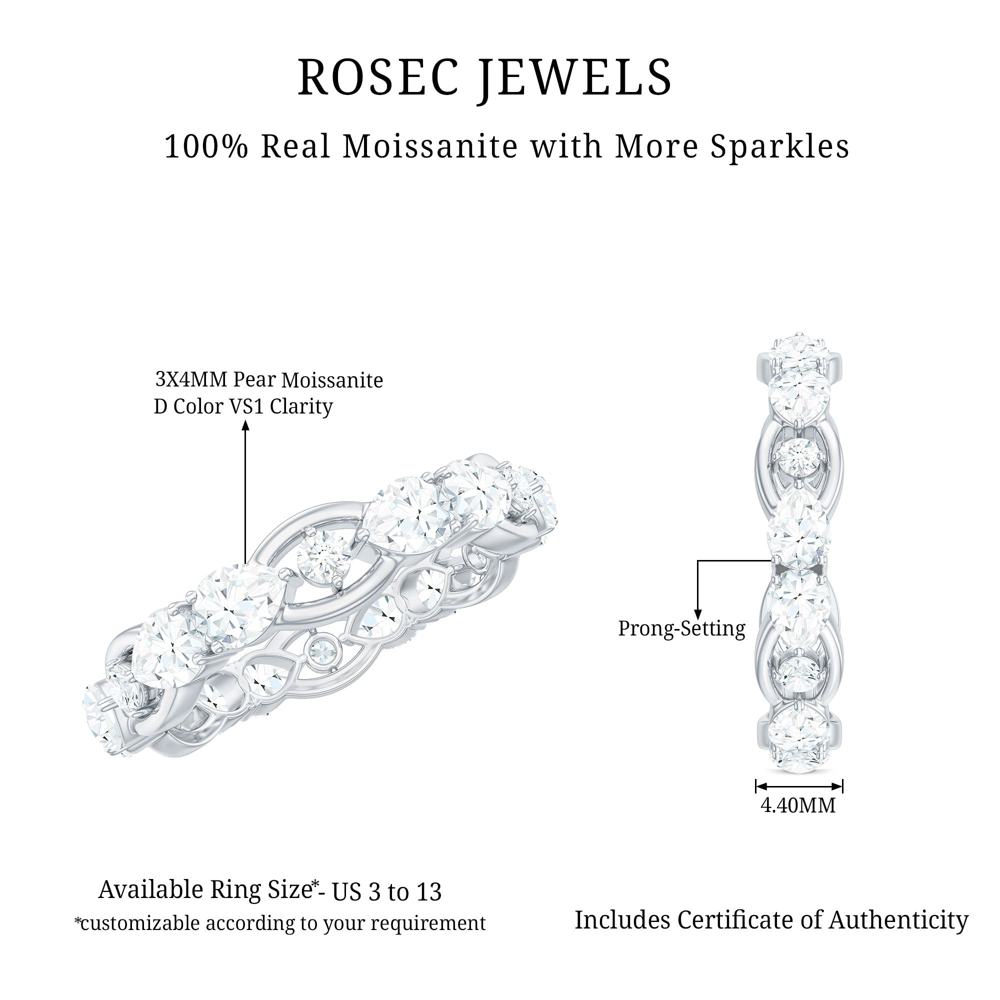 Pear Shaped Rings for Wedding Bands: Pear or teardrop wedding rings feature a gemstone with rounded ends and pointed tip. Pear gemstone with a flattering silhouette, elongates the finger, and showcases the gem’s color transitions very well. Crafted side by side or accented with other traditional cuts, pear moissanite wedding rings present classic designs with a stylish touch.