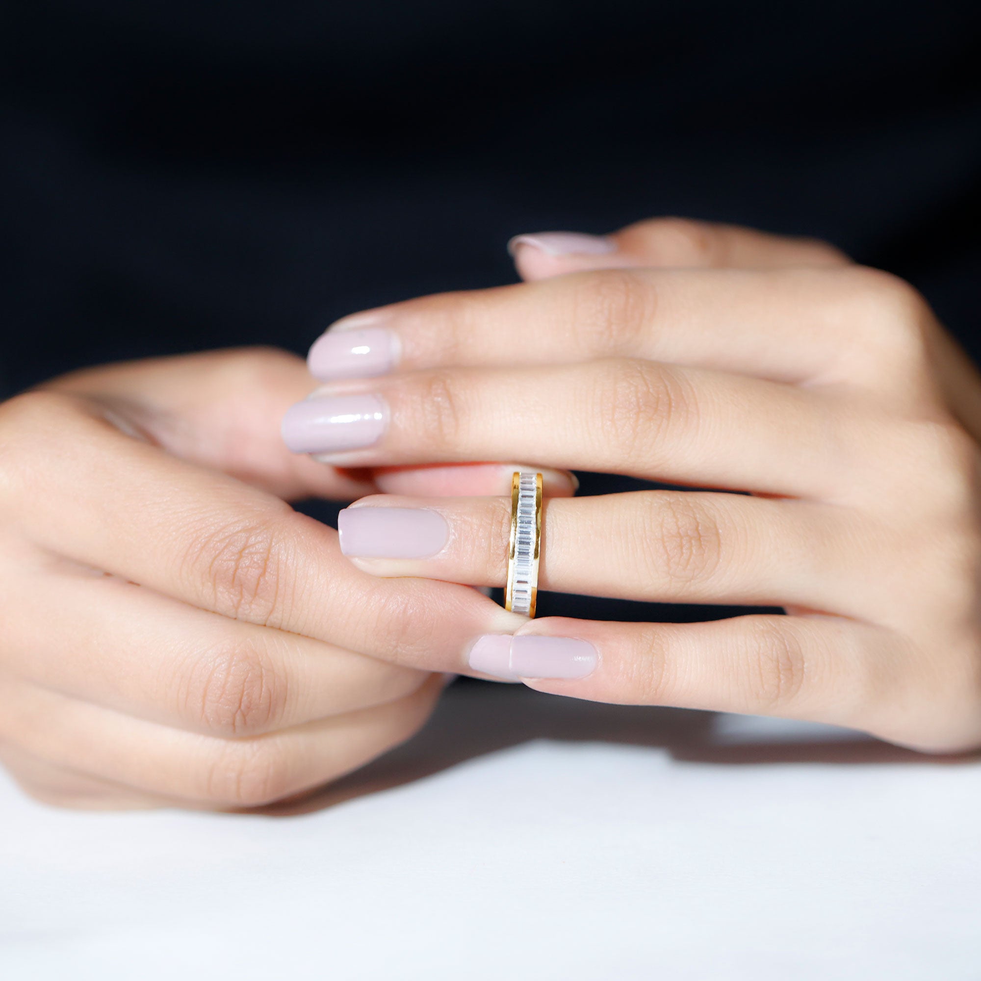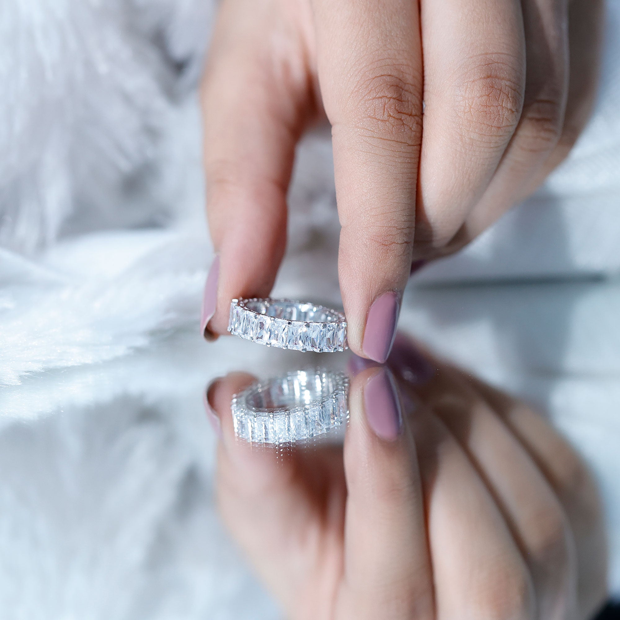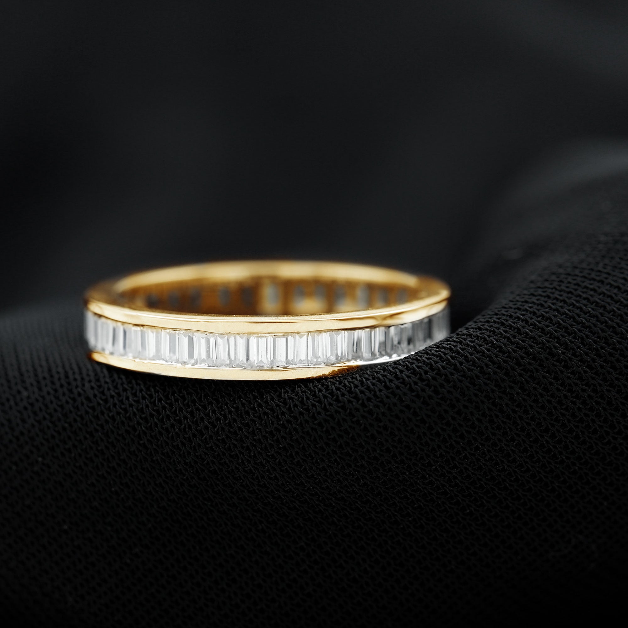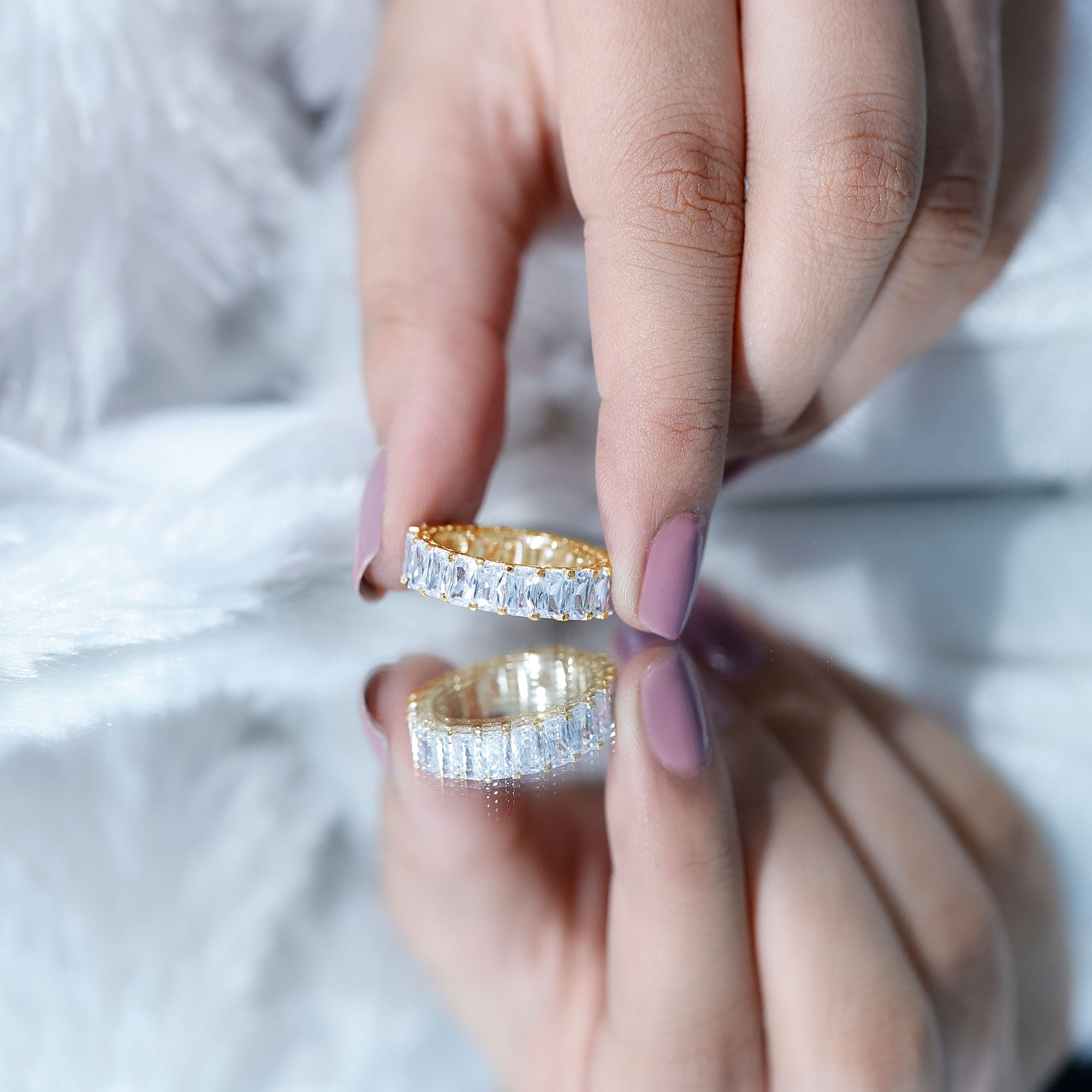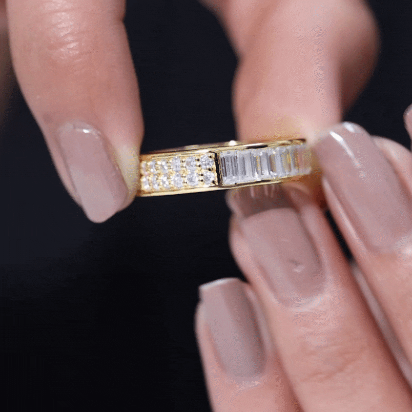 Baguette Wedding Rings: Baguette wedding bands are known for their larger gemstone illusion, vintage glam, and distinctive yet understated elegance. Tilted baguette sapphires, straight baguette moissanites, or any other colored or sparkling gemstone wedding bands can add a touch of sparkle to your engagement ring.