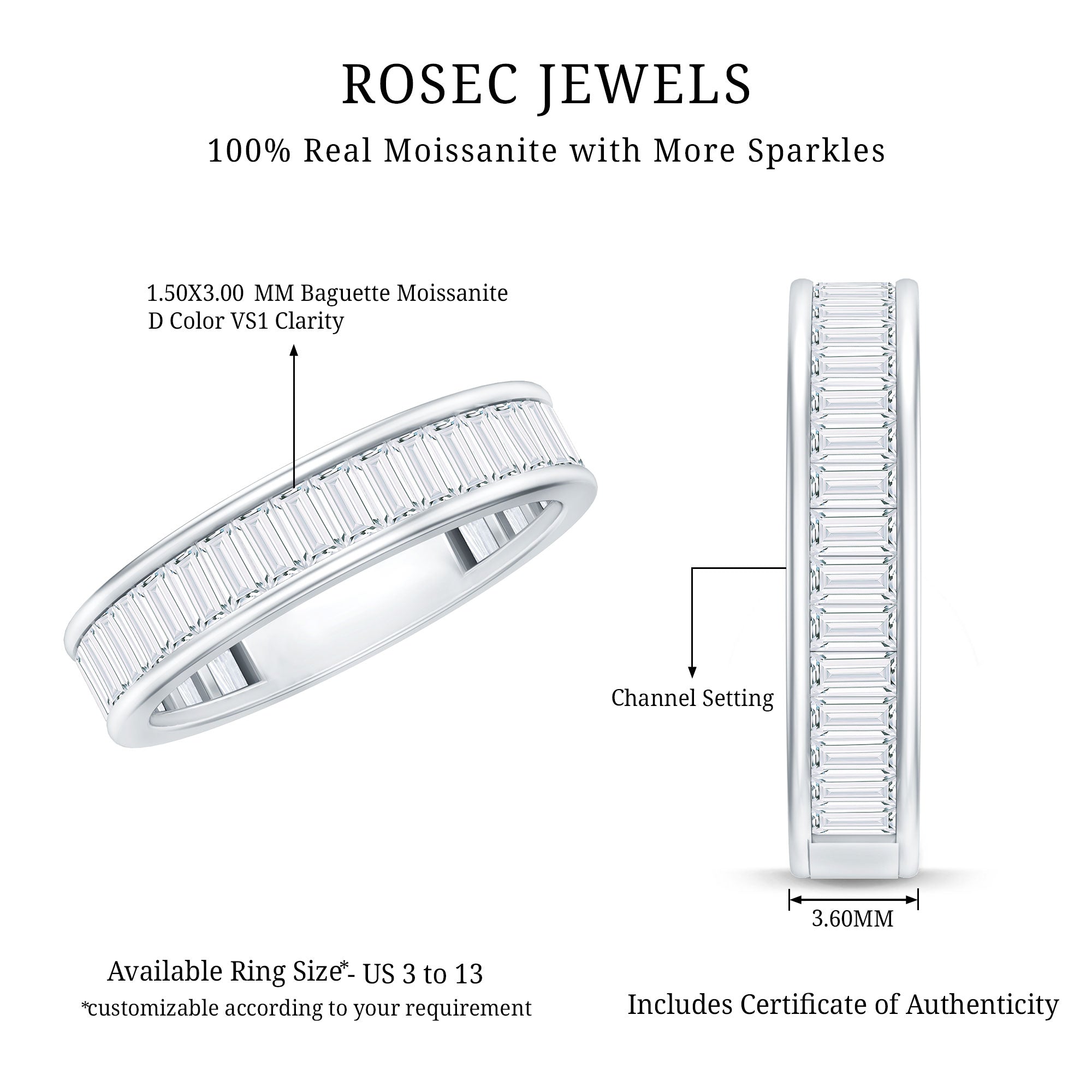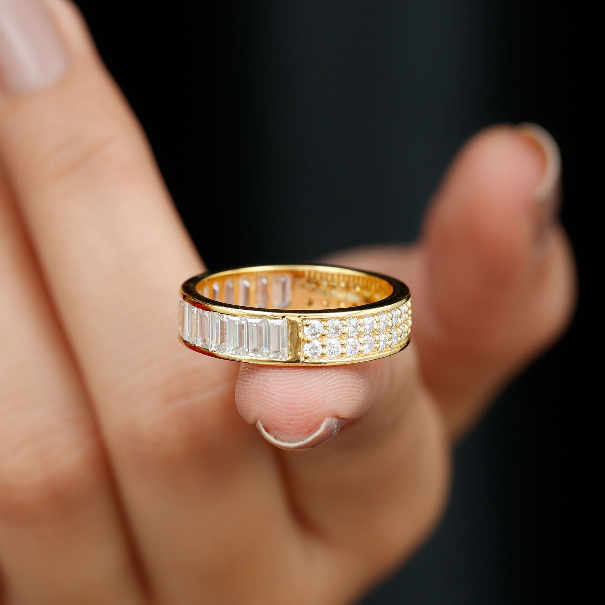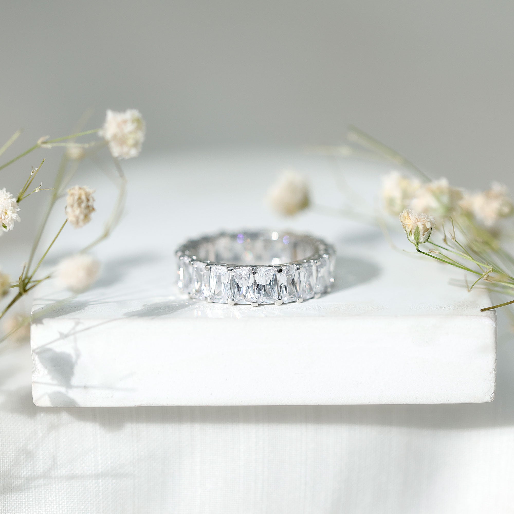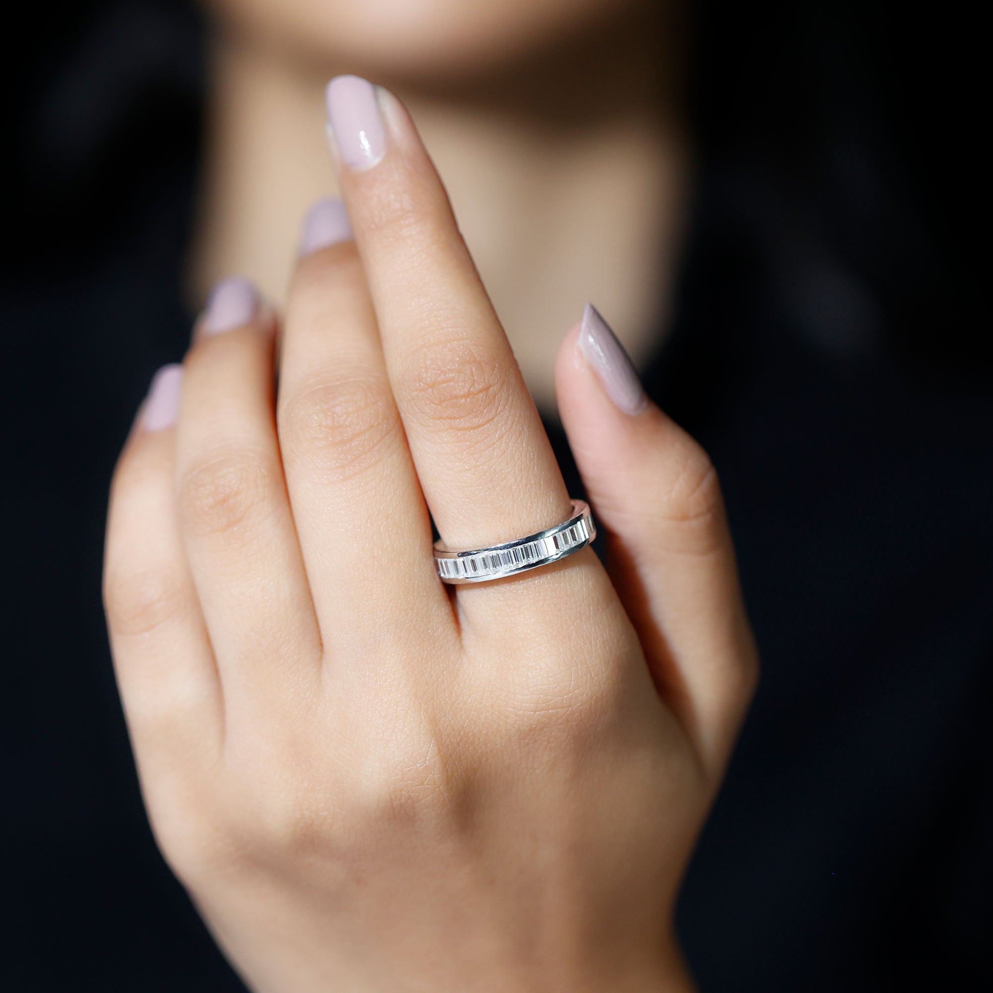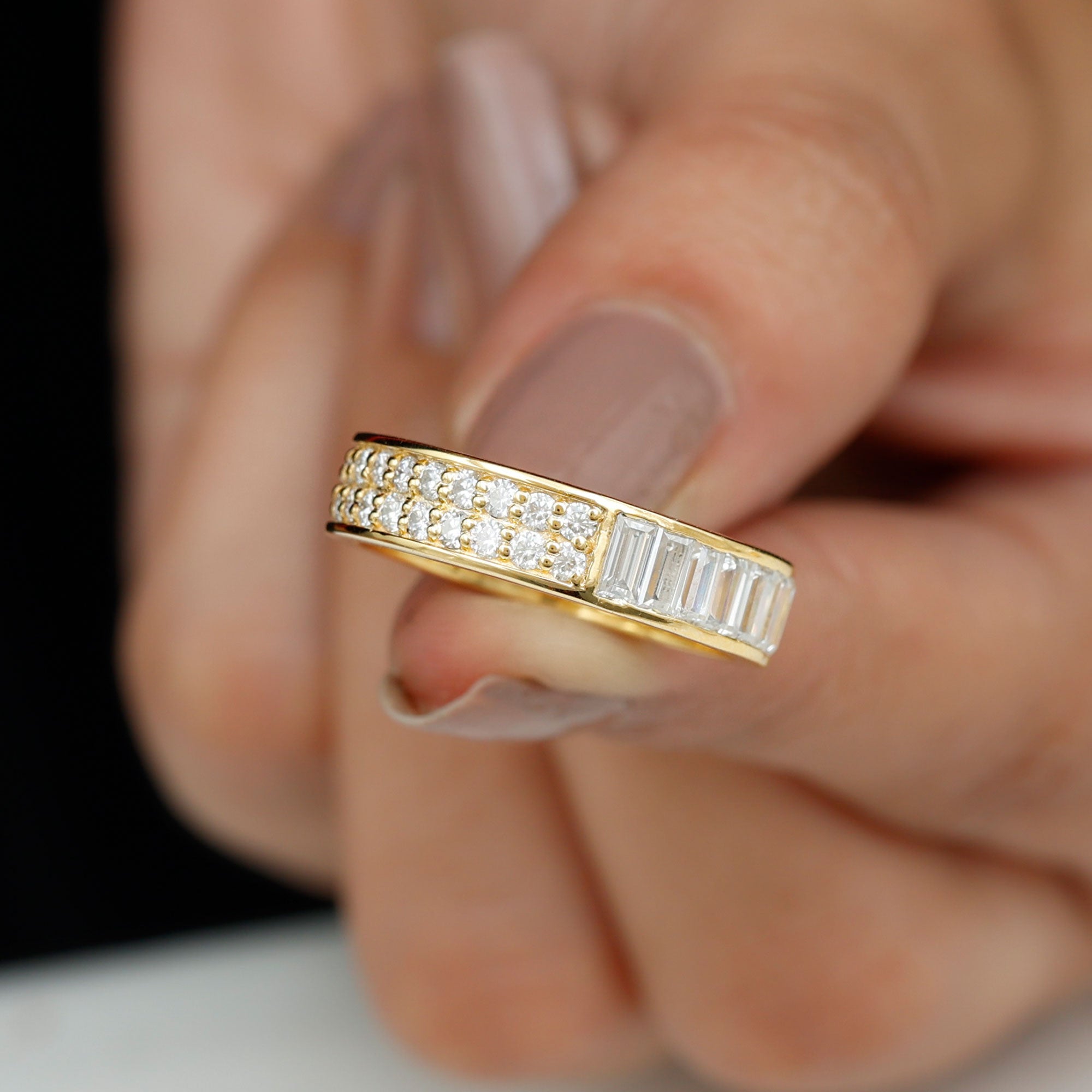 Baguette Wedding Rings: Baguette wedding bands are known for their larger gemstone illusion, vintage glam, and distinctive yet understated elegance. Tilted baguette sapphires, straight baguette moissanites, or any other colored or sparkling gemstone wedding bands can add a touch of sparkle to your engagement ring.