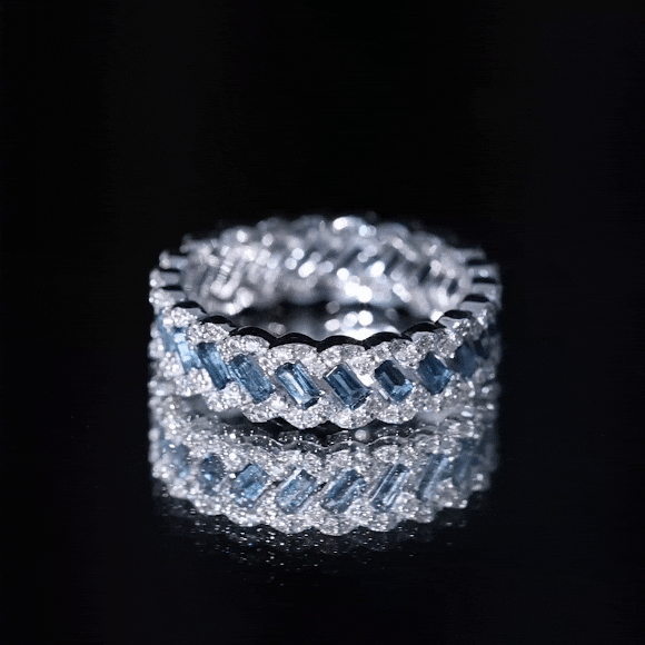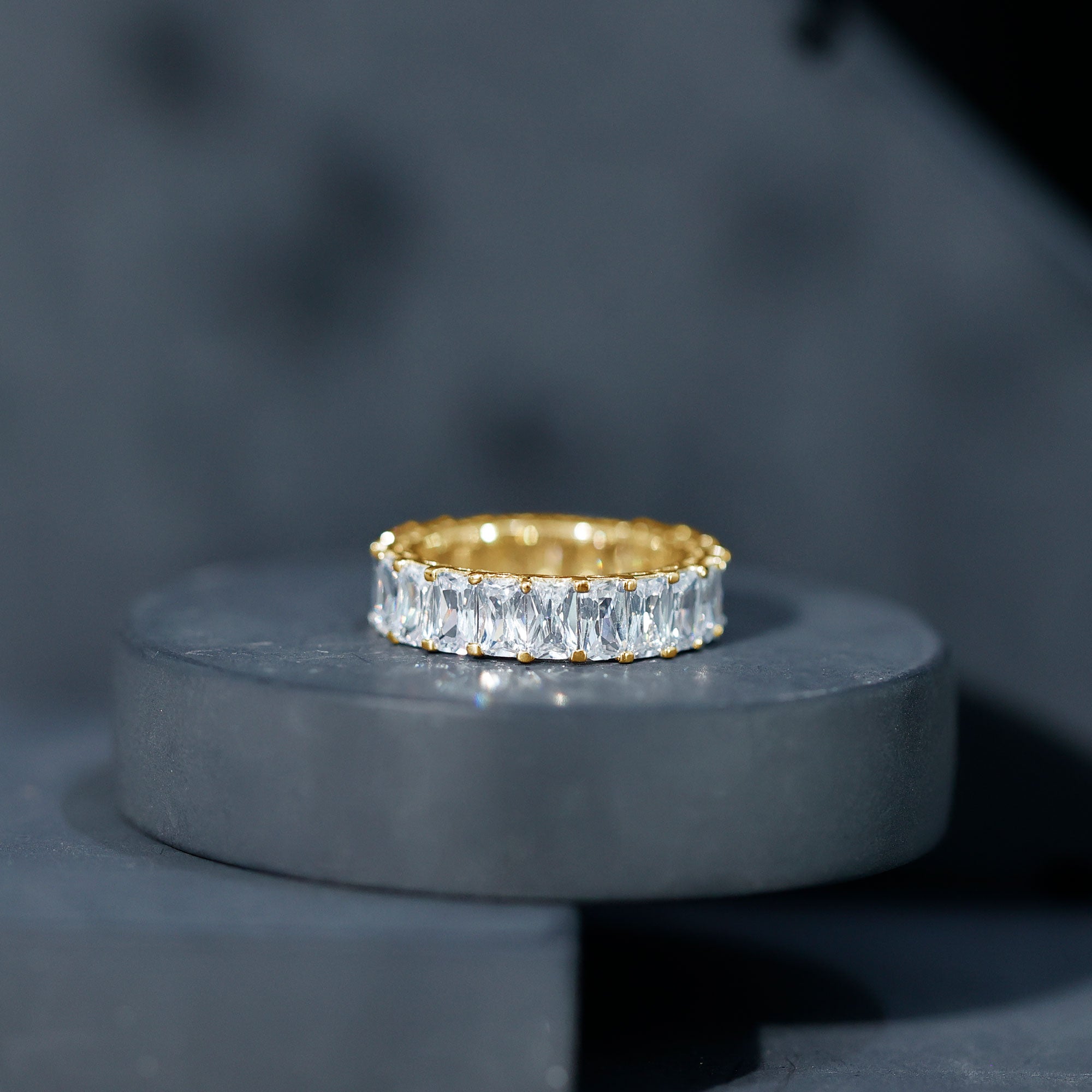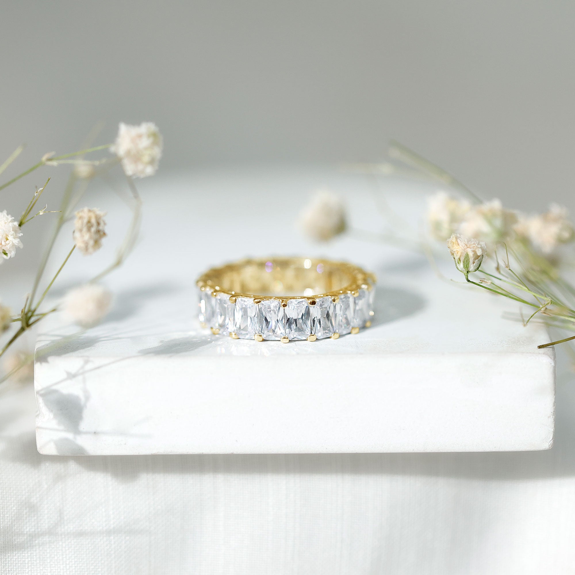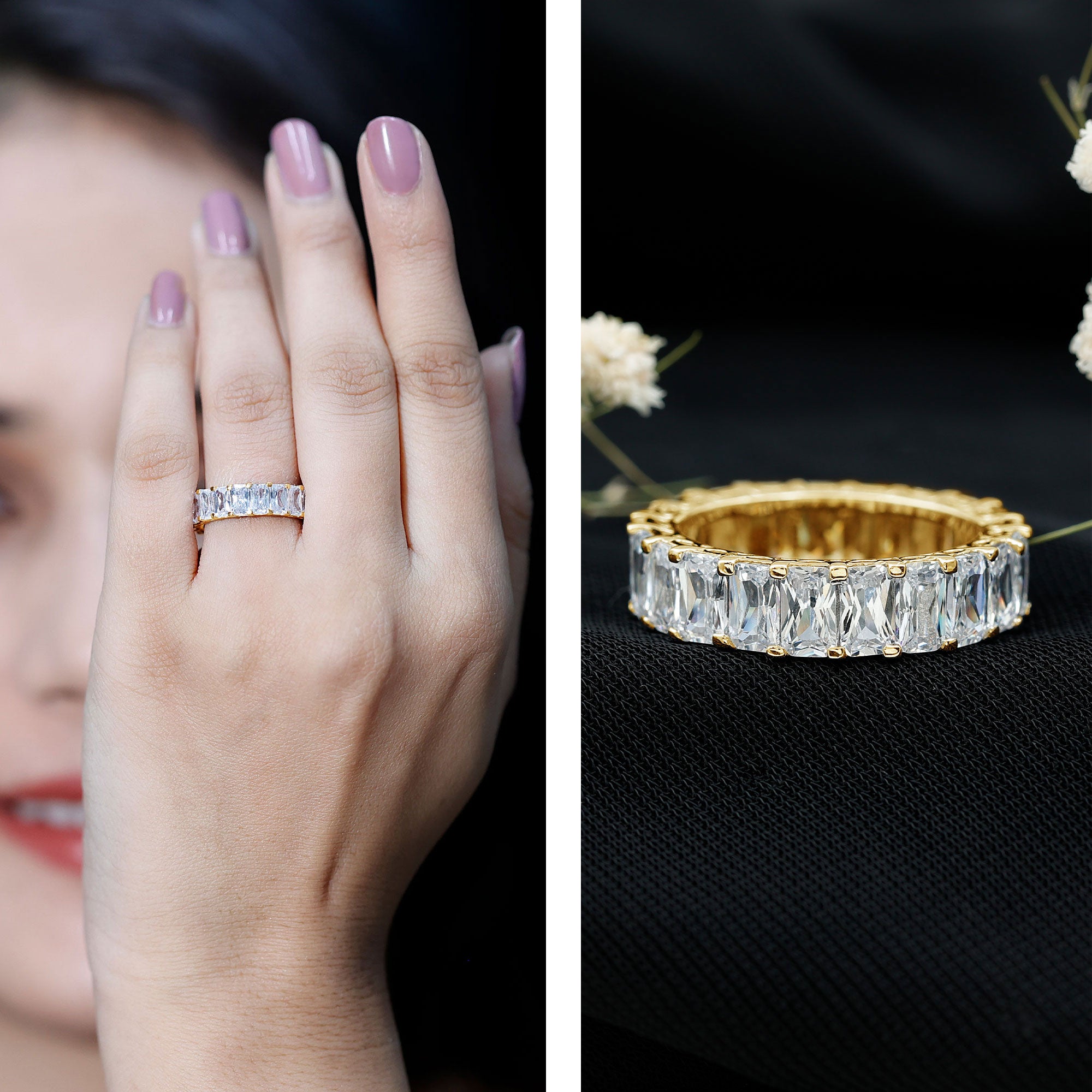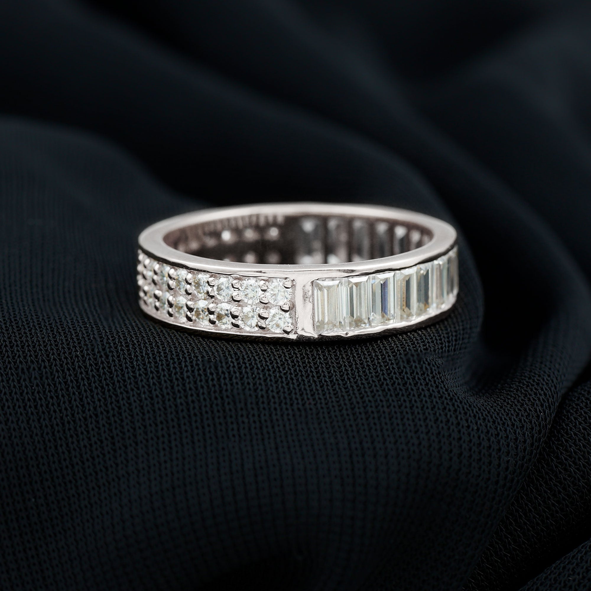 Baguette Wedding Rings: Baguette wedding bands are known for their larger gemstone illusion, vintage glam, and distinctive yet understated elegance. Tilted baguette sapphires, straight baguette moissanites, or any other colored or sparkling gemstone wedding bands can add a touch of sparkle to your engagement ring.