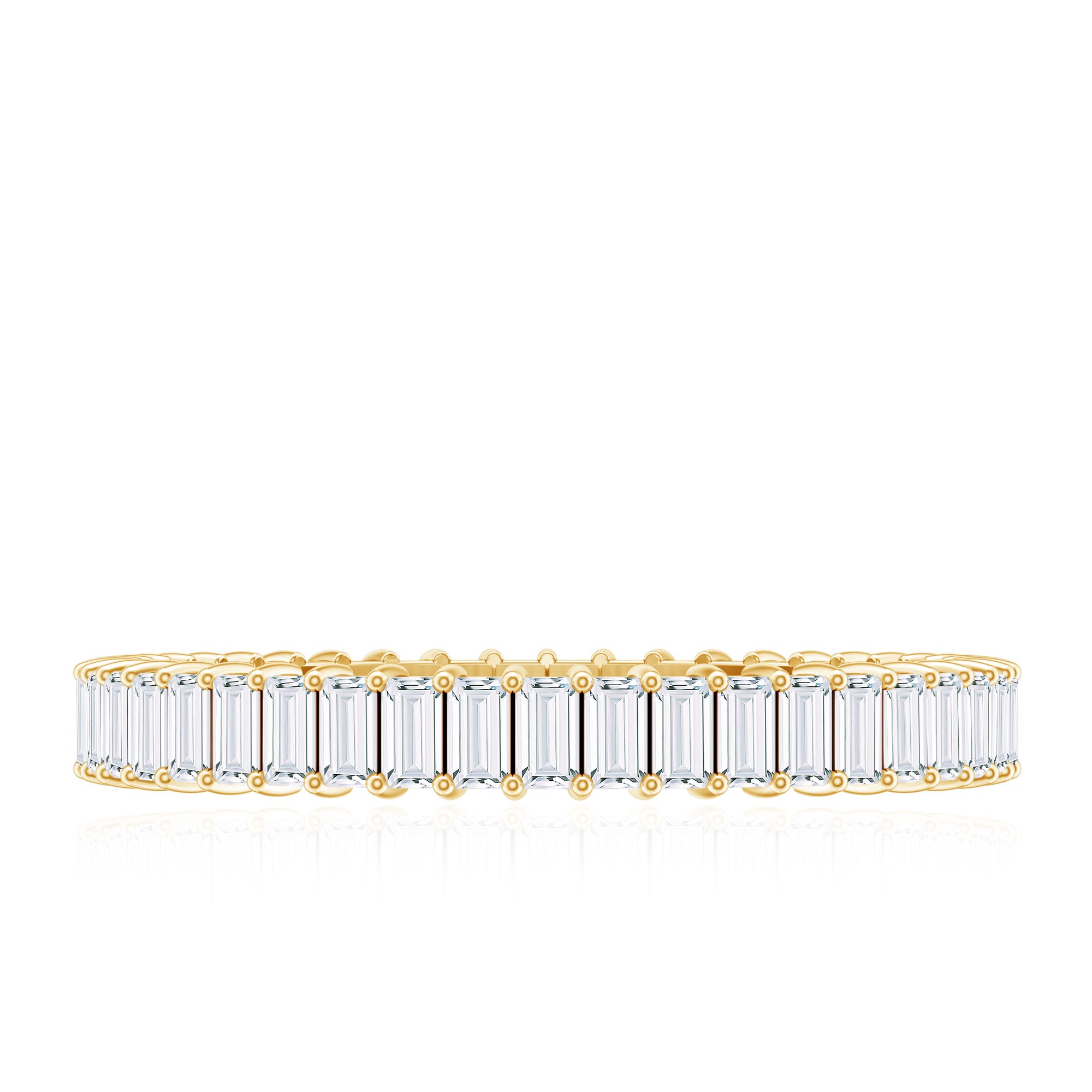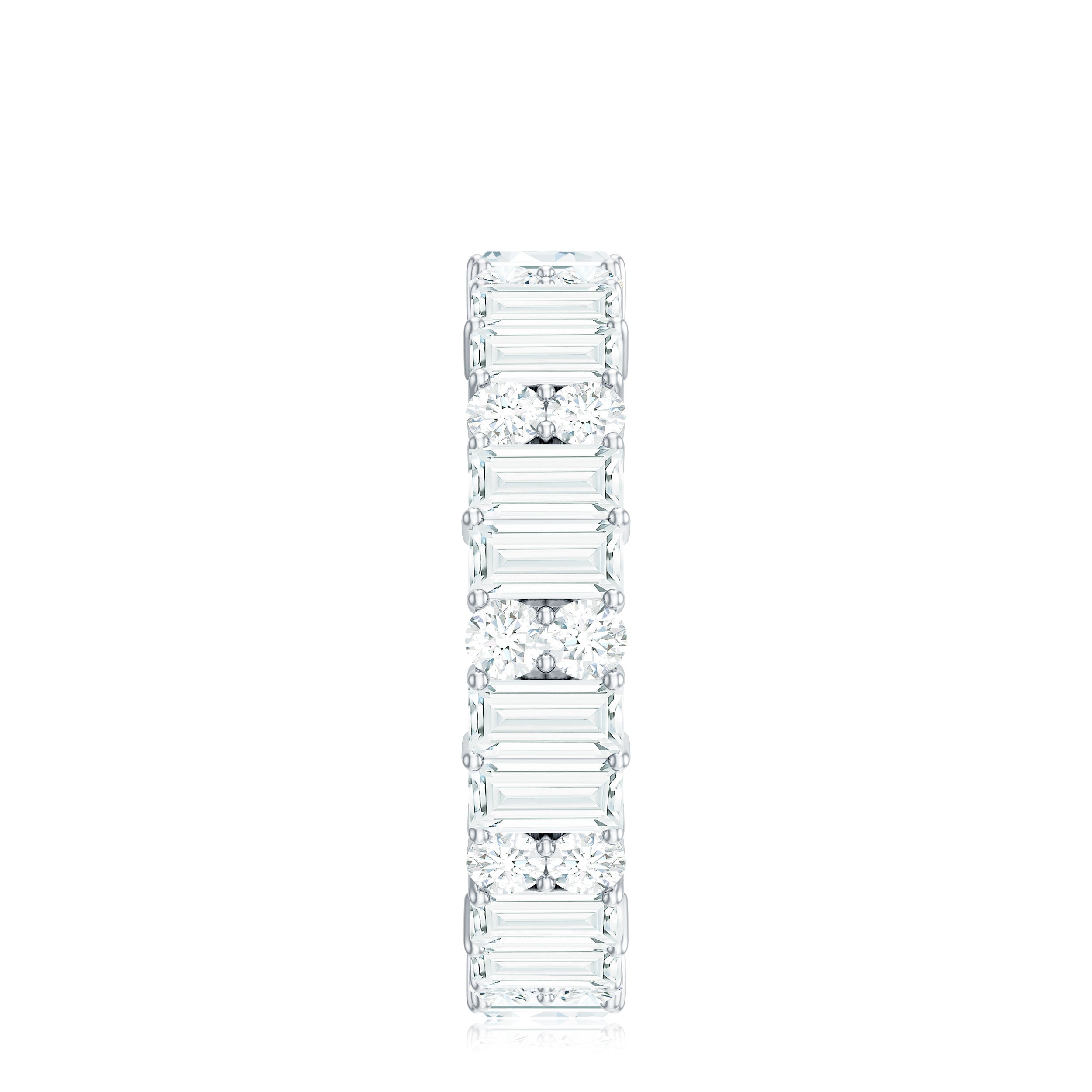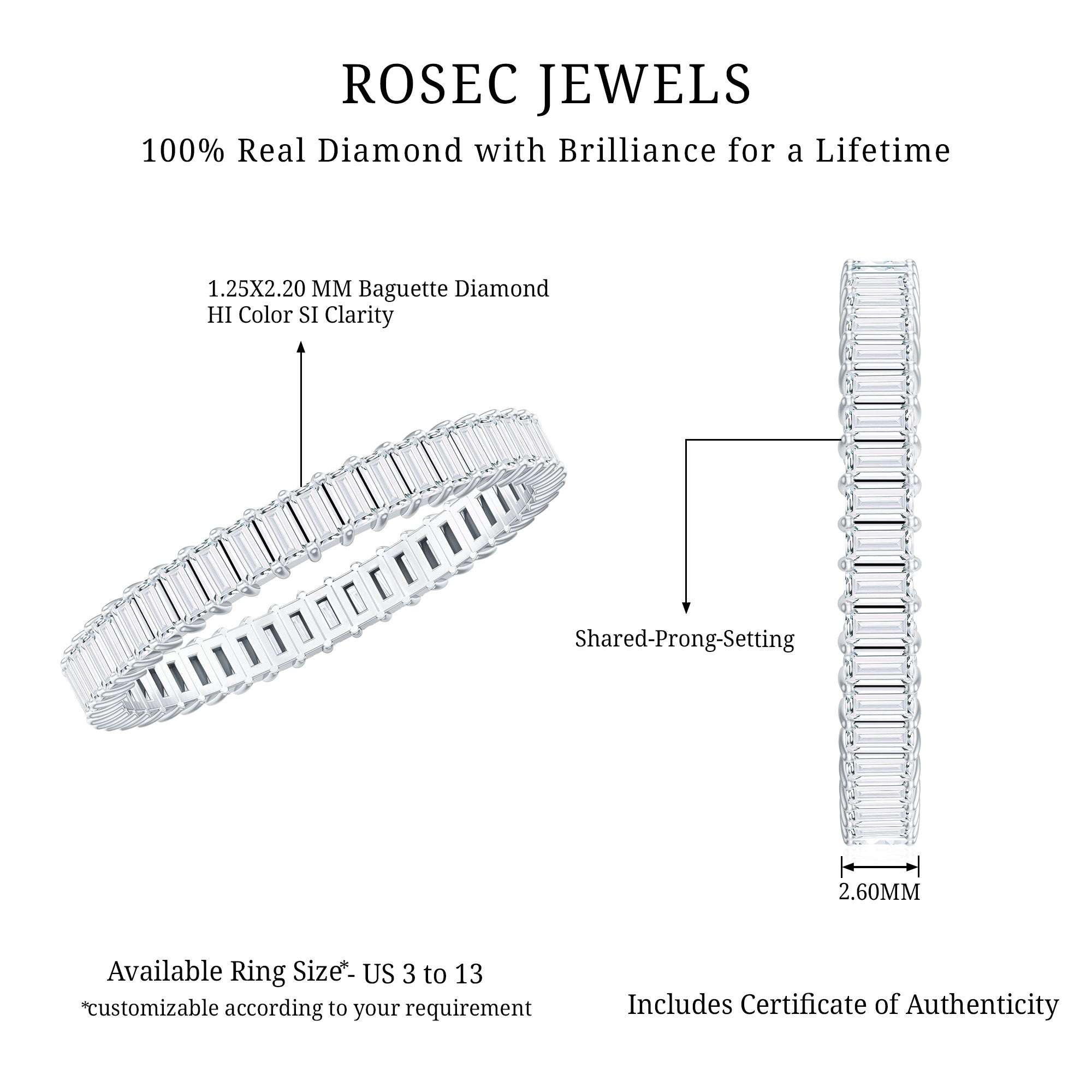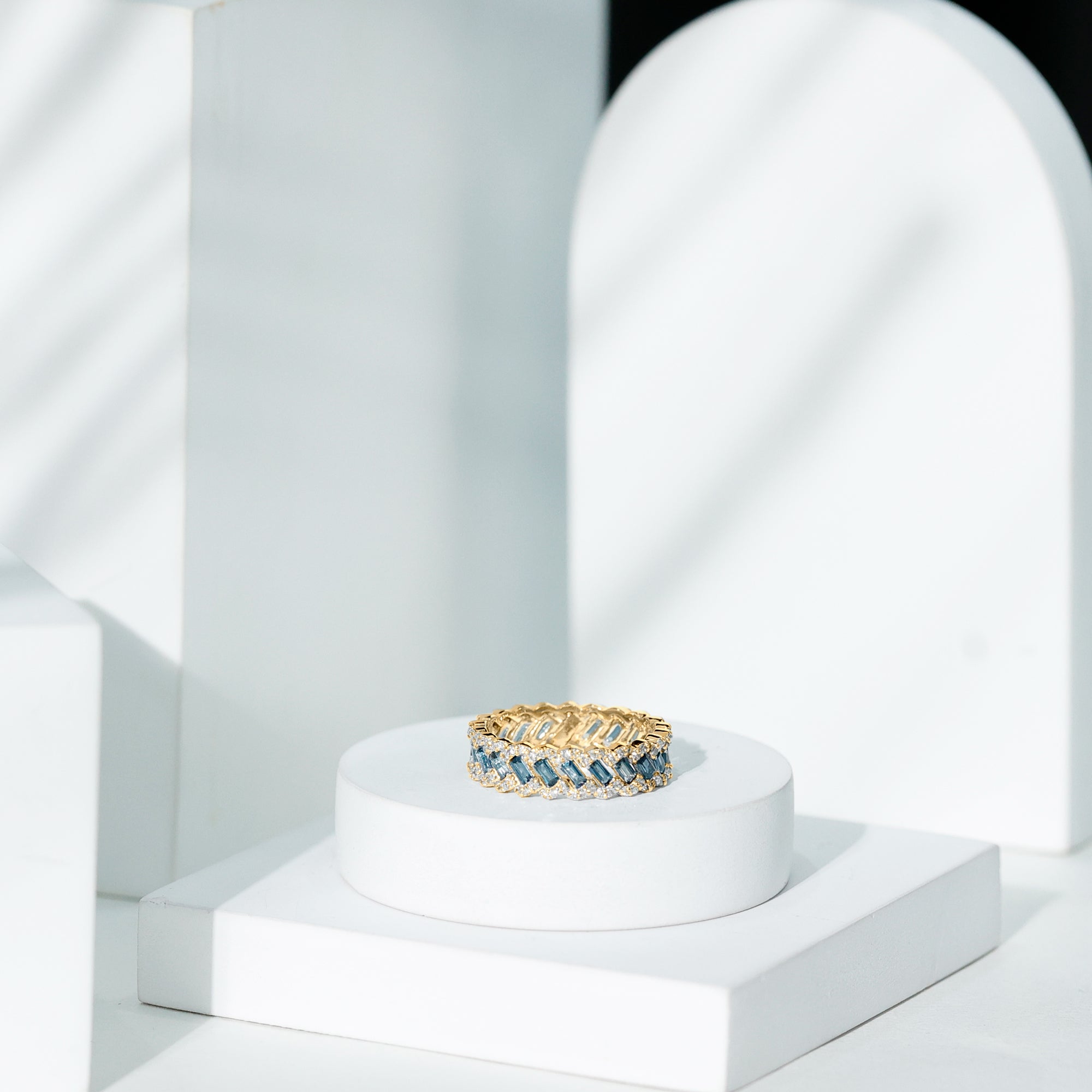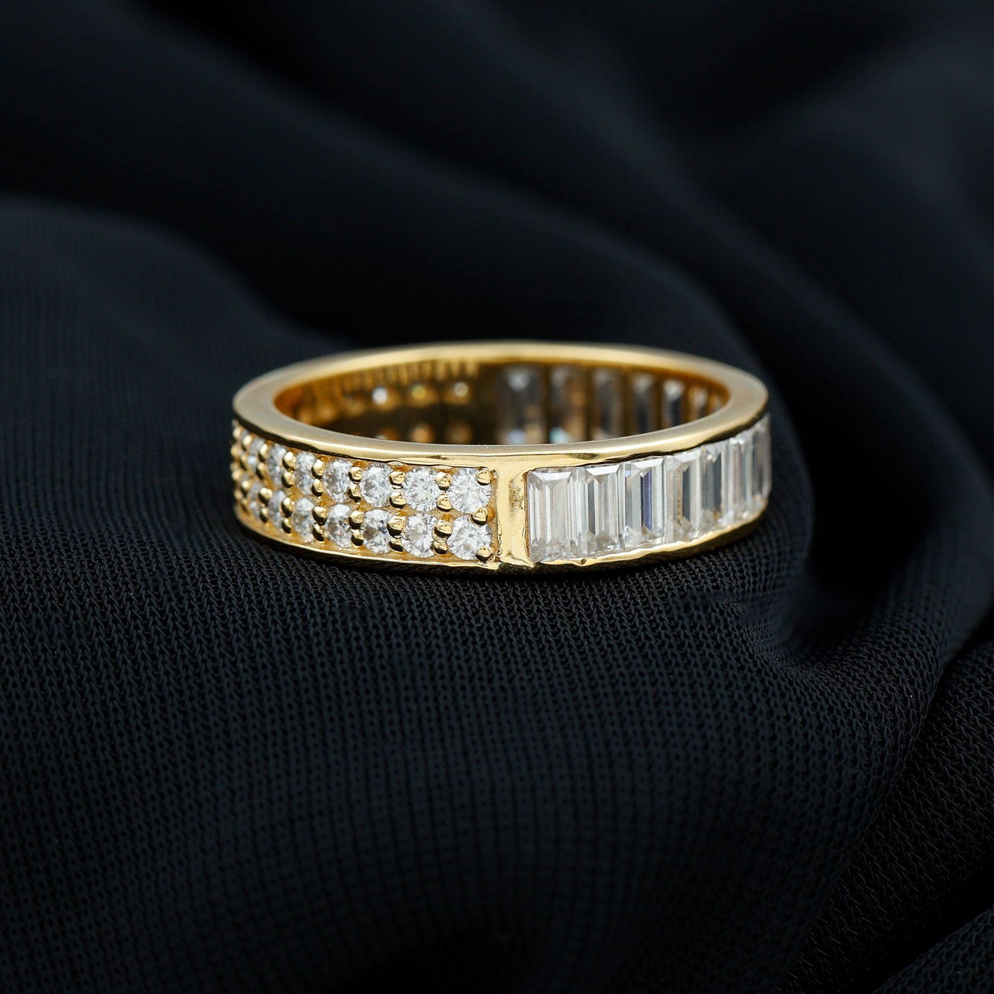 Baguette Wedding Rings: Baguette wedding bands are known for their larger gemstone illusion, vintage glam, and distinctive yet understated elegance. Tilted baguette sapphires, straight baguette moissanites, or any other colored or sparkling gemstone wedding bands can add a touch of sparkle to your engagement ring.