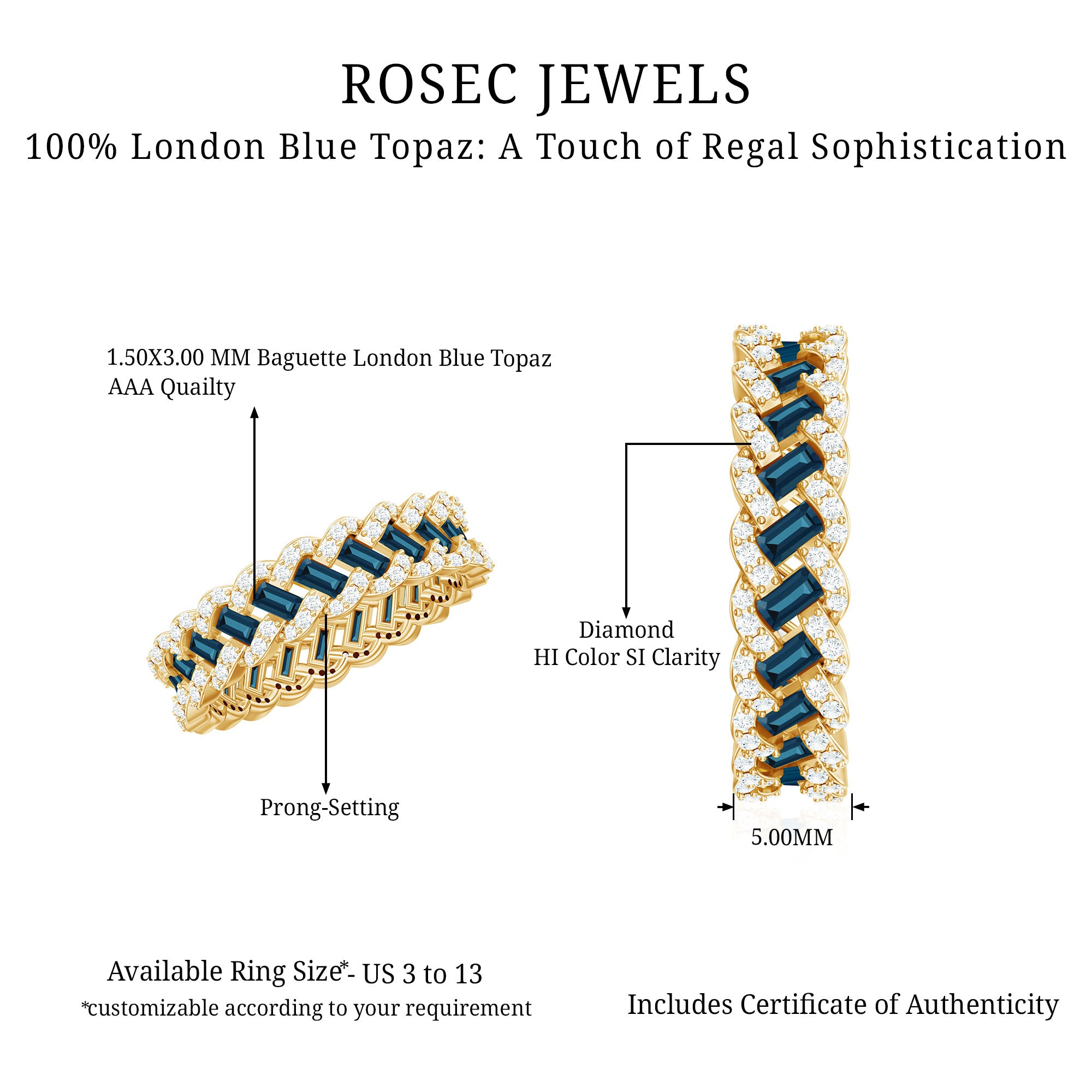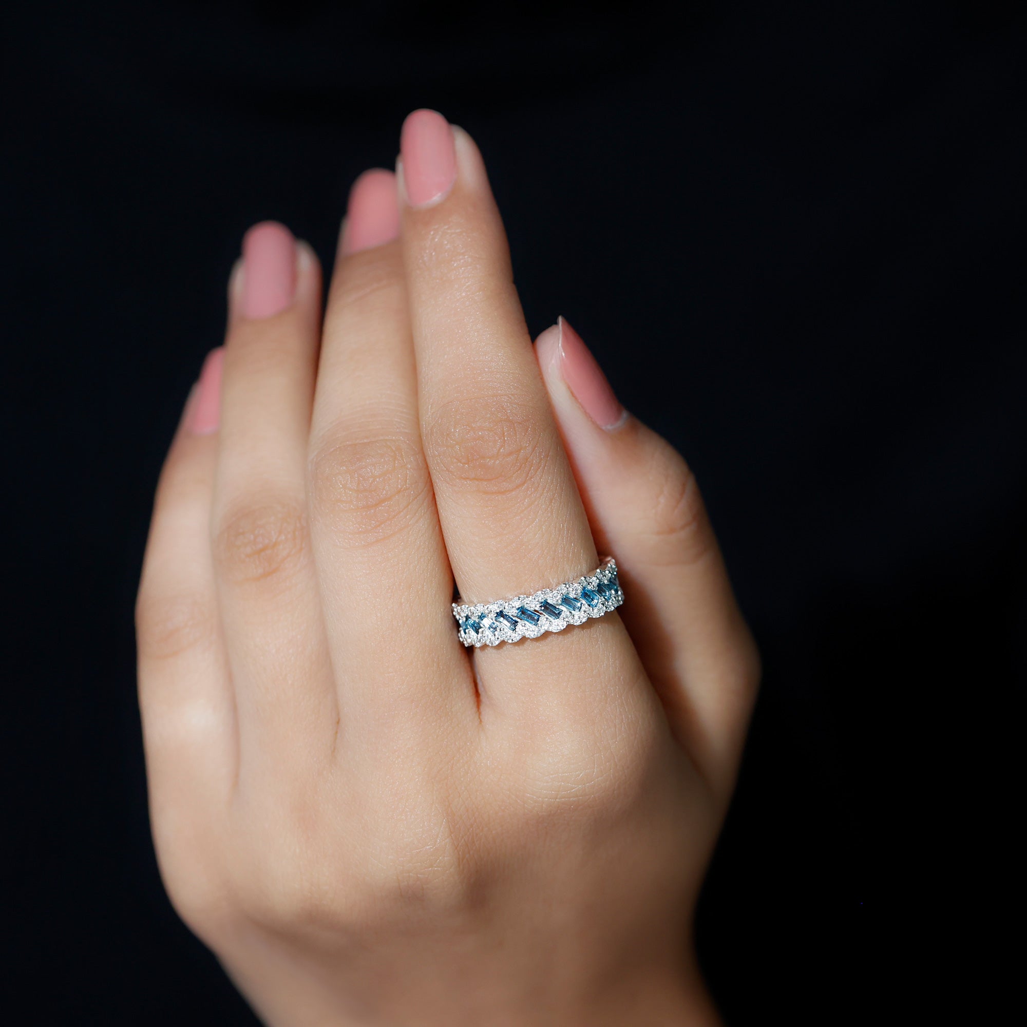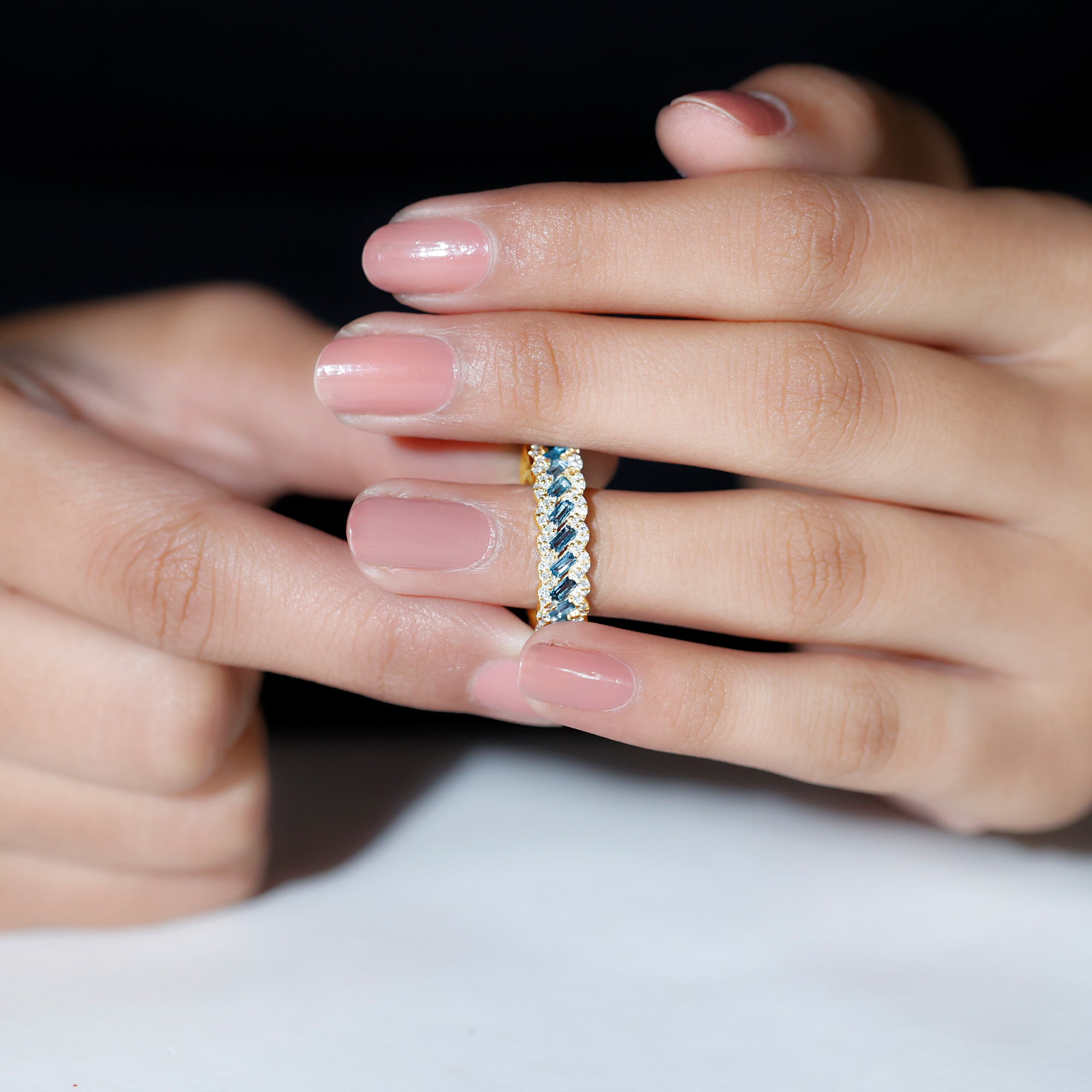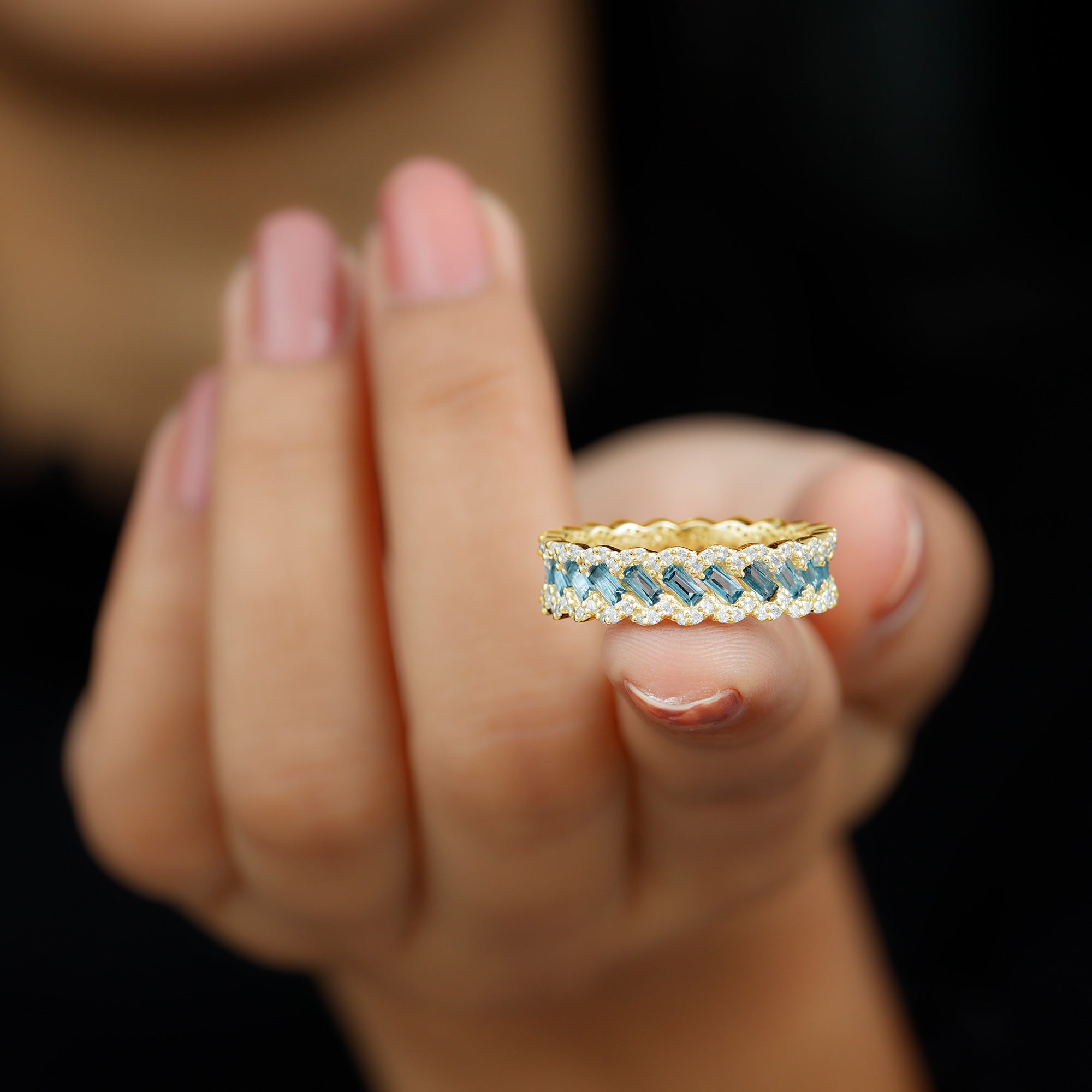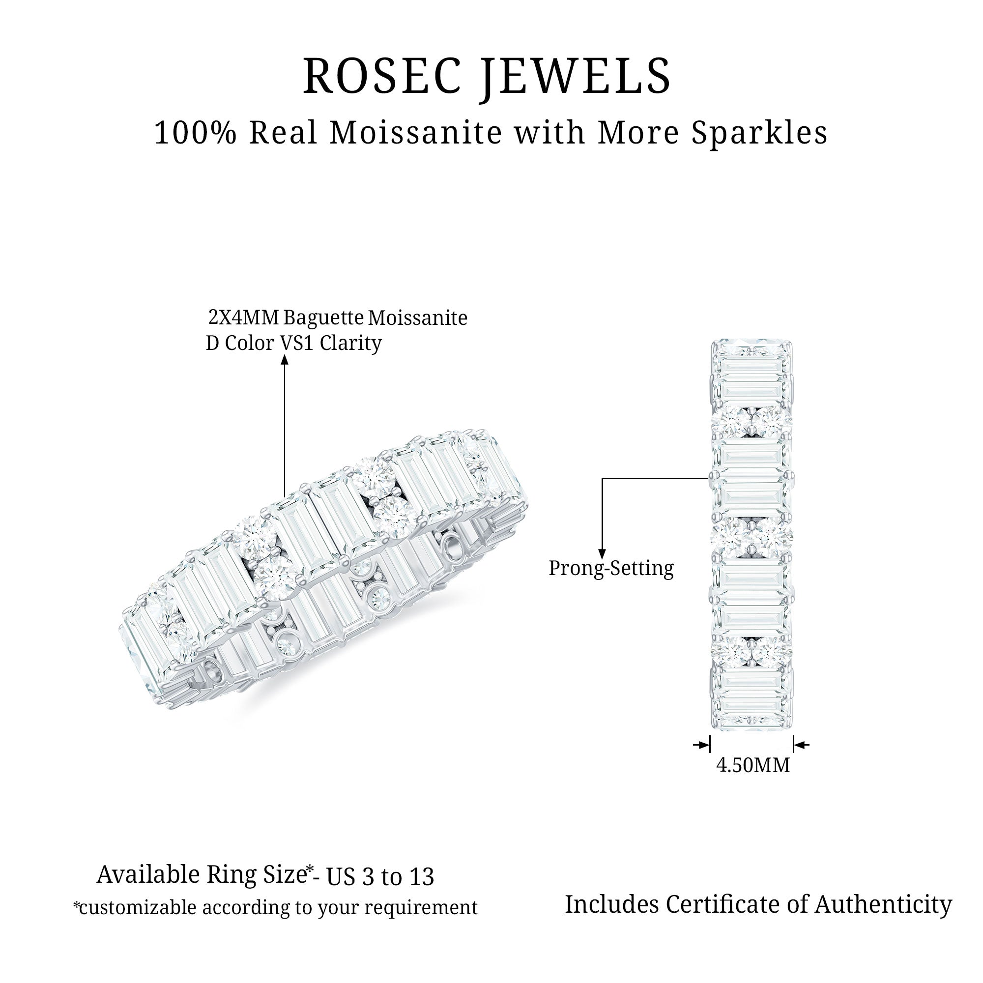 Baguette Wedding Rings: Baguette wedding bands are known for their larger gemstone illusion, vintage glam, and distinctive yet understated elegance. Tilted baguette sapphires, straight baguette moissanites, or any other colored or sparkling gemstone wedding bands can add a touch of sparkle to your engagement ring.