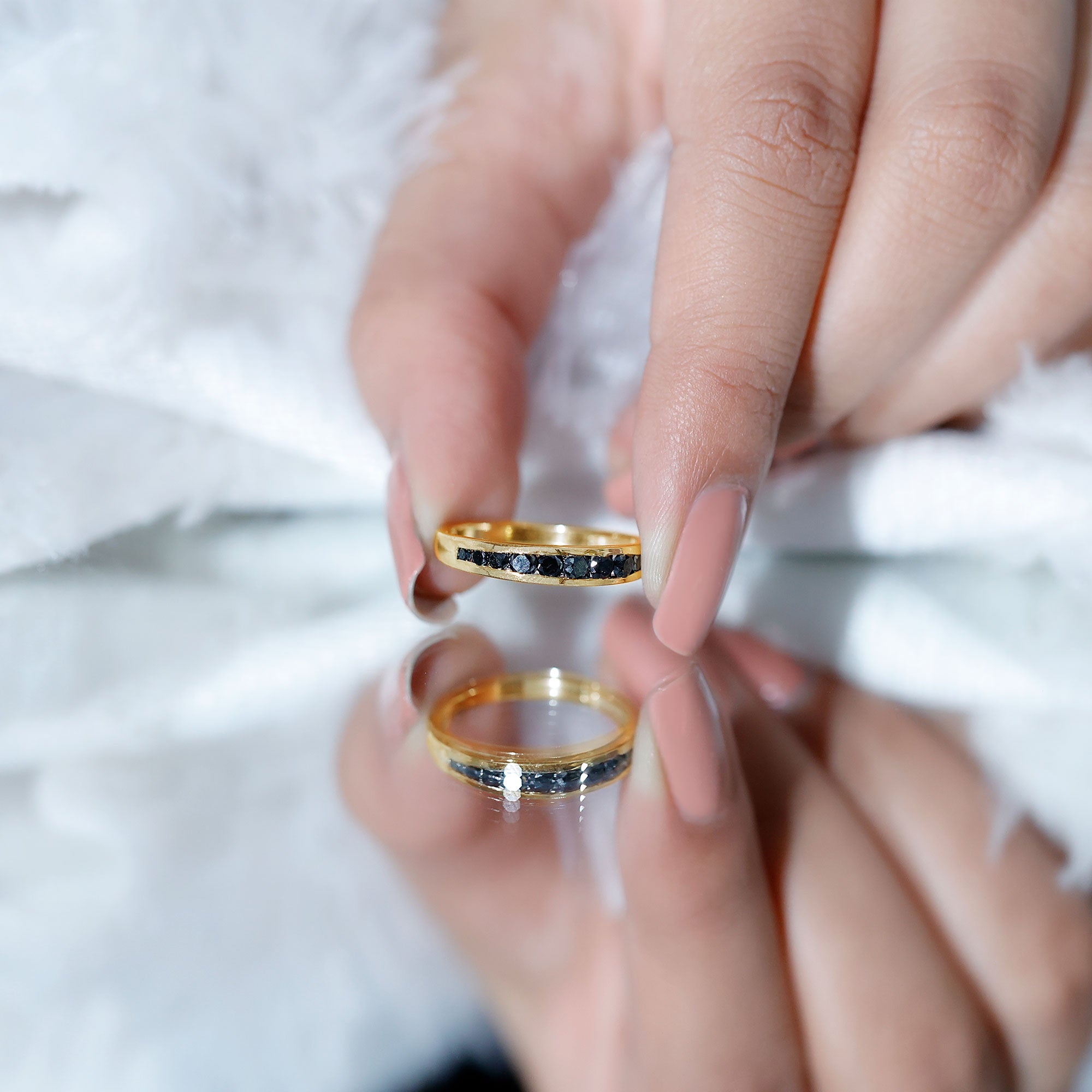 Gemstone wedding rings loaded with beauty carry deep meaning too. In bold and soft colors, they add a character to your personality. Diamonds have been favored since times, for their classic brilliance and durable nature. While colored gemstones like sapphires, emeralds, rubies, and more carry deep symbolism. Gemstones of different hues, shapes, and settings open a creative design world, with so many options. Like an art deco emerald halo, a ruby solitaire, sapphire eternity band, pave set round moissanite ring, and a forever sparkling diamond designer wedding ring and wedding band. Every gemstone in a different style has its own spark and charm.