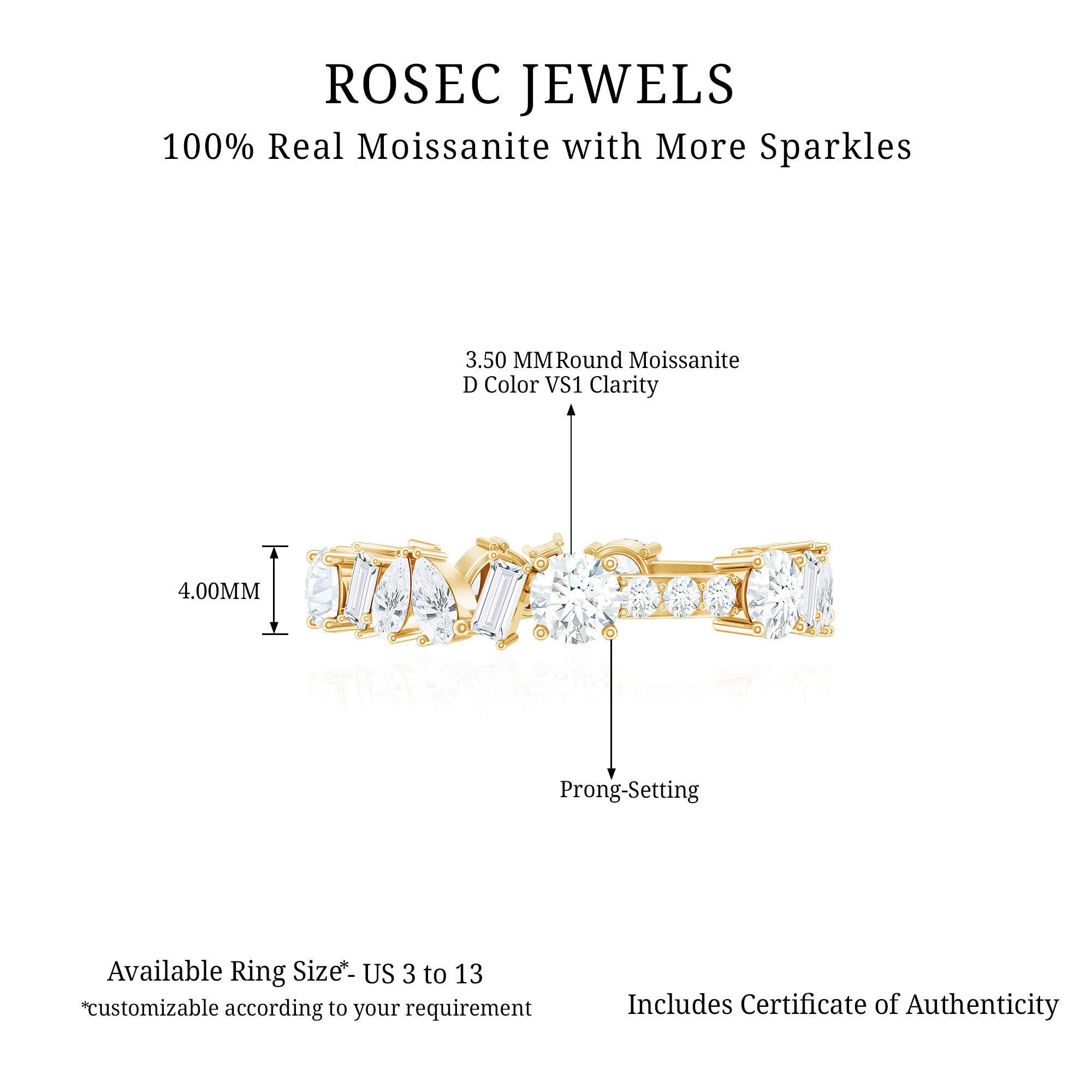 Pear Shaped Rings for Wedding Bands: Pear or teardrop wedding rings feature a gemstone with rounded ends and pointed tip. Pear gemstone with a flattering silhouette, elongates the finger, and showcases the gem’s color transitions very well. Crafted side by side or accented with other traditional cuts, pear moissanite wedding rings present classic designs with a stylish touch.