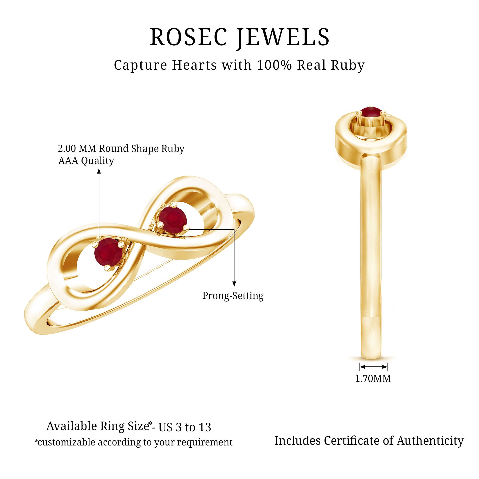 Rosec Jewels’ fantastic range of infinity rings for women are an unique combination of trending designs with a diverse range of precious and semi-precious gemstones to curate a mesmerizing collection of infinity rings. Further, blending different gemstone shapes with colorful hues of gold namely yellow gold, white gold and rose gold to bring further diversification in the overall infinity wedding ring styles.