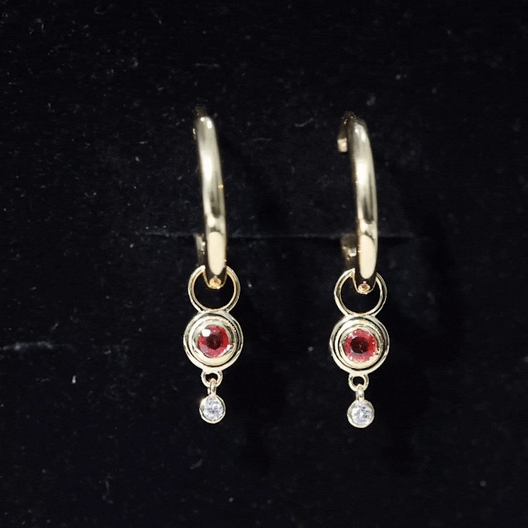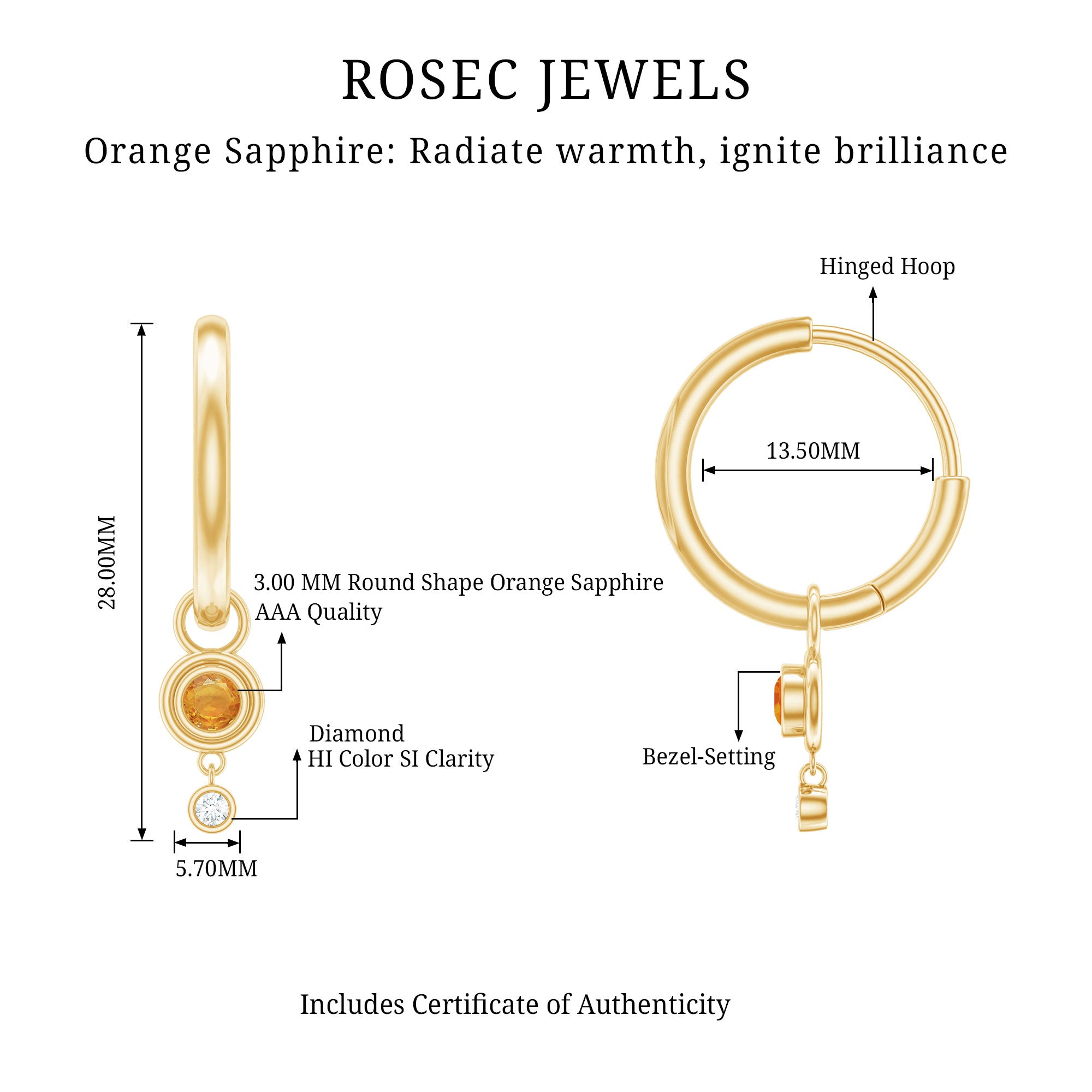 Make a chic and sophisticated fashion statement with these Bezel Set Orange Sapphire and Diamond Simple Hoop Drop Earrings. These earrings feature a stunning orange sapphire held in a secure bezel setting with a Diamond gemstone. The Diamond and sapphire are suspended from simple hoops, creating a look that is both elegant and understated. The warm and vibrant orange color of the sapphire is perfectly complemented by the Diamond gemstone, creating a harmonious and stunning look. These earrings are ideal for special events, such as weddings or anniversaries, and are sure to become a treasured addition to any jewelry collection. With their timeless design and exceptional craftsmanship, these Bezel Set Orange Sapphire and Diamond Simple Hoop Drop Earrings are the epitome of elegance and beauty. These earrings are perfect for those who love to add a pop of color to their jewelry collection and are ideal for daytime or evening wear.