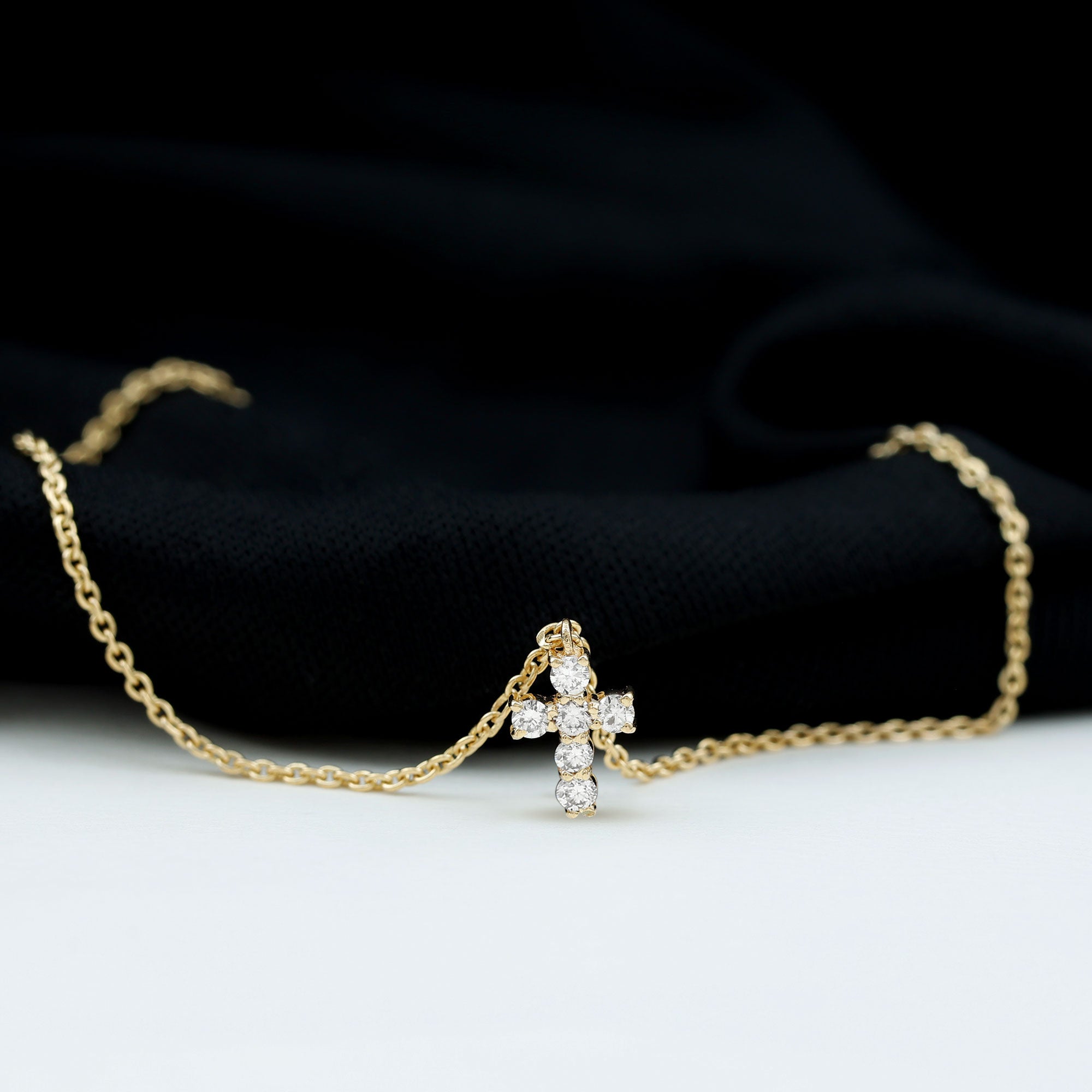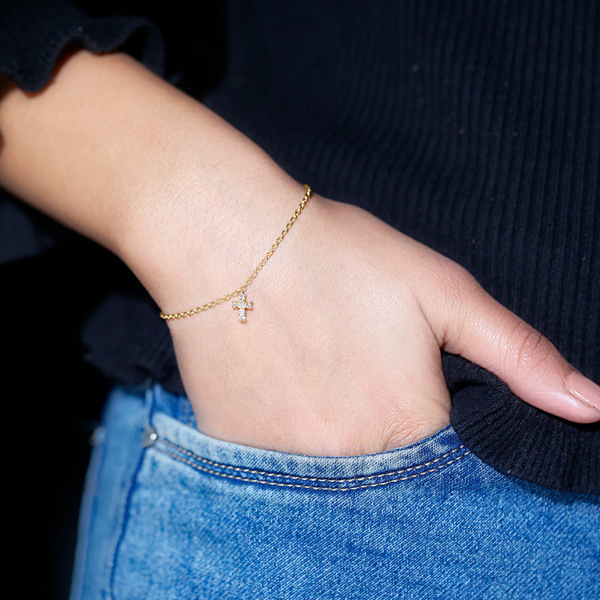 Embrace the timeless symbol of faith, spirituality, and devotion with this exquisite Diamond Cross Bracelet, which is inspired by the sacred cross. With its unique design and meticulous attention to detail, this Bracelet offers luxury and elegance. Exuding sophistication and grace, this Cross Bracelet is adorned with a Round brilliant cut Diamond on the cross. Its design is crafted to honor the significance of the religious symbol and serve as a beautiful reminder of ones beliefs and values. This spiritual accessory has a perfect Cross charm on the Chain Bracelet that blends tradition with modernity. As a timeless piece of jewelry, it is a minimalist accessory that represents themes and religion and is perfect for any special event. Its minimalist design highlights a striking cross charm which resonates with refined elegance. Whether worn solo for a subtle statement or layered with other pieces for a bolder look, this Cross Charm Bracelet is classic simplicity through every moment, reminding you of the spiritual significance it embodies.