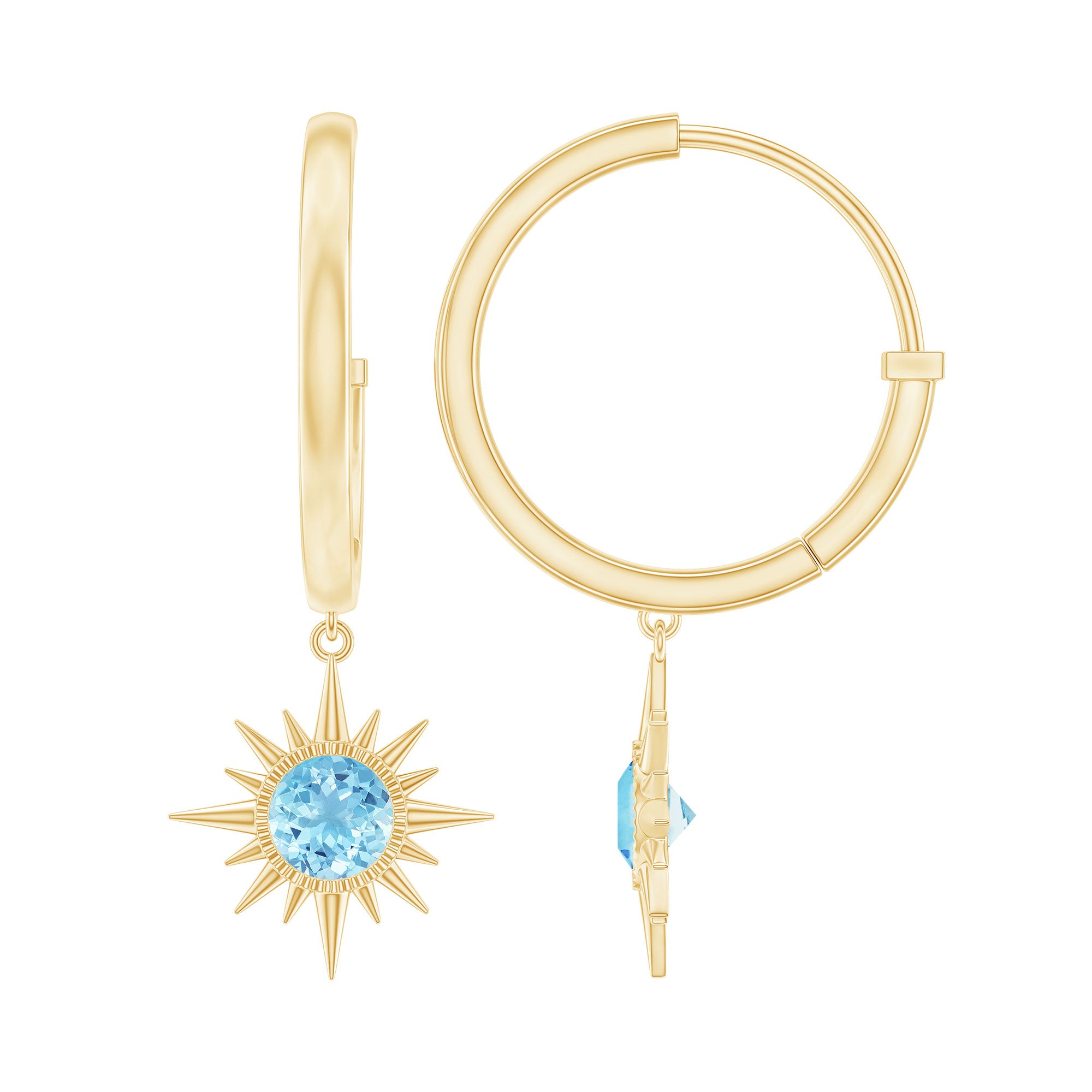 Convey heartfelt emotion and timeless elegance with these exquisite Aquamarine Drop Earrings, thoughtfully designed to celebrate beauty and craftsmanship. Each earring features a luminous 4MM round shape aquamarine, securely set in bezel setting. Surrounding the aquamarine is a radiant sunburst design, meticulously crafted to create texture and a captivating play of light. The gemstone centerpiece gently hangs from a hinged hoop, allowing graceful movement that enhances its visual appeal with every turn. Crafted using AAA quality genuine aquamarine stones, these Hoop Drop Earrings reflect exceptional clarity and color, making them a distinguished addition to any fine jewelry collection. The hinged hoop design ensures ease of wear and a secure fit, combining practicality with sophisticated style. These Aquamarine Hoop Earrings are well suited for celebrating meaningful occasions such as anniversaries, birthdays, or special milestones, offering a thoughtful way to express love and appreciation. This pair is carefully presented in a premium jewelry box and accompanied by a certificate of authenticity, assuring quality and authenticity. These Sunburst Earrings stand as a symbol of warmth, elegance, and enduring affection, making them a cherished gift to be treasured for years to come.
