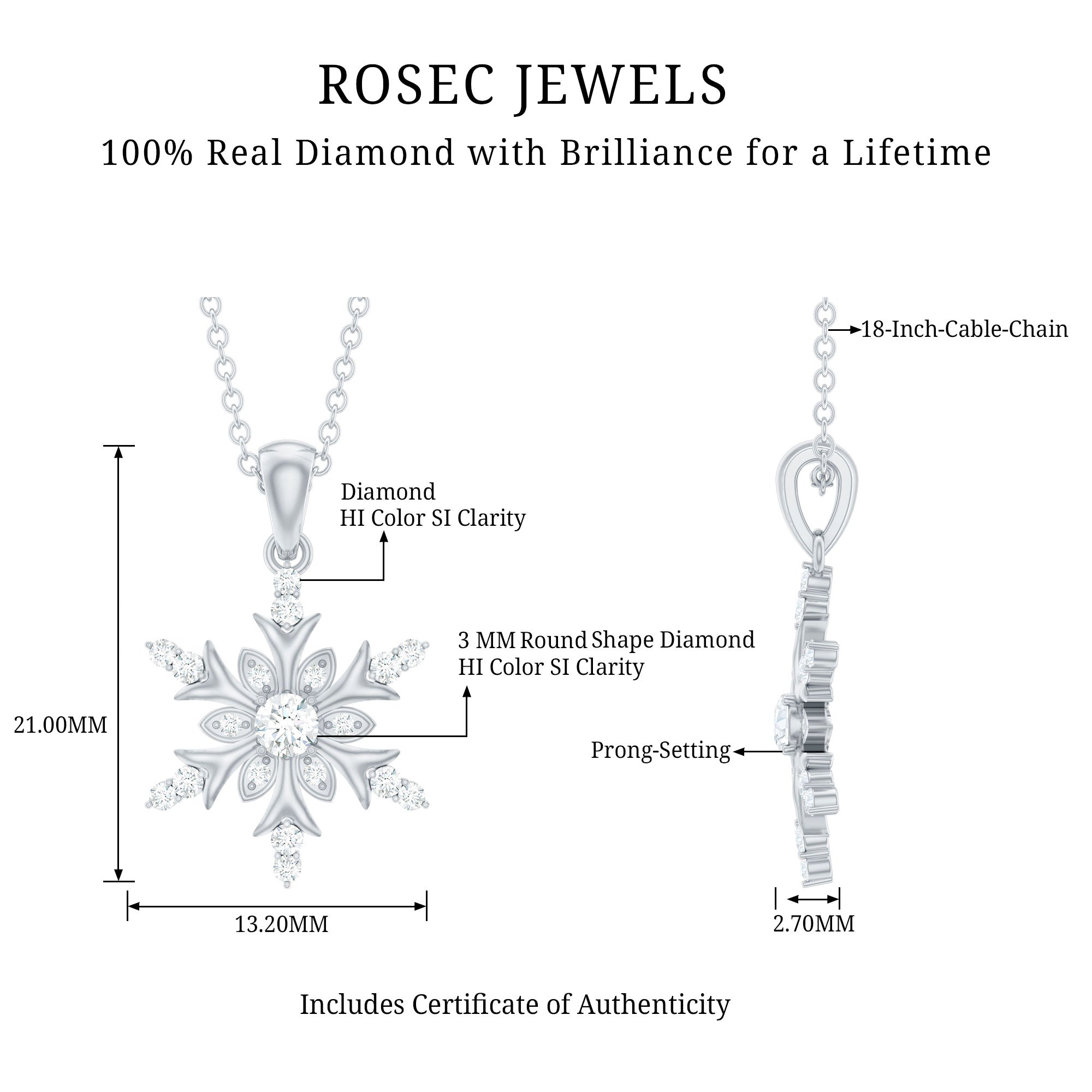 Embrace the spirit of winter with the enchanting Diamond Snowflake Necklace. Made from premium metal, this detailed snowflake design showcases beautiful round cut diamonds of HI-SI quality, securely held in prongs. The pendant hangs from a delicate cable chain, making it a breeze to wear. Its an ideal birthday gift for her, a sweet Valentine’s Day surprise for your girlfriend, or a thoughtful Christmas present for mom - this Snowflake Pendant Necklace is sure to light up their faces with joy. This Real Diamond Pendant is versatile enough to complement any outfit, whether youre going for a casual vibe or dressing up for a fancy evening. Snag yours today and step up your style game! This Snowflake Jewelry is a classic addition to your collection that will be cherished for years. Perfect for the festive season, this Designer Snowflake Necklace will bring a hint of magic to your Christmas ensemble.