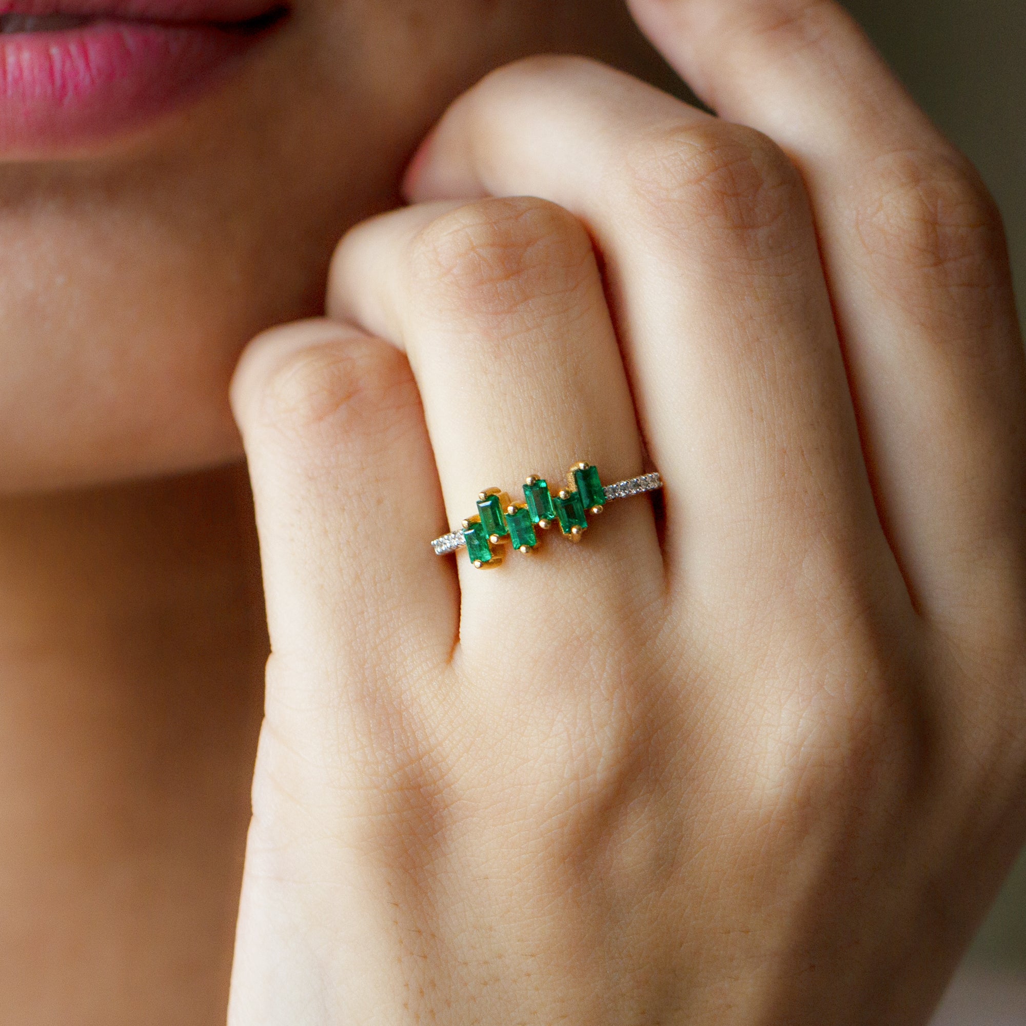 Make a lasting impression with this stunning Emerald Proposal Ring, a perfect mix of modern design and classic beauty. The Promise Ring for Her features a creative arrangement of baguette cut emeralds, each set at a slightly uneven angle to give the piece a bold and contemporary look. Adding to its charm, the band is beautifully accented with sparkling round cut diamonds that enhance the glow of the emeralds and bring an extra touch of sophistication. The unique asymmetrical setting gives the Emerald and Diamond Ring a stylish edge that stands out from traditional designs, making it perfect for someone who loves jewelry with character and flair. This Emerald Promise Ring is ideal for celebrating a special bond, a meaningful moment, or a promise of love and commitment. Crafted with attention to detail and available in different metal options, this Baguette Emerald Ring adds a touch of luxury to any jewelry collection. Whether worn daily or on special occasions, it is a graceful reminder of love, strength, and individuality. Elegant, vibrant, and full of meaning, this Commitment Ring is a beautiful way to express what words cannot say.