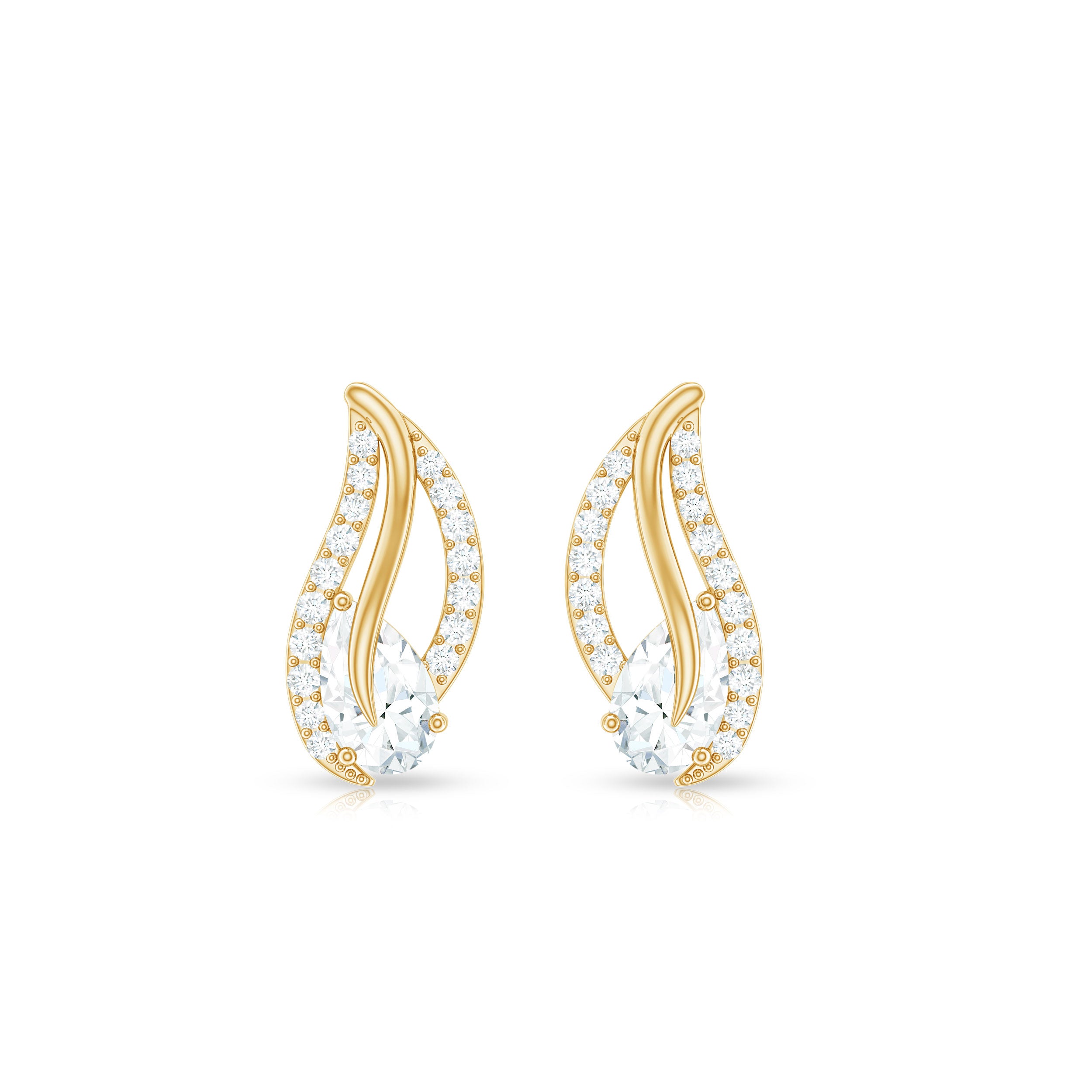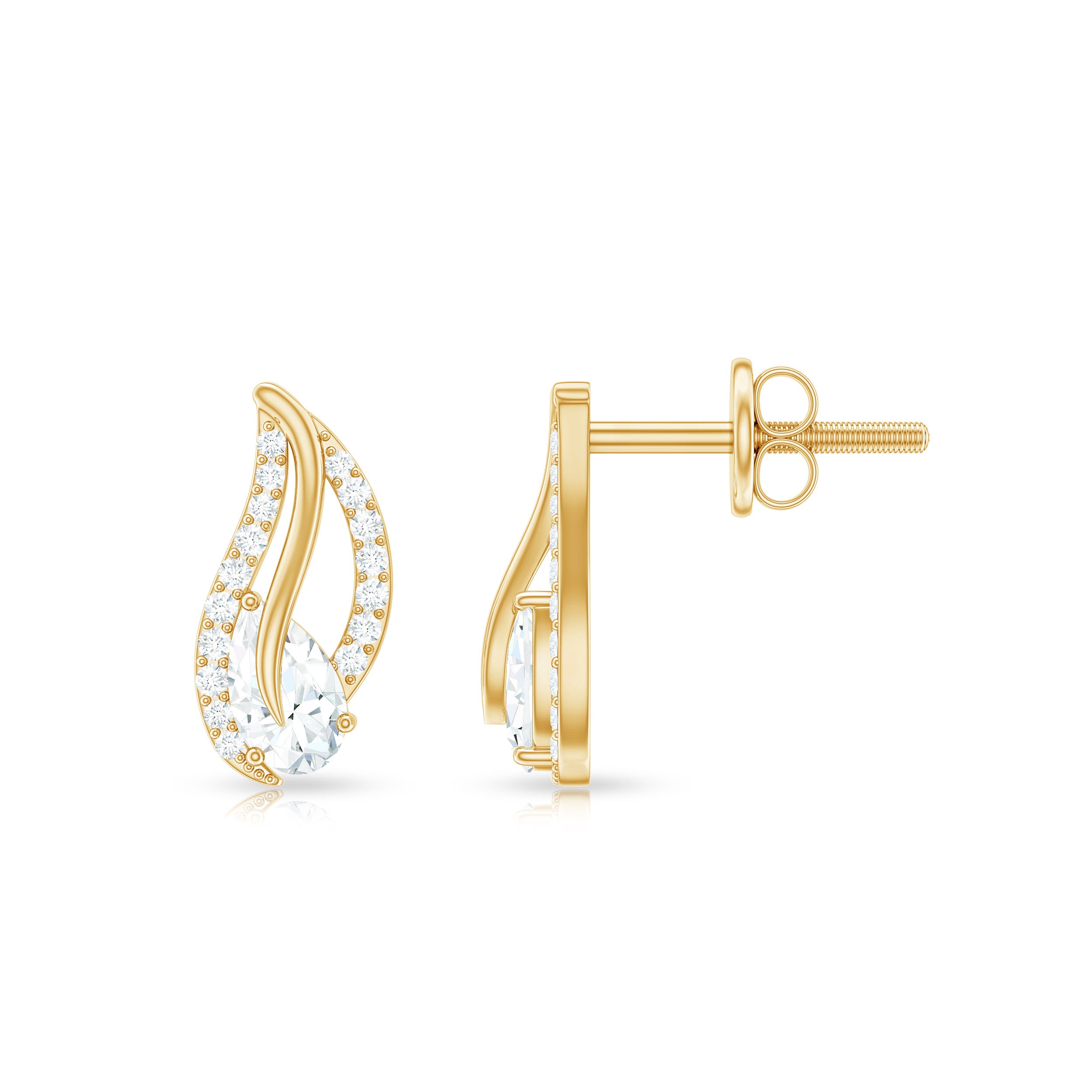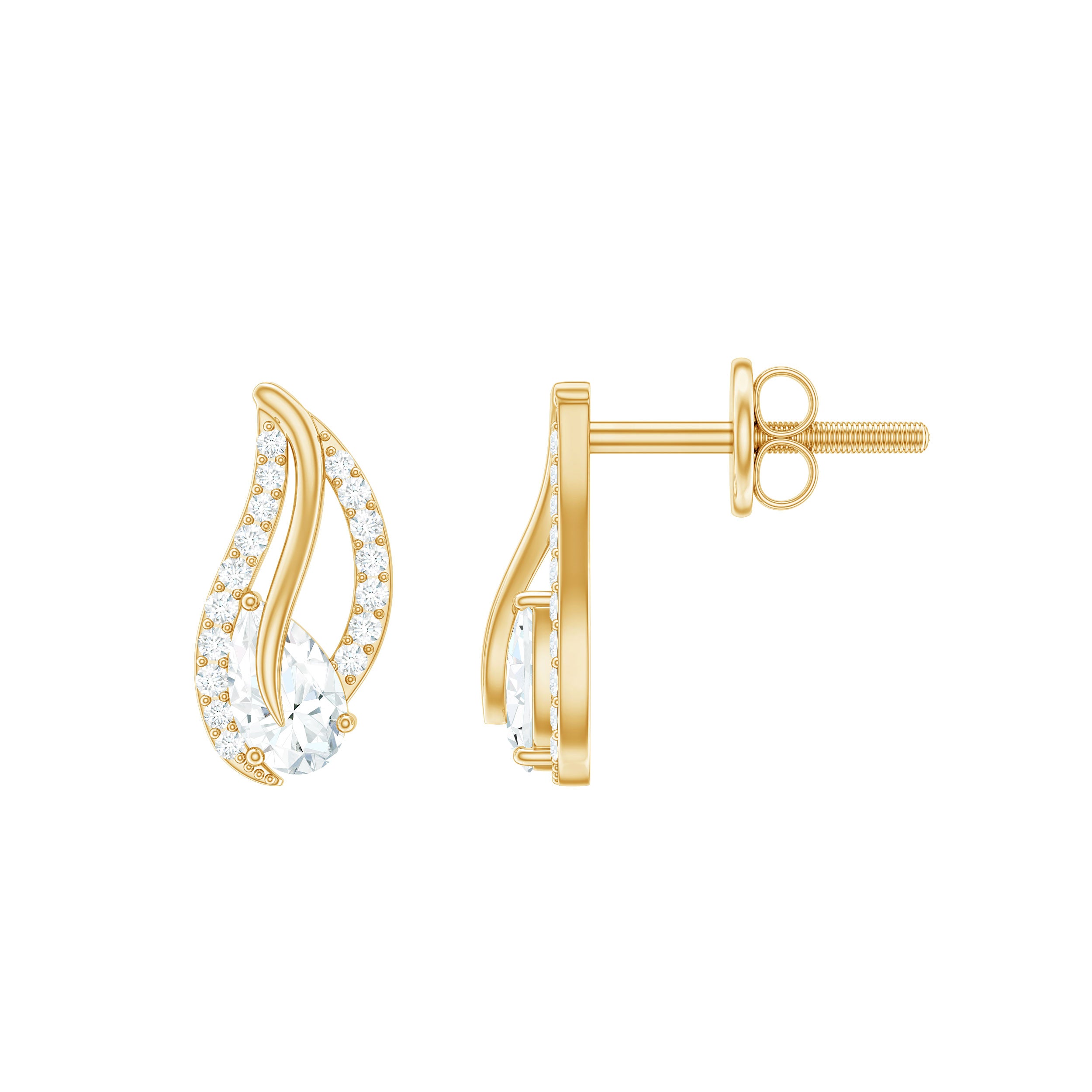 The eternal design symbolizes the never-ending love for nature so, Stay close to nature forever donning these Leaf Inspired Stud Earrings fashioned with Pear Cut Moissanite along with Round Cut Moissanite, set in an Prong Setting. These Moissanite Leaf Earrings have been crafted in Solid Gold along with a Screw Back Closure. Present this designer earrings to your lovely lady and make her eyes shine.