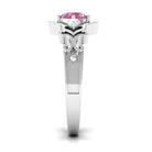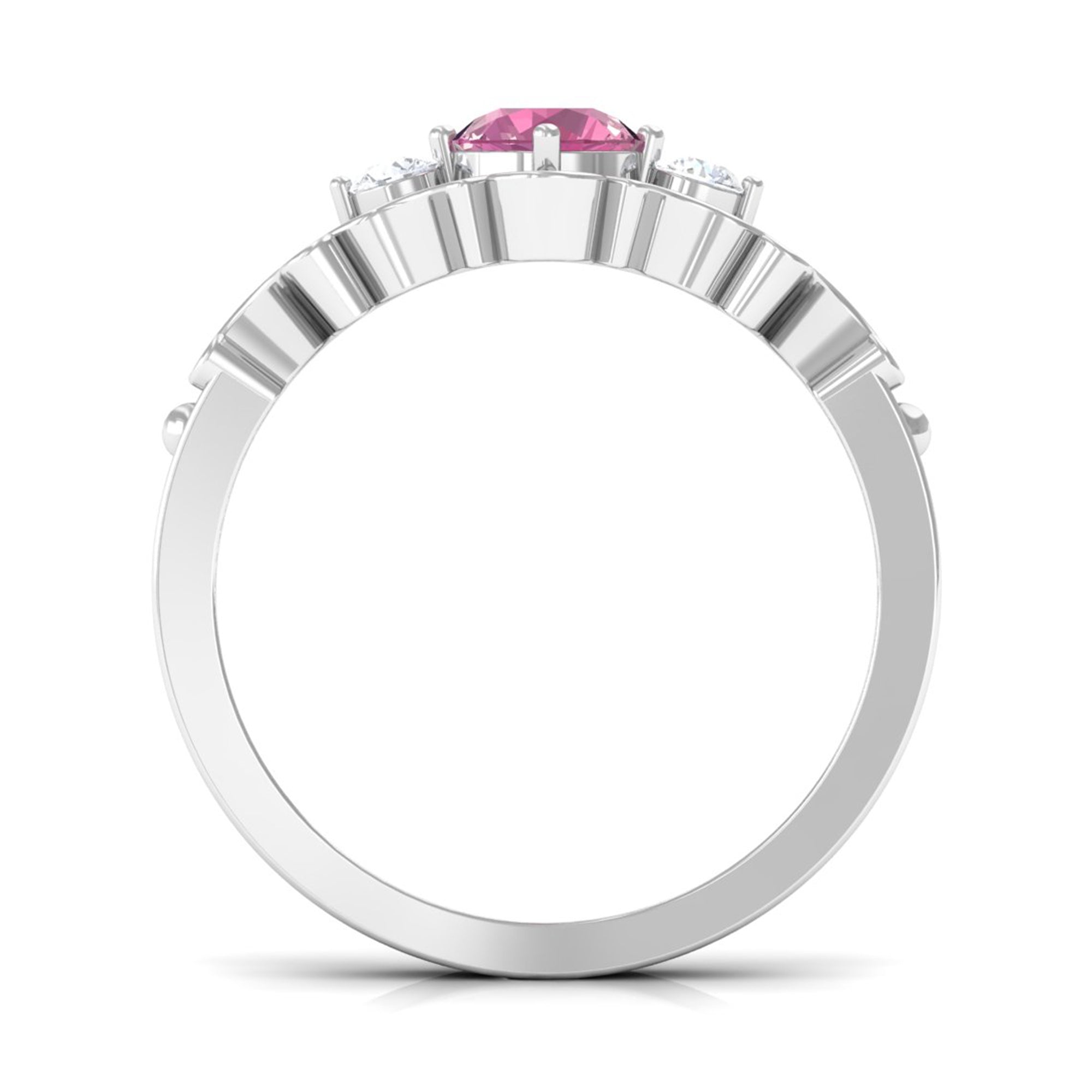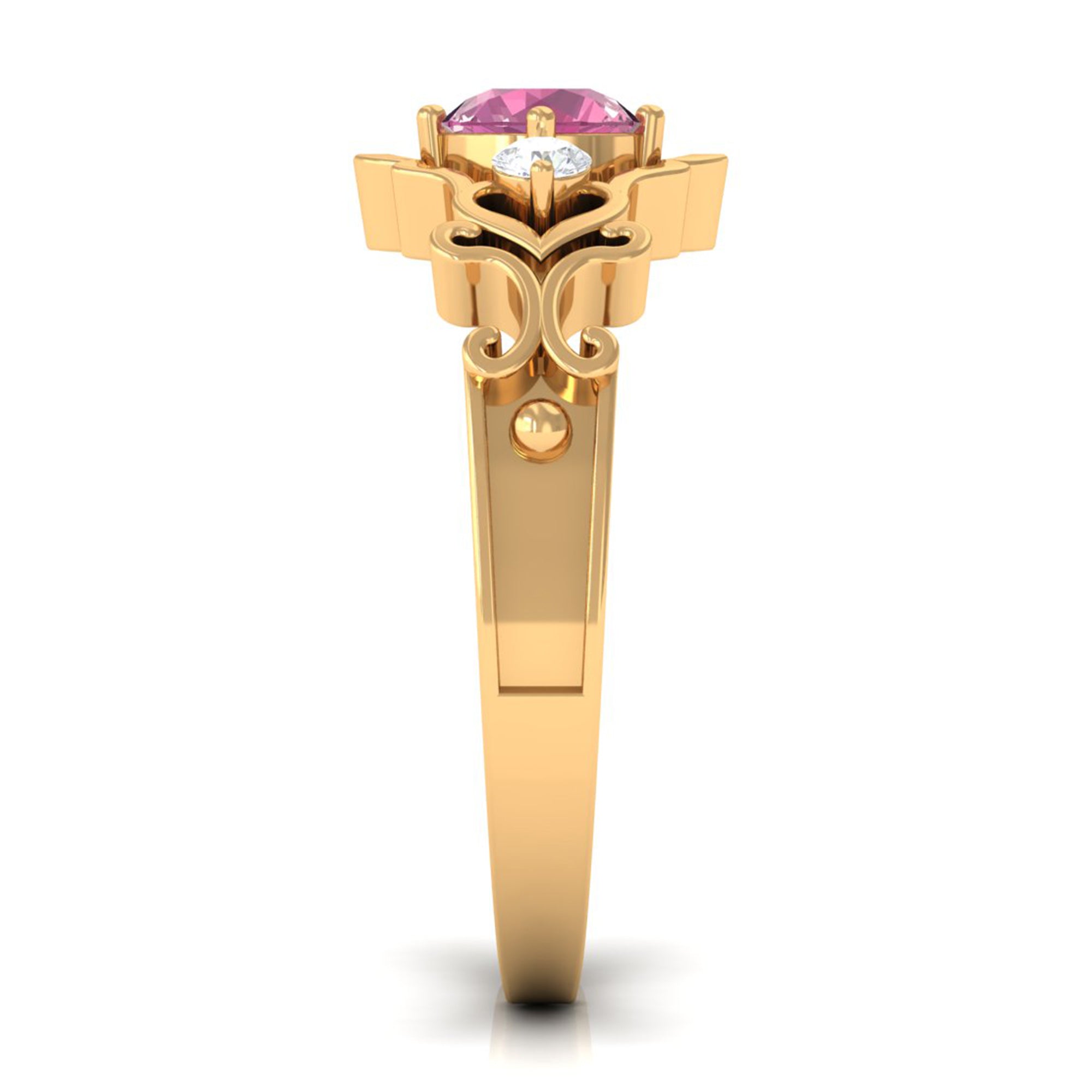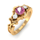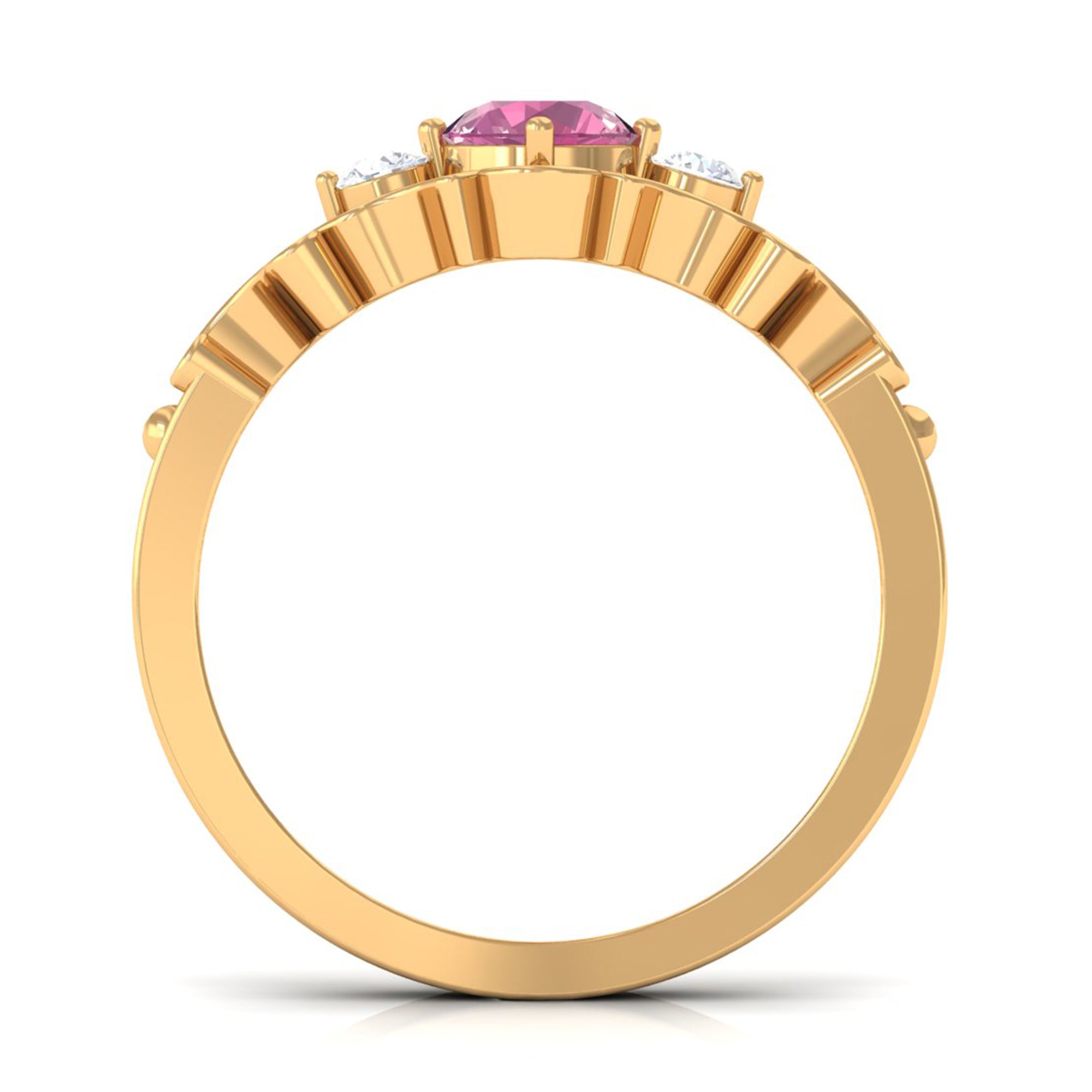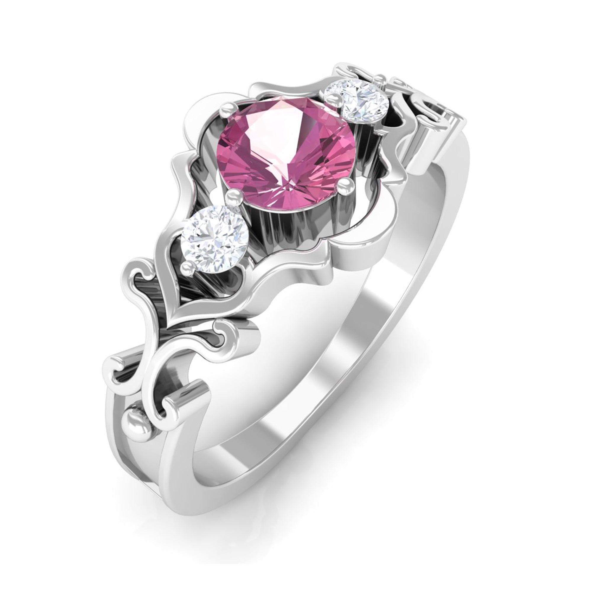 Complete your outfit with this elegantly Gold Cut Work Ring is embellished with Round Shape Pink Tourmaline set as a solitaire in a prong setting and Round Shape Diamond in a prong setting with gold cutout details. This Three Stone Ring is available in solid gold.