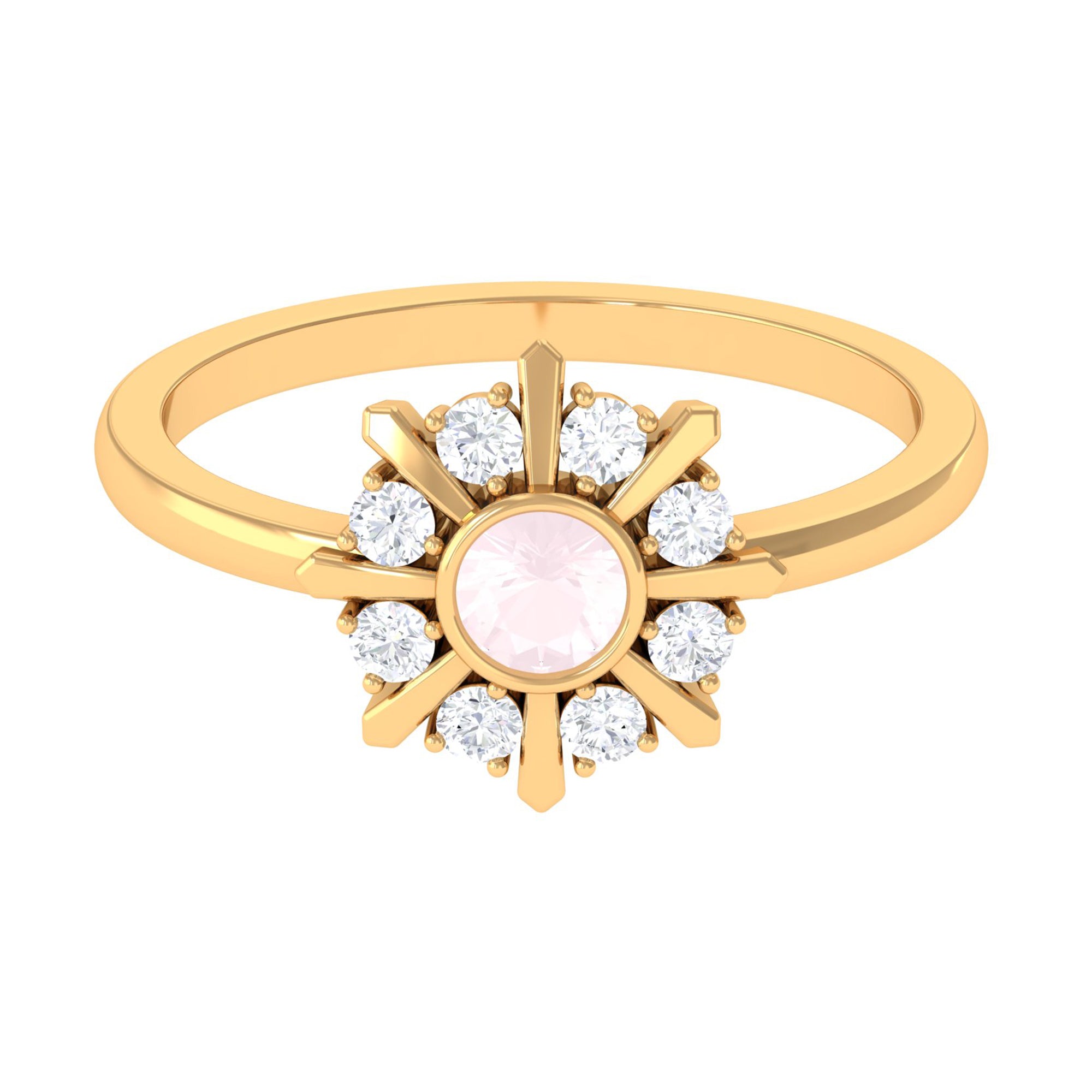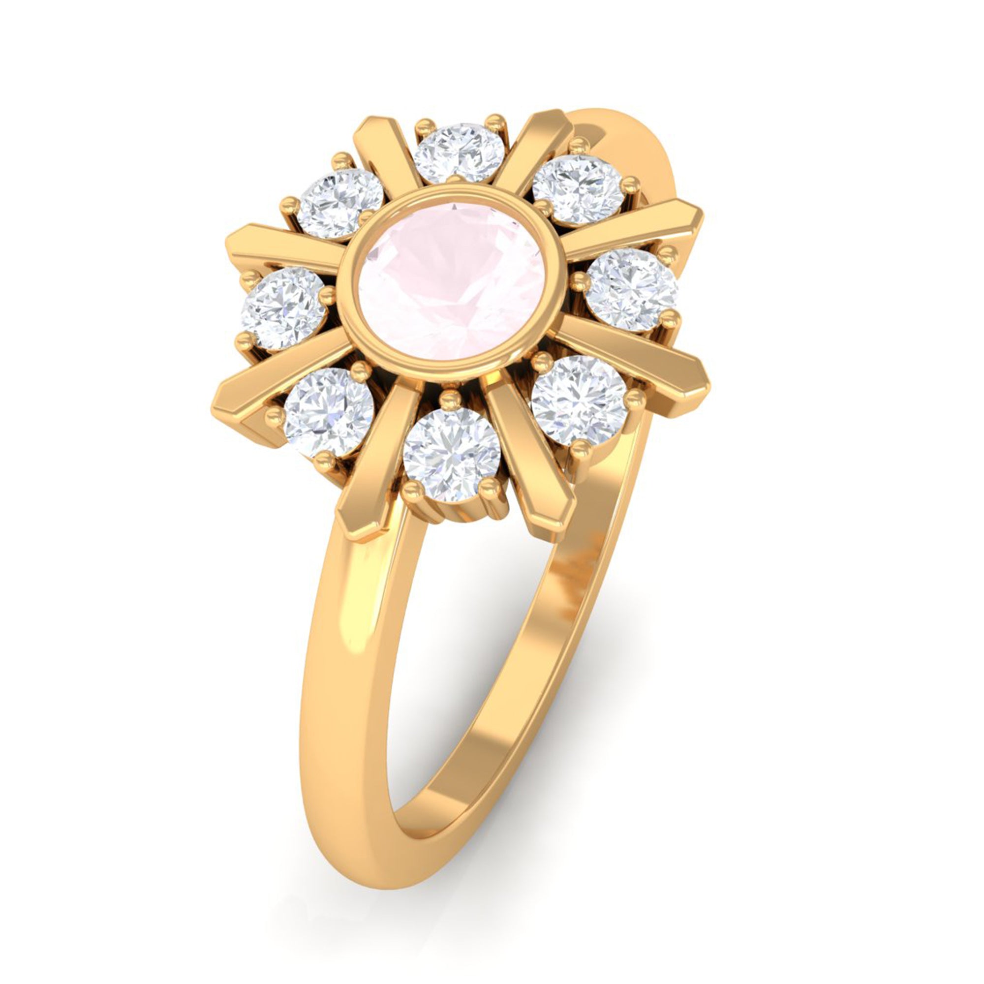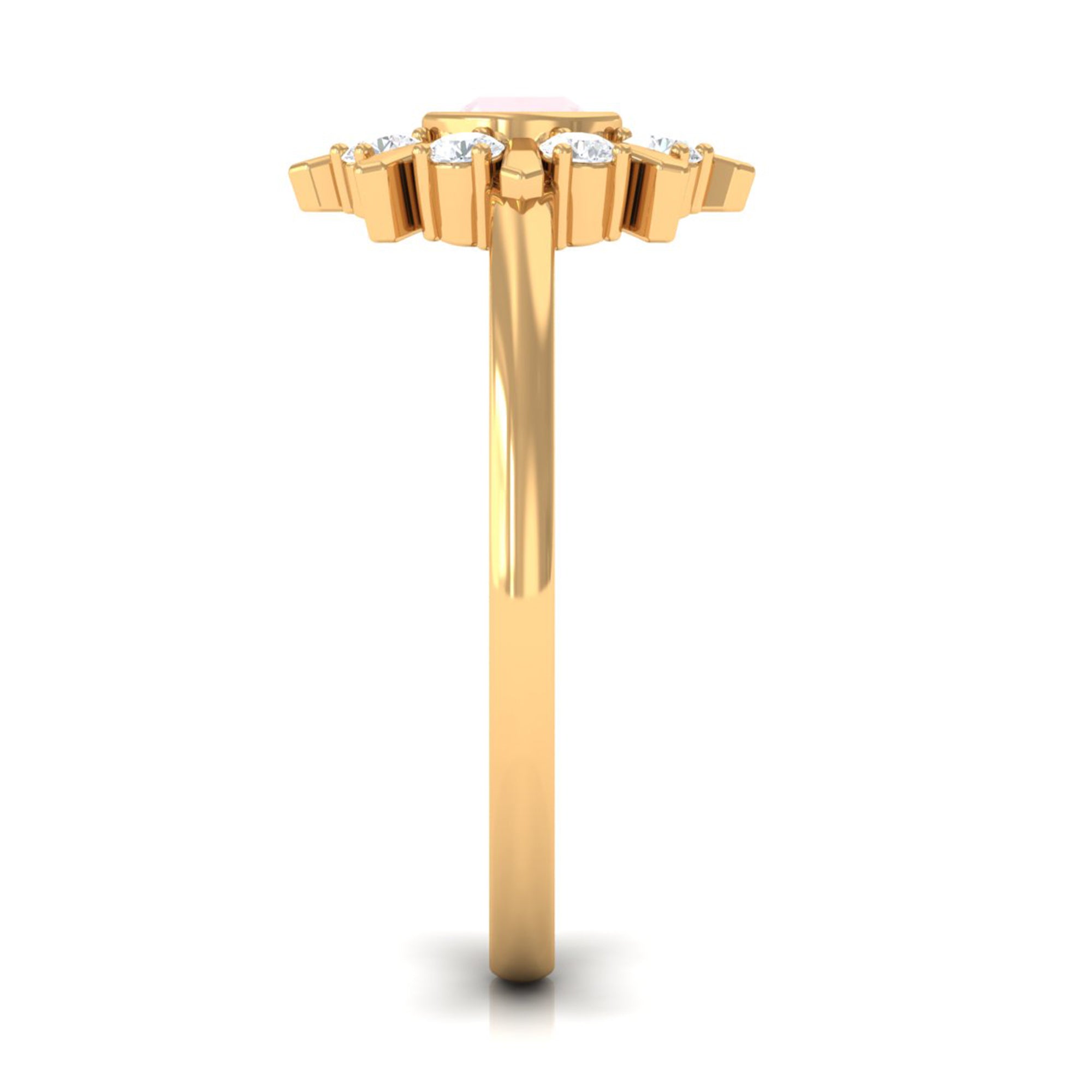 Make a luxurious statement by wearing this elegant Statement Ring adorned with Round Shape Rose Quartz in Bezel Setting with Diamond Stones to add more elegance to the ring. This Rose Quartz and Diamond Ring is crafted with Gold for a luxurious look. Get this adorable Rose Quartz Ring for someone special, something she would adore her whole life.