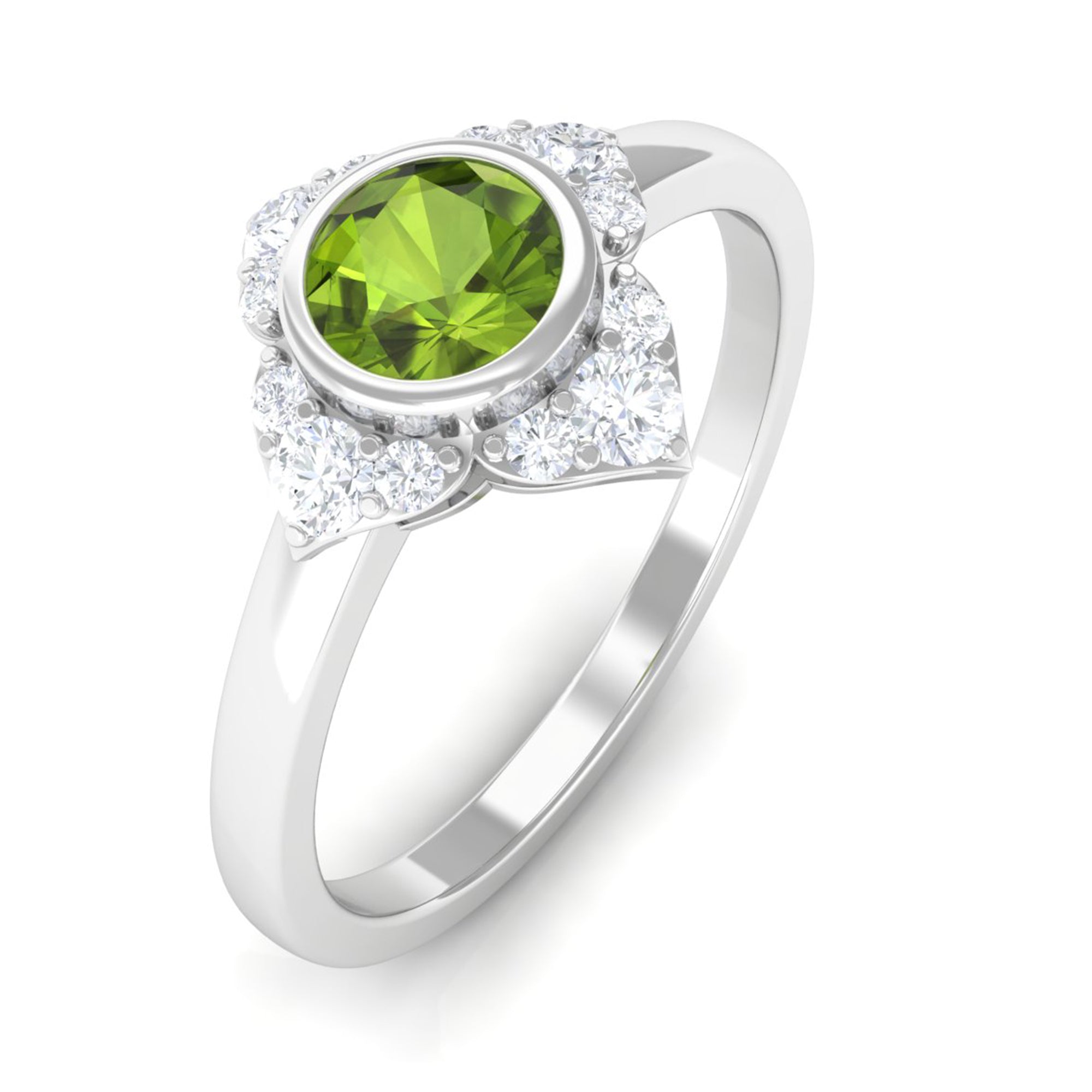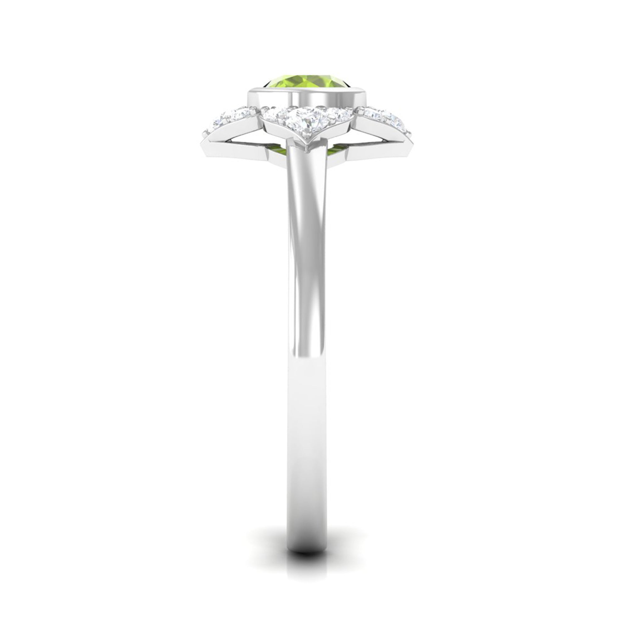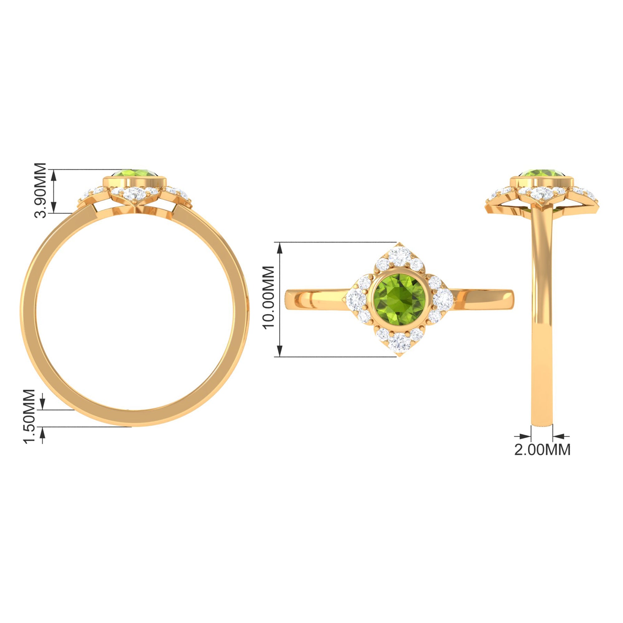 Surprise her with this stunning Vintage Engagement Ring to symbolize your eternal love. Embellished with Round Shape Peridot in Bezel Setting with Diamond Accent, this Flower Engagement Ring is crafted with Gold for a luxurious appearance. This Peridot and Diamond Ring will add more shine to her look and fill her day with compliments.