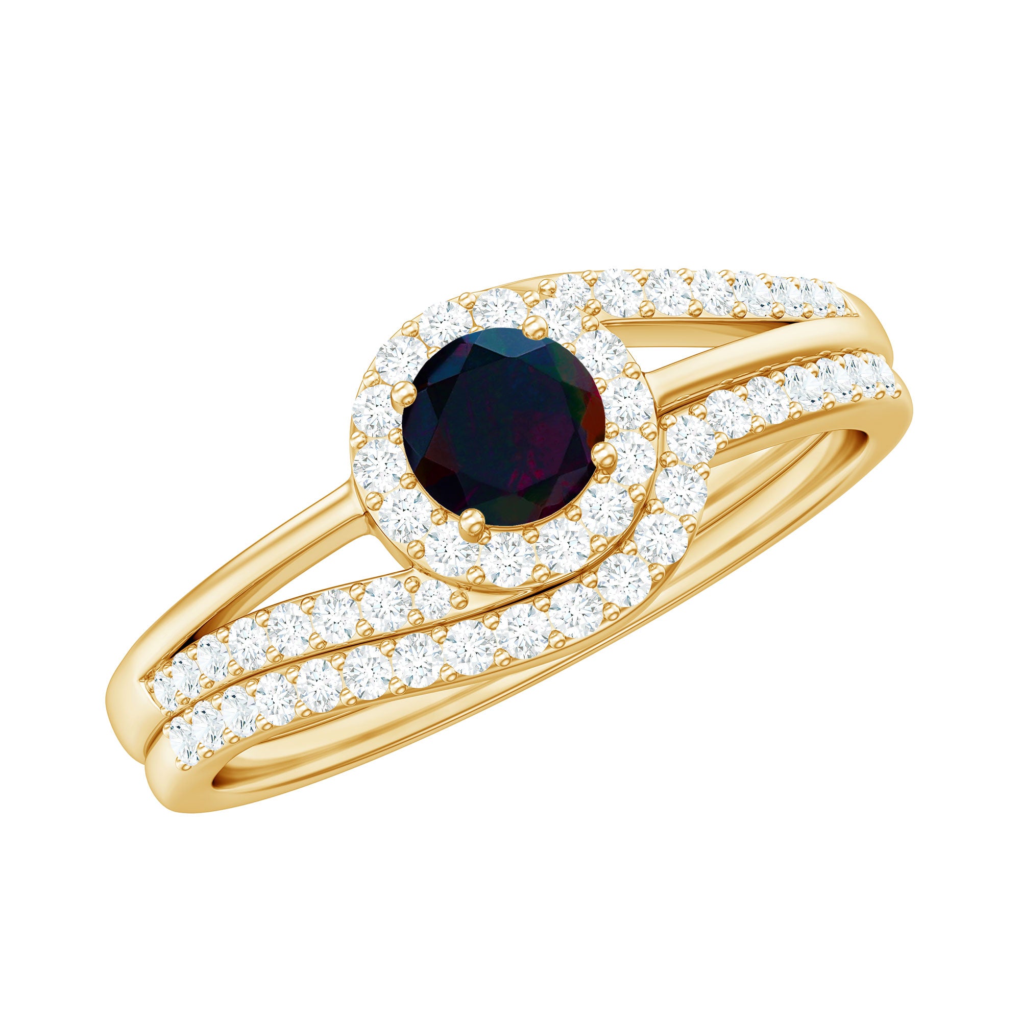 This Engagement Ring with Enhancer is embellished with Round Shape Black Opal is set at the center encircled with Round Shape Diamond and more Diamond are set on the split shank and Enhancer Ring is encased with Round Shape Diamond, crafted in a Solid Gold.