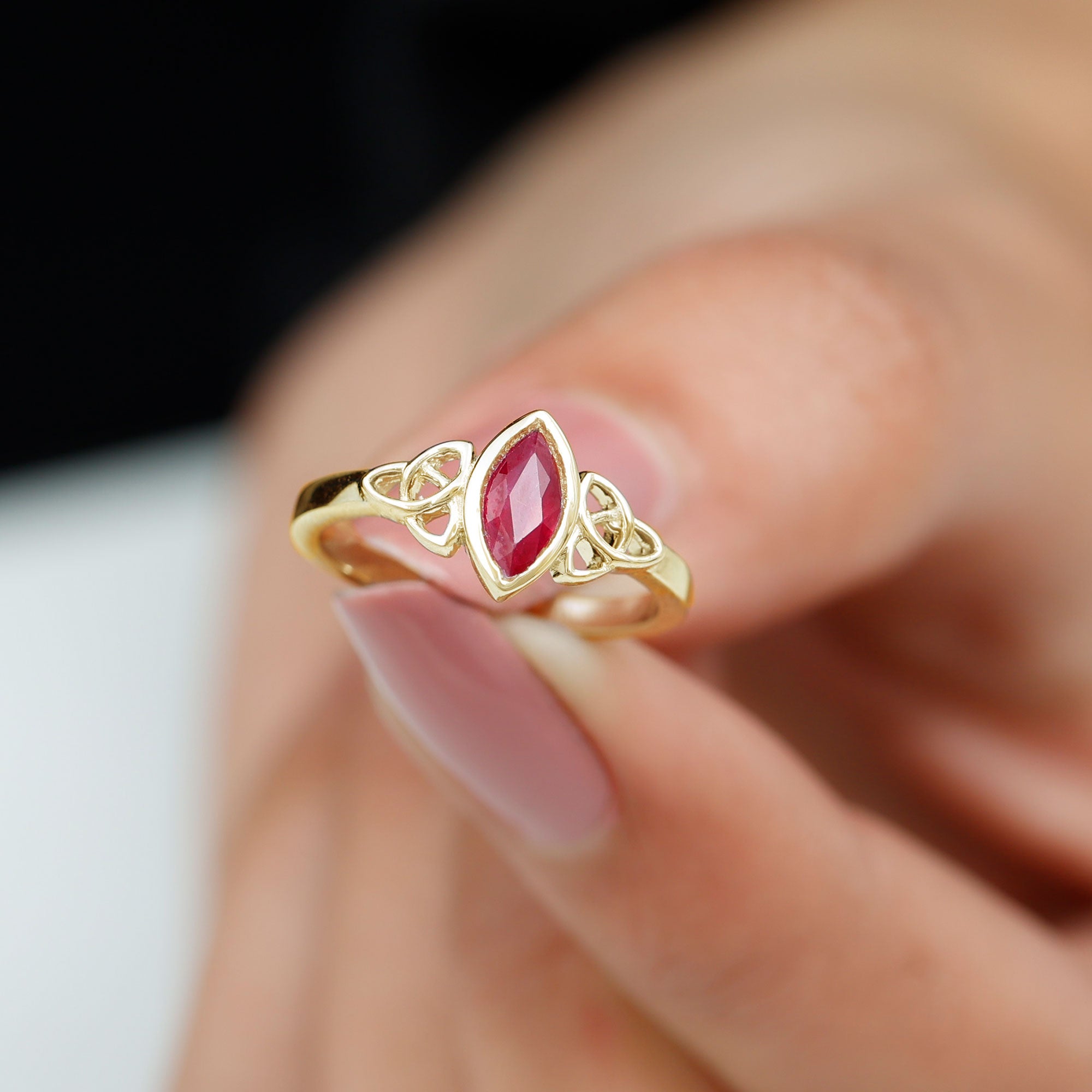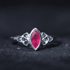 The timeless elegance of this Ruby Promise Ring is a stunning piece of jewelry that could be perfect for commitment, engagements, anniversaries or simply as a statement piece. This Ring is an exquisite jewelry having a vibrant Marquise Shape Red Ruby in Bezel Setting with Celtic knot details, a symbol of eternal love and interconnectedness, adding a touch of ancient charm and craftsmanship. Each curve and twist of the knot in the Celtic Ruby Ring is meticulously crafted, ensuring a seamless blend of tradition and sophistication. This Marquise Ruby Ring captures the essence of both modern luxury and timeless tradition. Elevate your jewelry collection with this extraordinary blend of ruby brilliance and Celtic artistry.