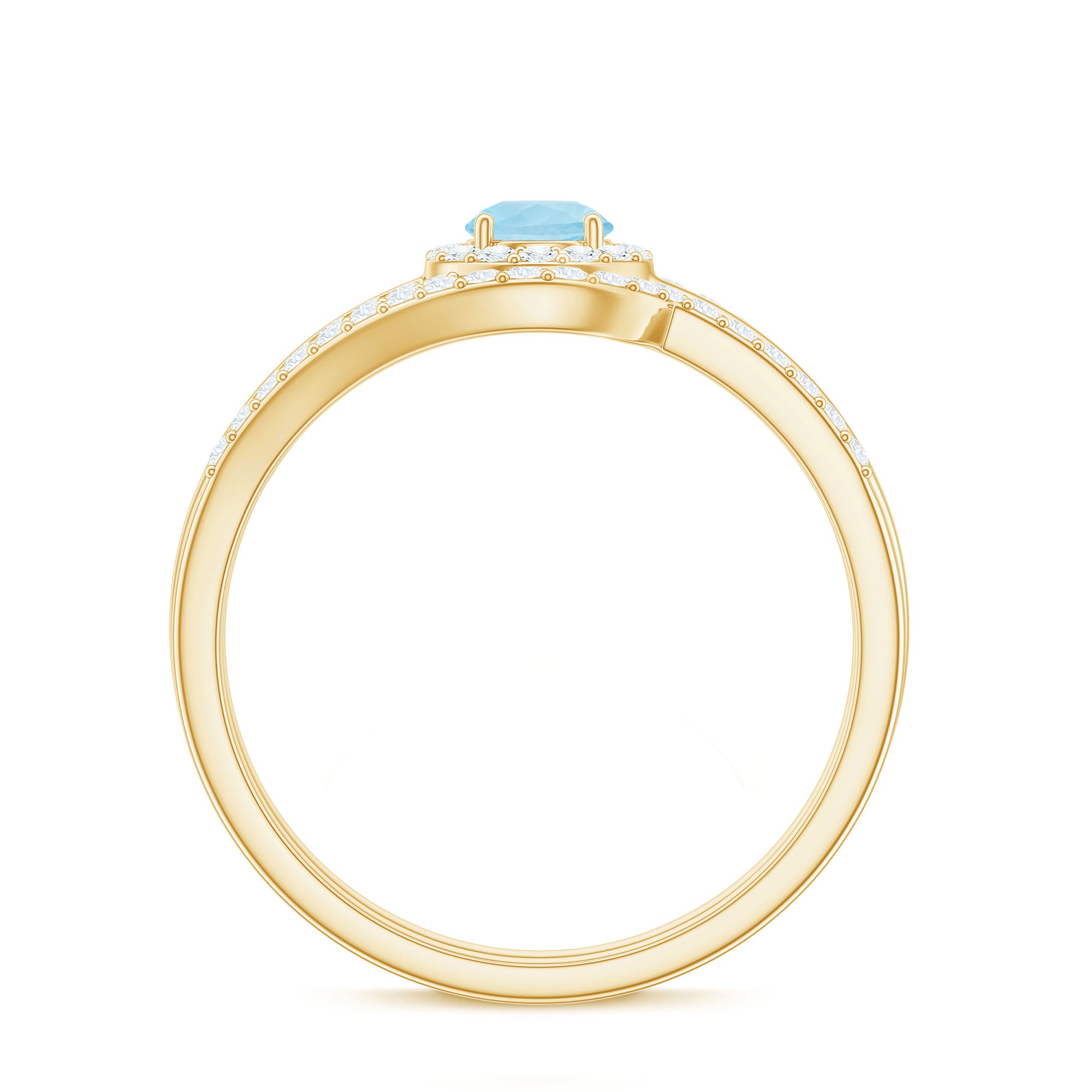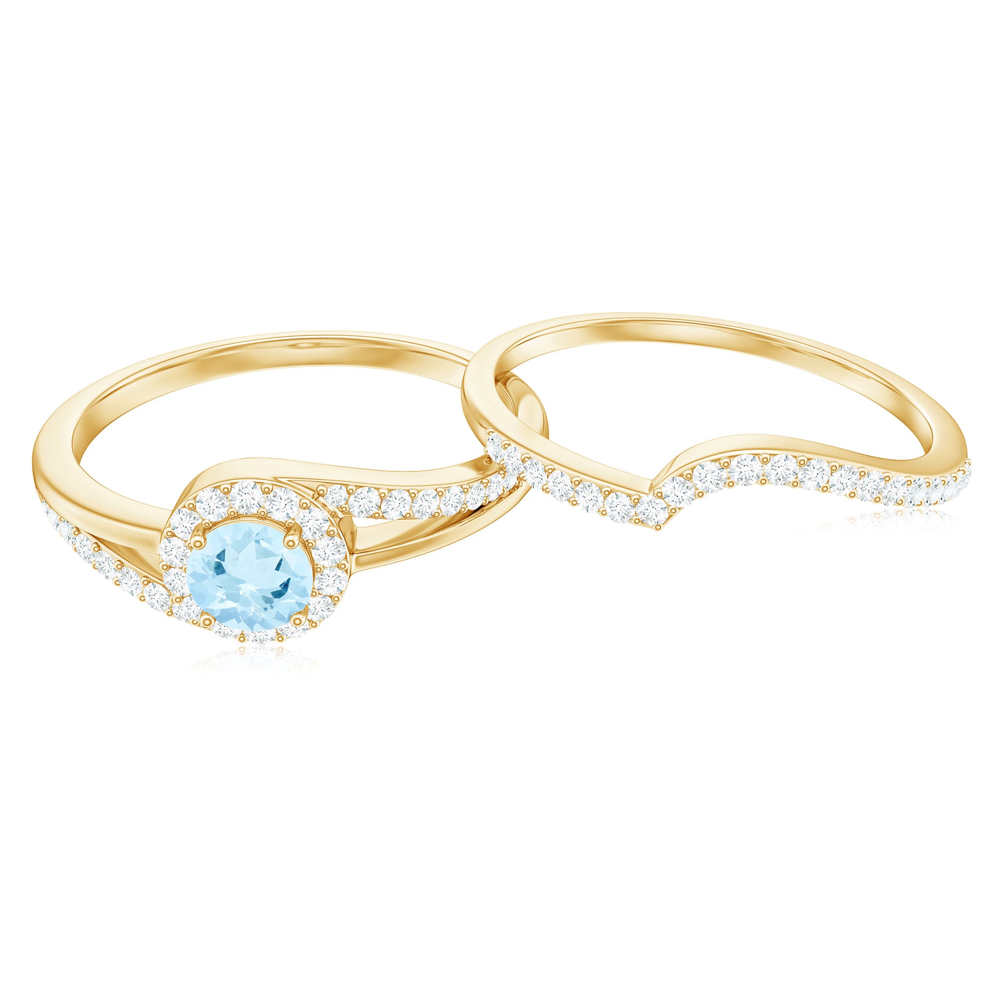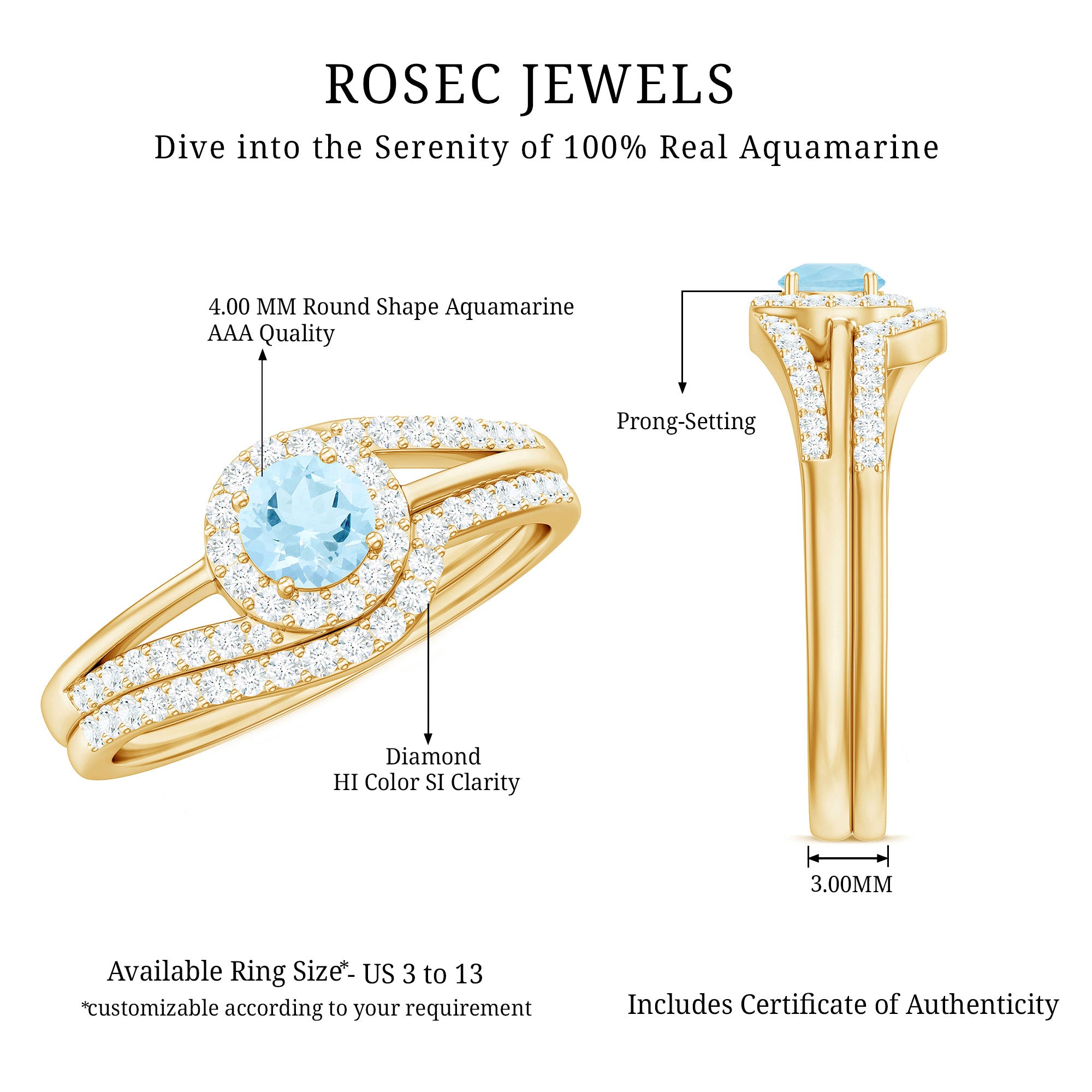 This Engagement Ring with Enhancer is embellished with Round Shape Aquamarine is set at the center encircled with Round Shape Diamond and more Diamond are set on the split shank and Enhancer Ring is encased with Round Shape Diamond, crafted in a Solid Gold.