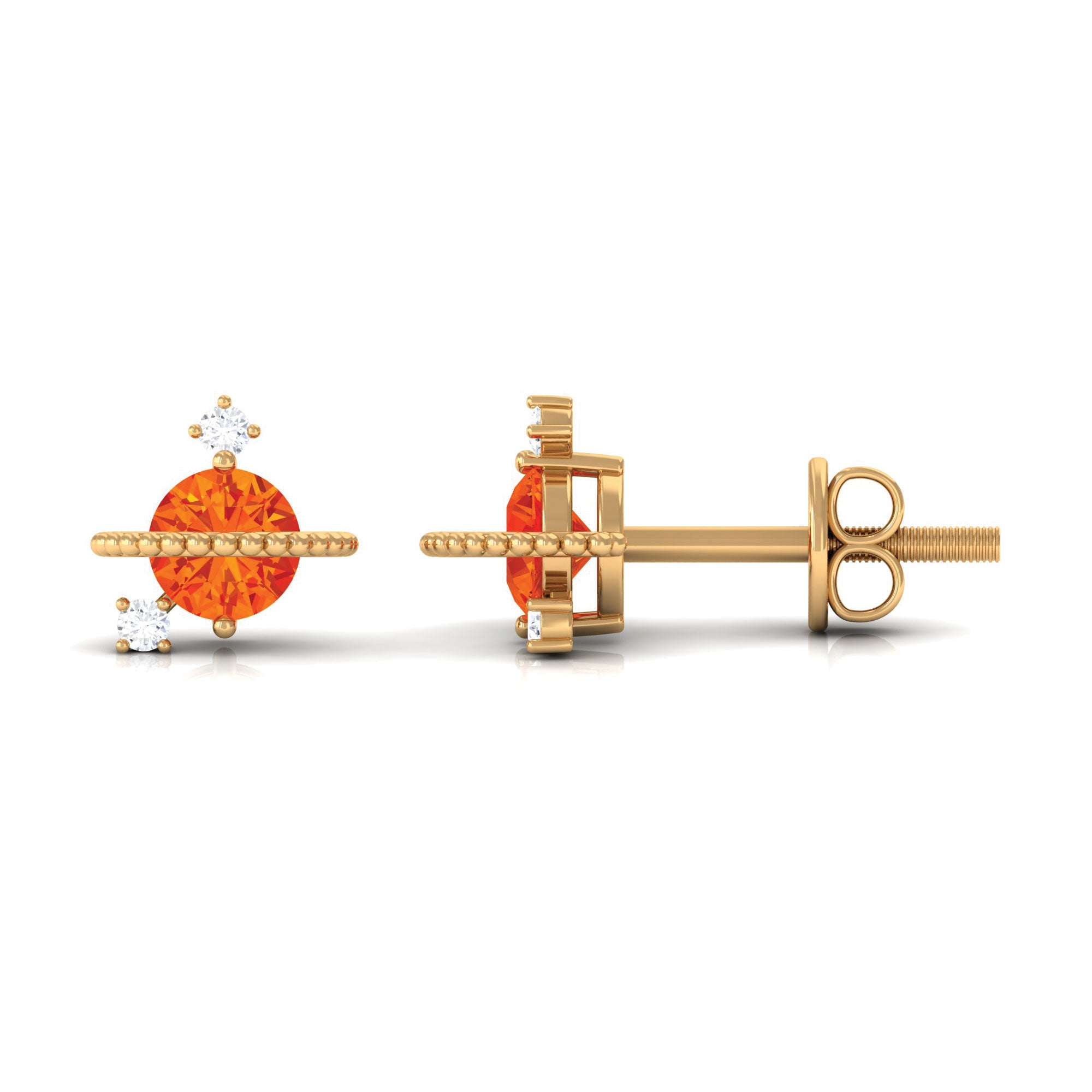 Elevate your style and add a touch of glamour to your look with the Celestial Stud Earrings, featuring a round-shaped Orange Sapphire gemstone and Diamond. These earrings are a beautiful and unique accessory that will add a pop of color to any outfit. The orange sapphire is beautifully contrasted by the sparkling Diamond stones, creating a mesmerizing sparkle. The stud design is easy to wear and versatile, making these earrings perfect for everyday wear or special occasions. The earrings are also nickel-free and hypoallergenic, ensuring that they are safe and comfortable for those with sensitive skin. Whether youre looking for a special gift or a stunning accessory to add to your own jewelry collection, these Celestial Stud Earrings are sure to impress.