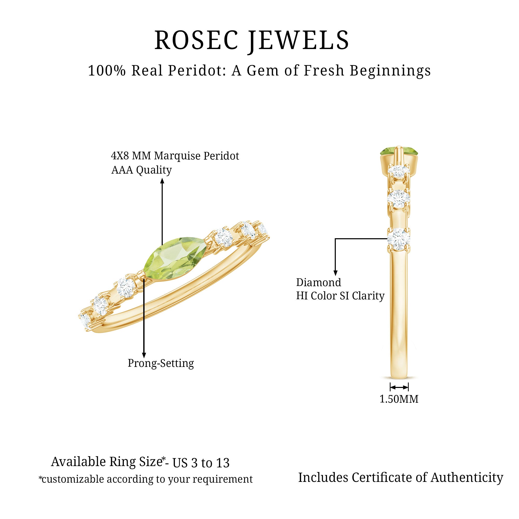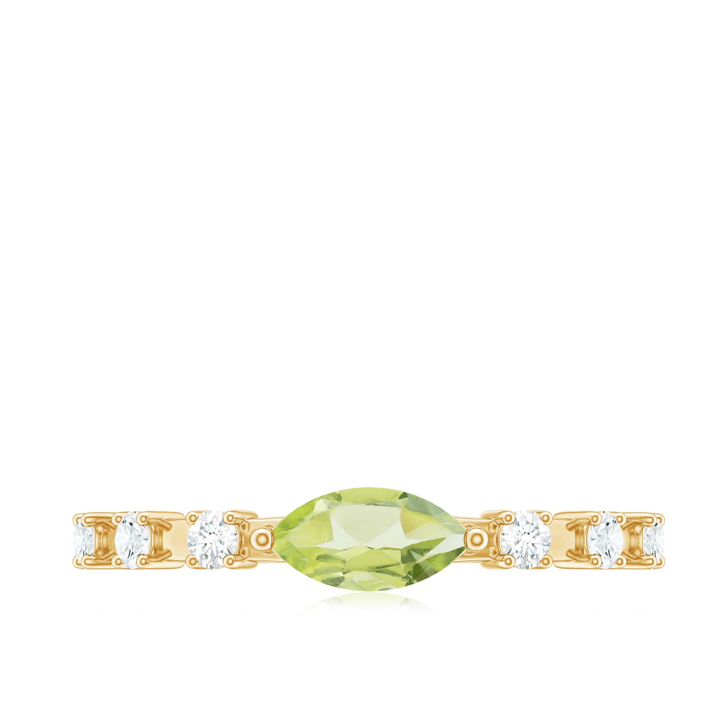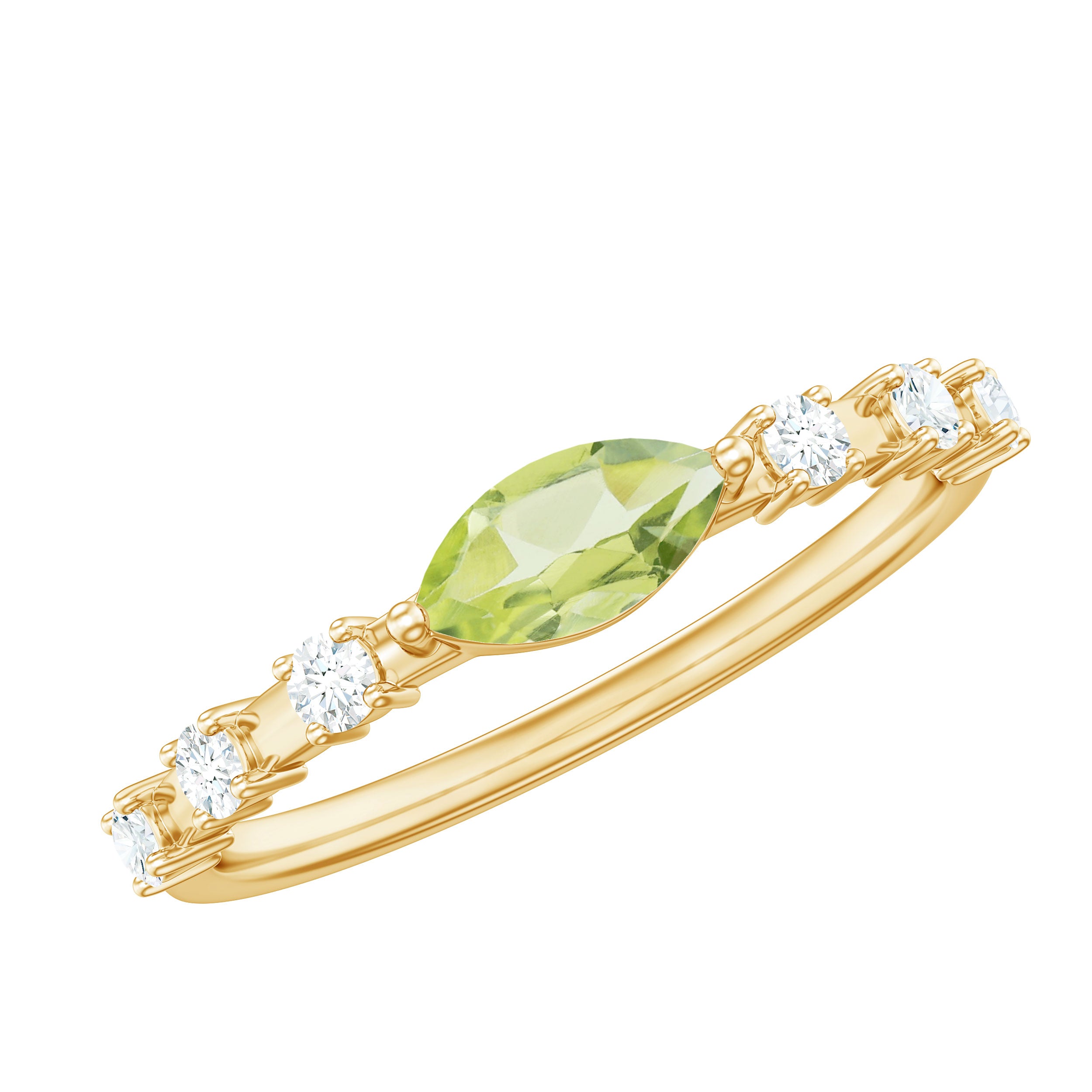 Adorn yourself with this elegant East West Ring embellished with Marquise Cut Peridot in 2 Prong Setting with Round Shape Diamond Stones. This Peridot and Diamond Ring is crafted with Gold for a stunning look. Surprise your love with this alluring Peridot Ring and make her heart flutter.