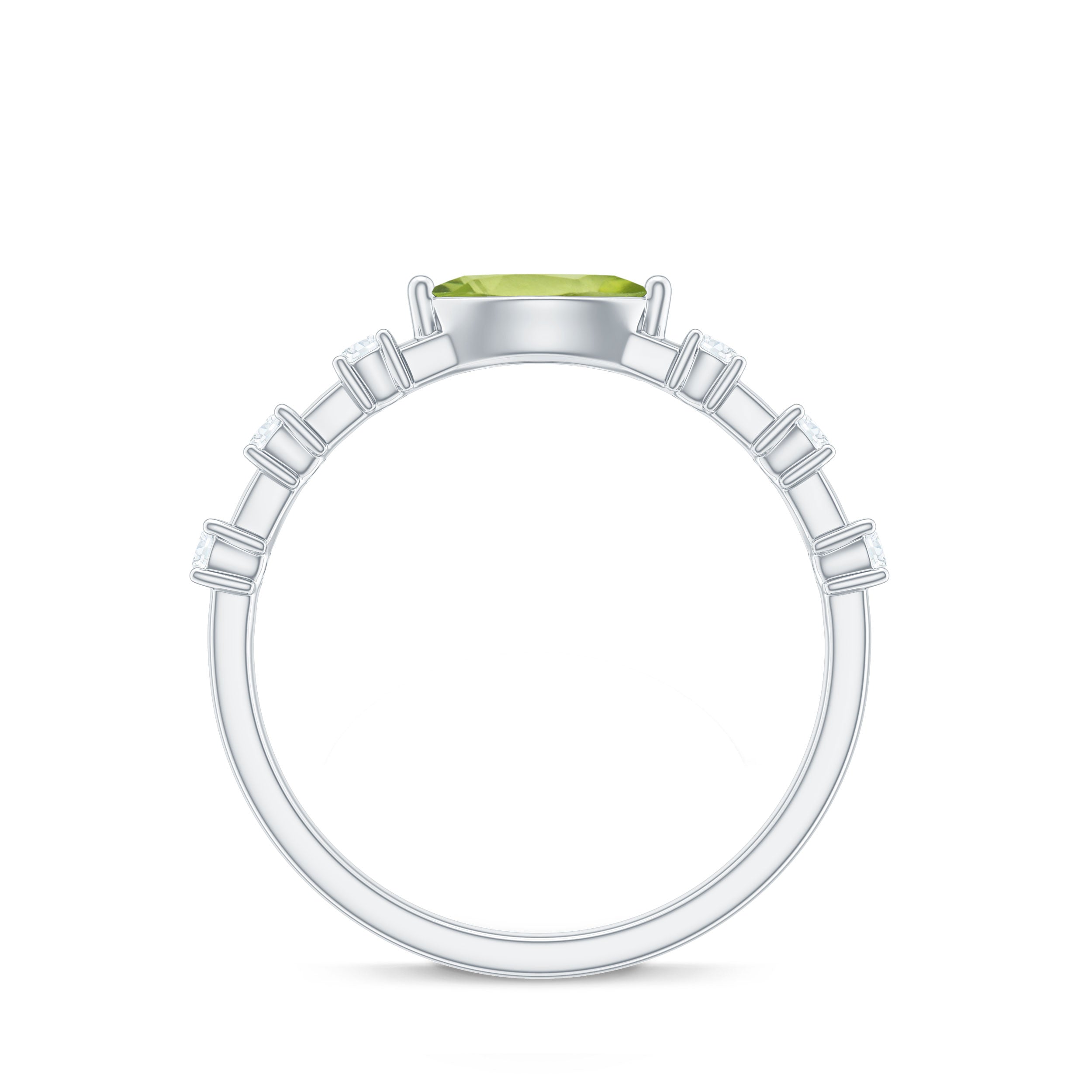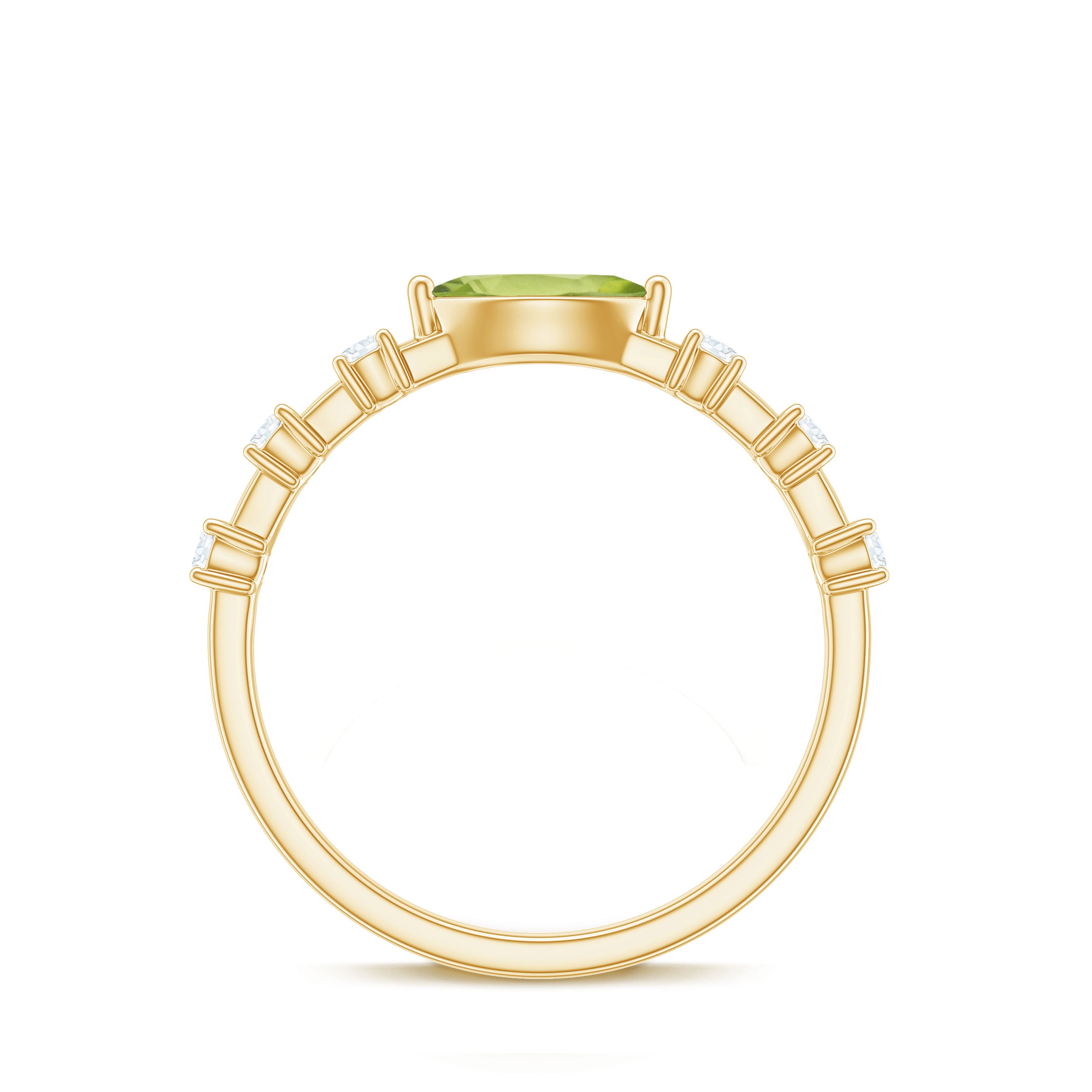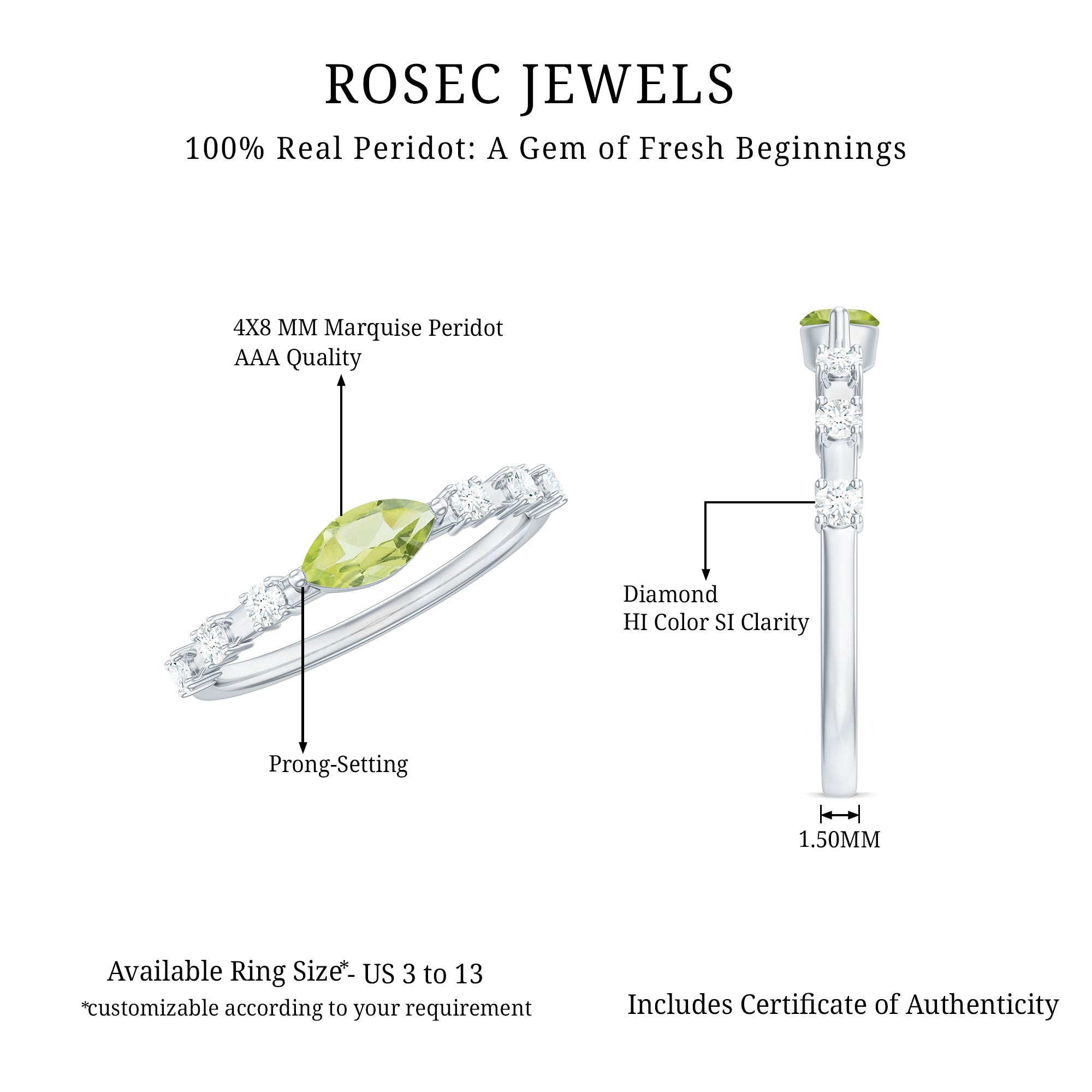 Adorn yourself with this elegant East West Ring embellished with Marquise Cut Peridot in 2 Prong Setting with Round Shape Diamond Stones. This Peridot and Diamond Ring is crafted with Gold for a stunning look. Surprise your love with this alluring Peridot Ring and make her heart flutter.