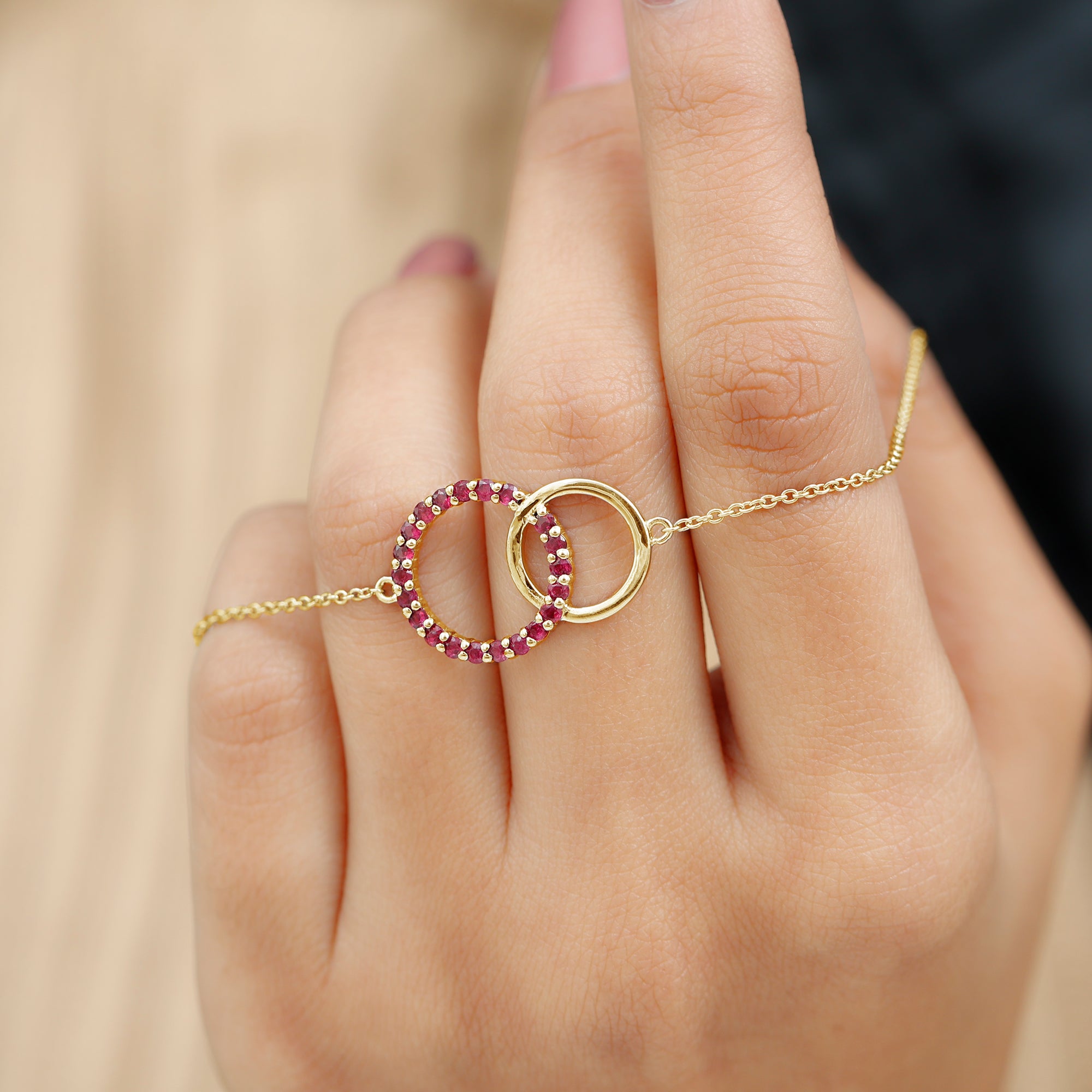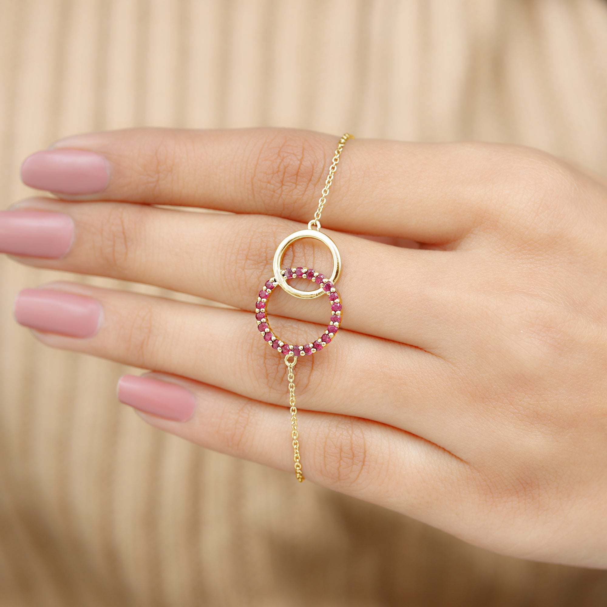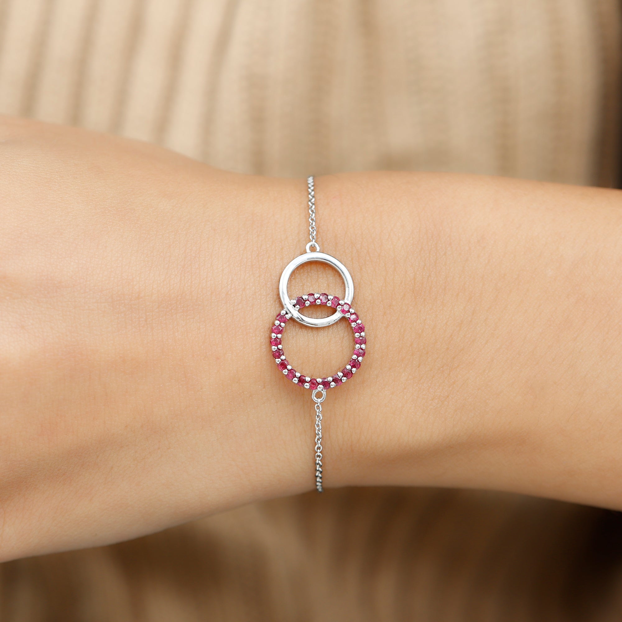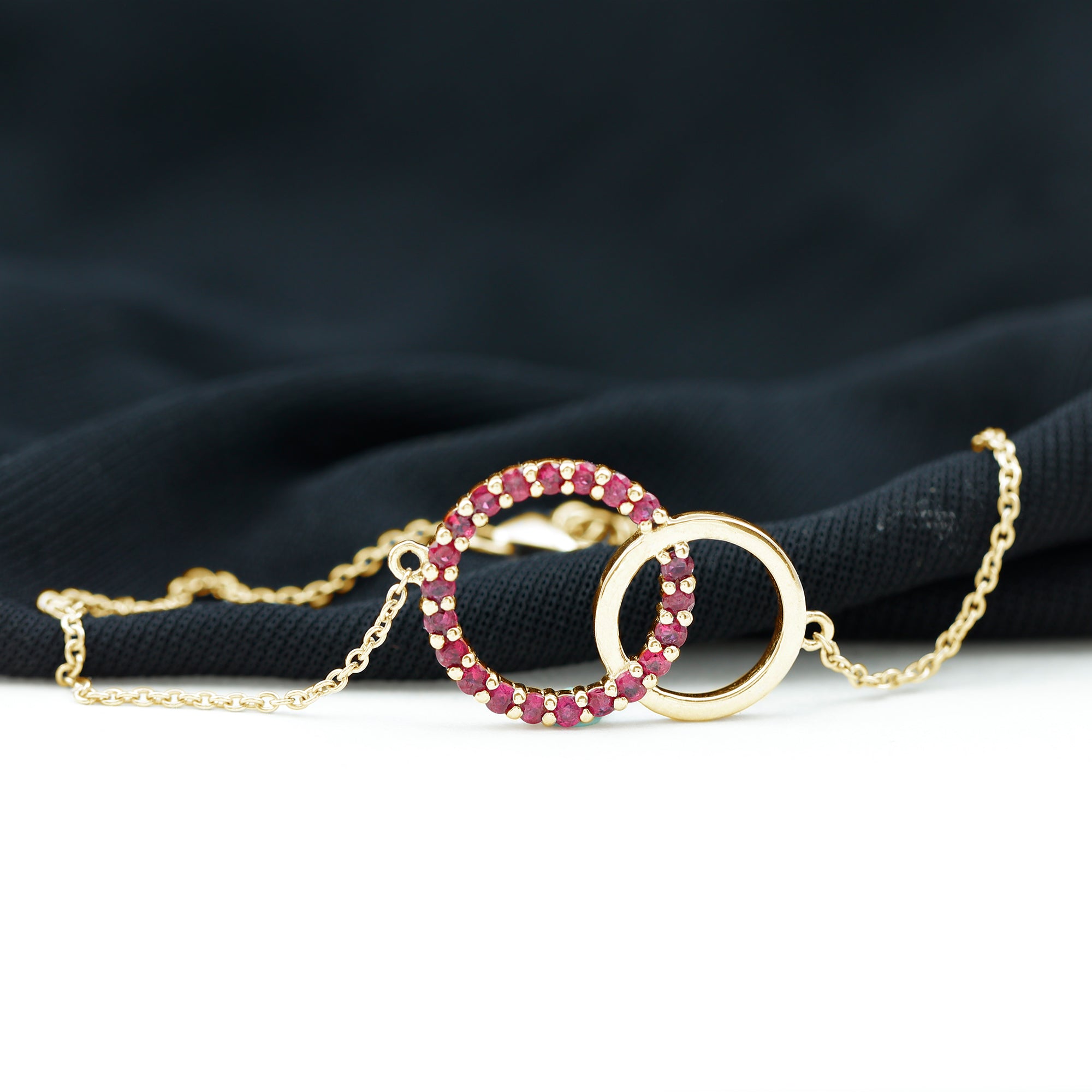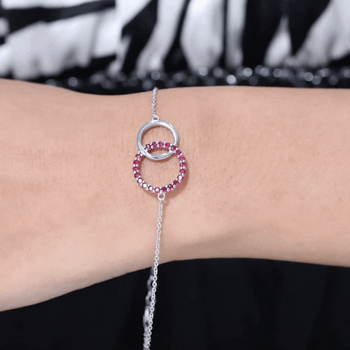 This Valentines Day Bracelet is ornamented with Round Cut Ruby Gemstones, set in a Prong Setting. This Beautiful Ruby Bracelet is an Interlock Bracelet. It is a Chain Bracelet.