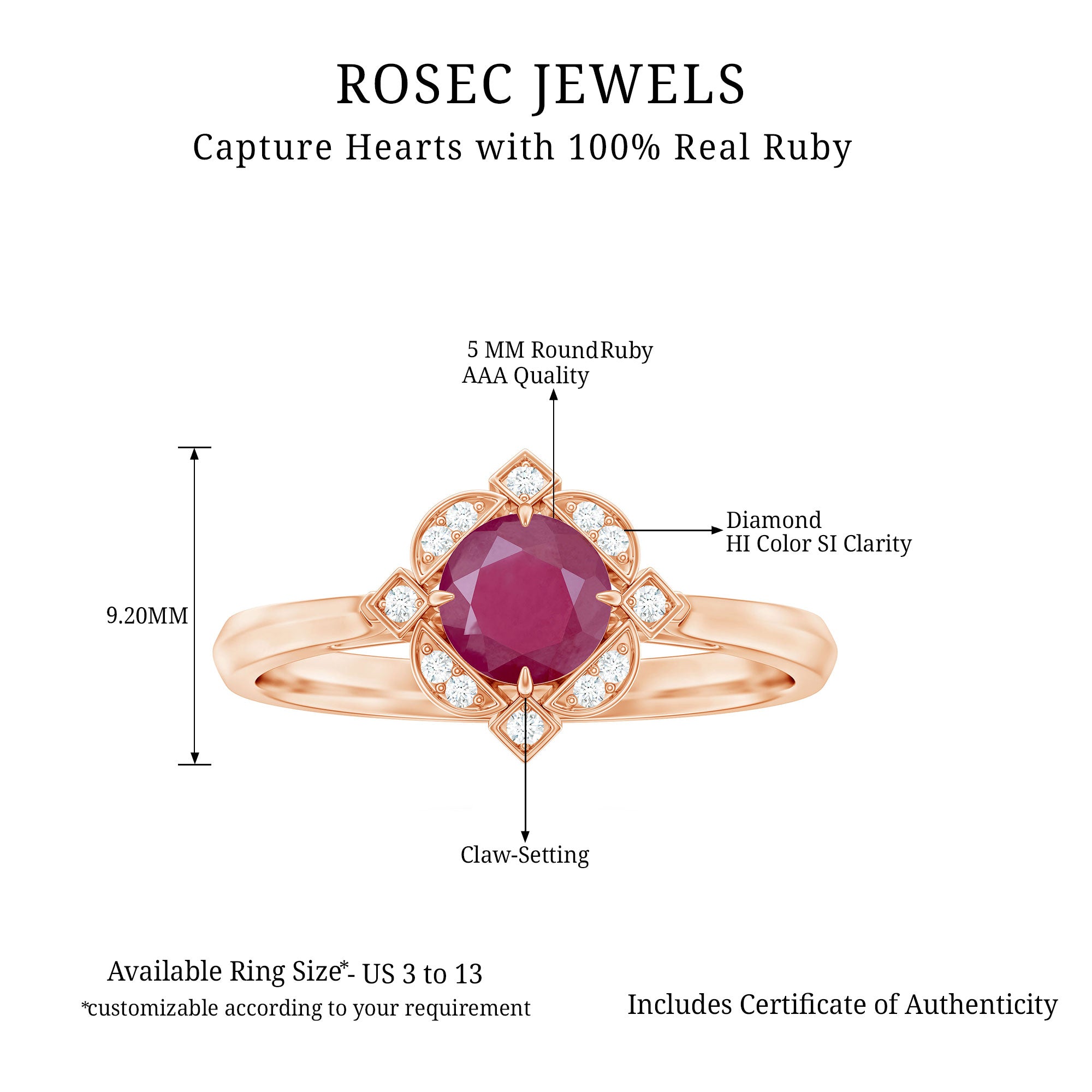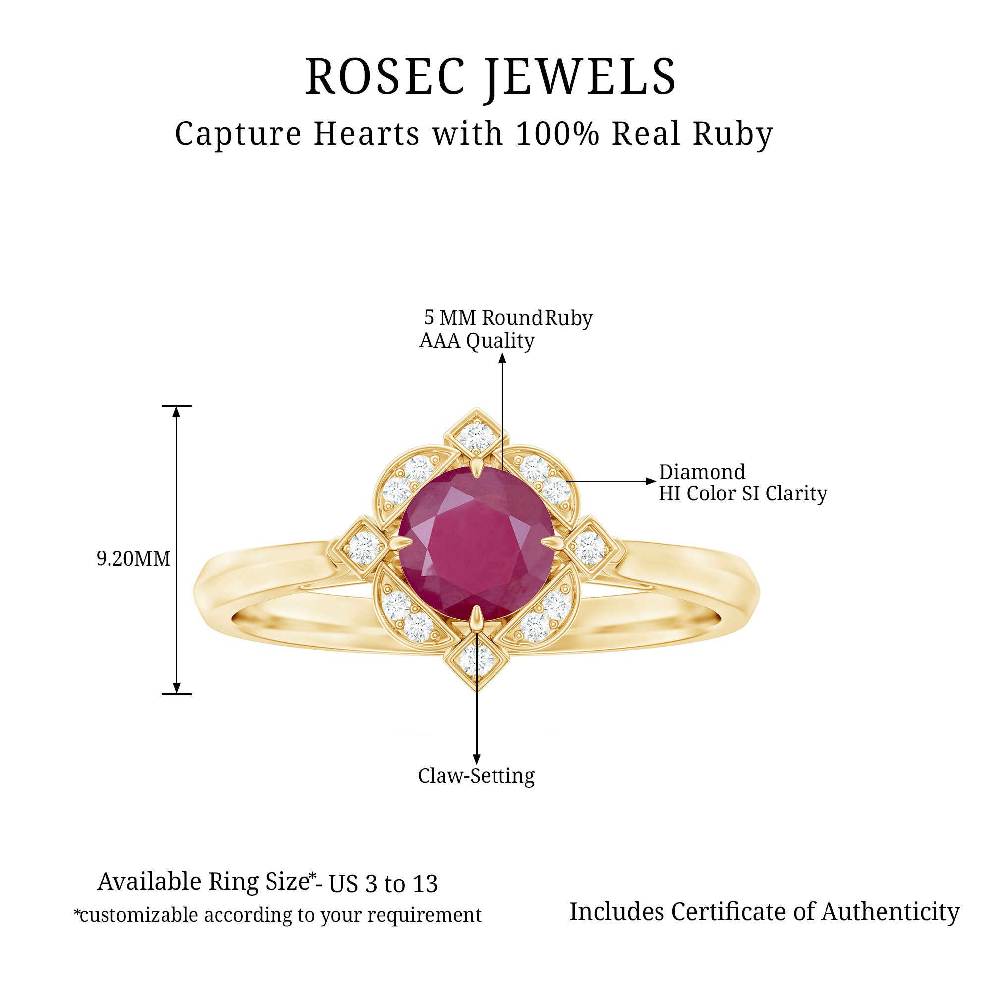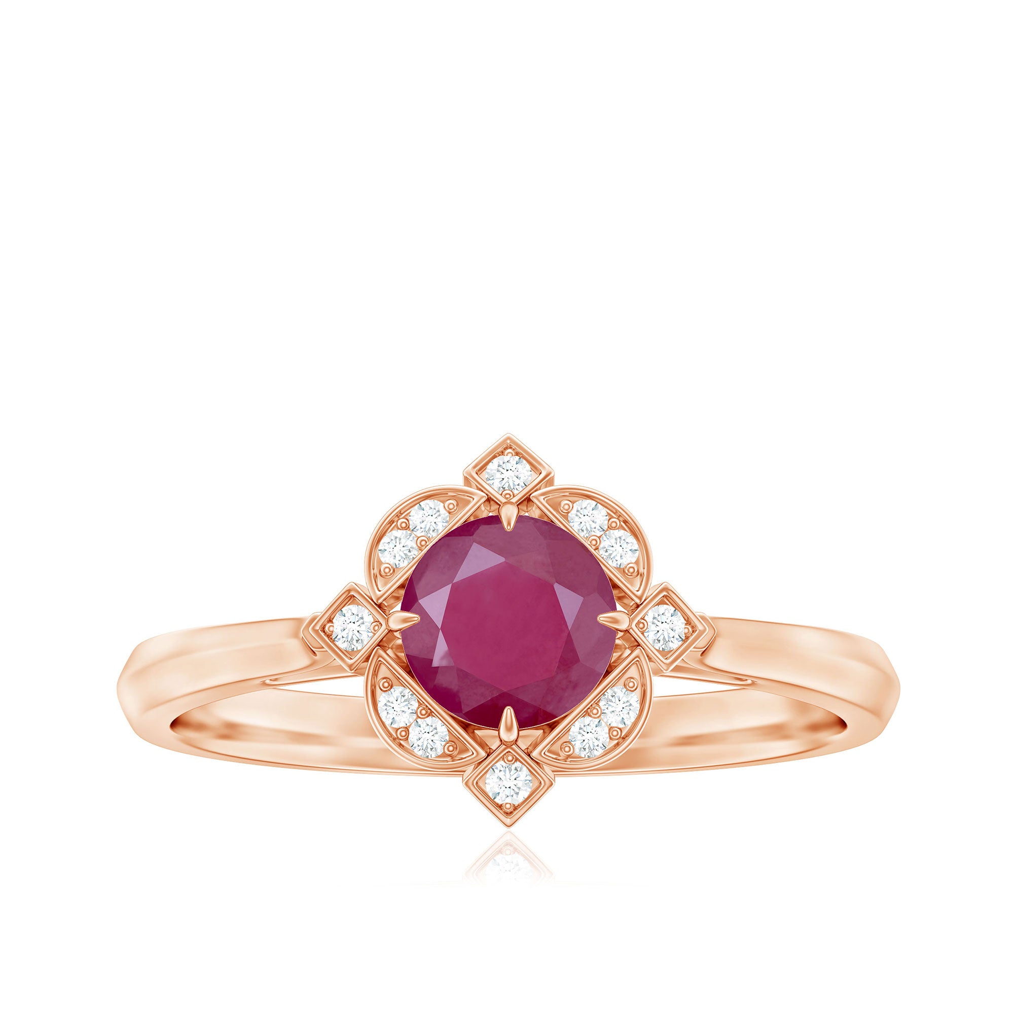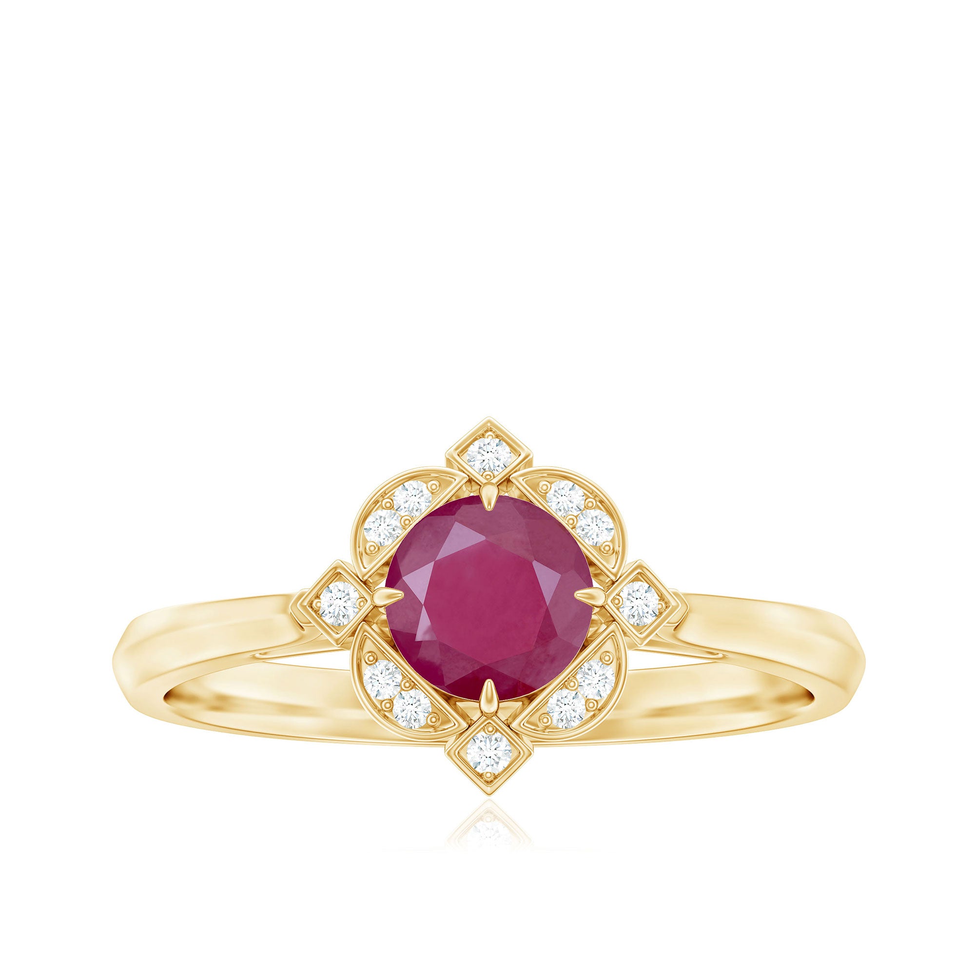 Feel the Vintage Vibes with our Vintage Inspired Ruby Engagement Ring. It is embellished with Round Shape Ruby as Centre Stone in Four Claw Setting with Diamond Accent. This Ruby and Diamond Engagement Ring is a stunning jewelry, which she will cherish her whole life.