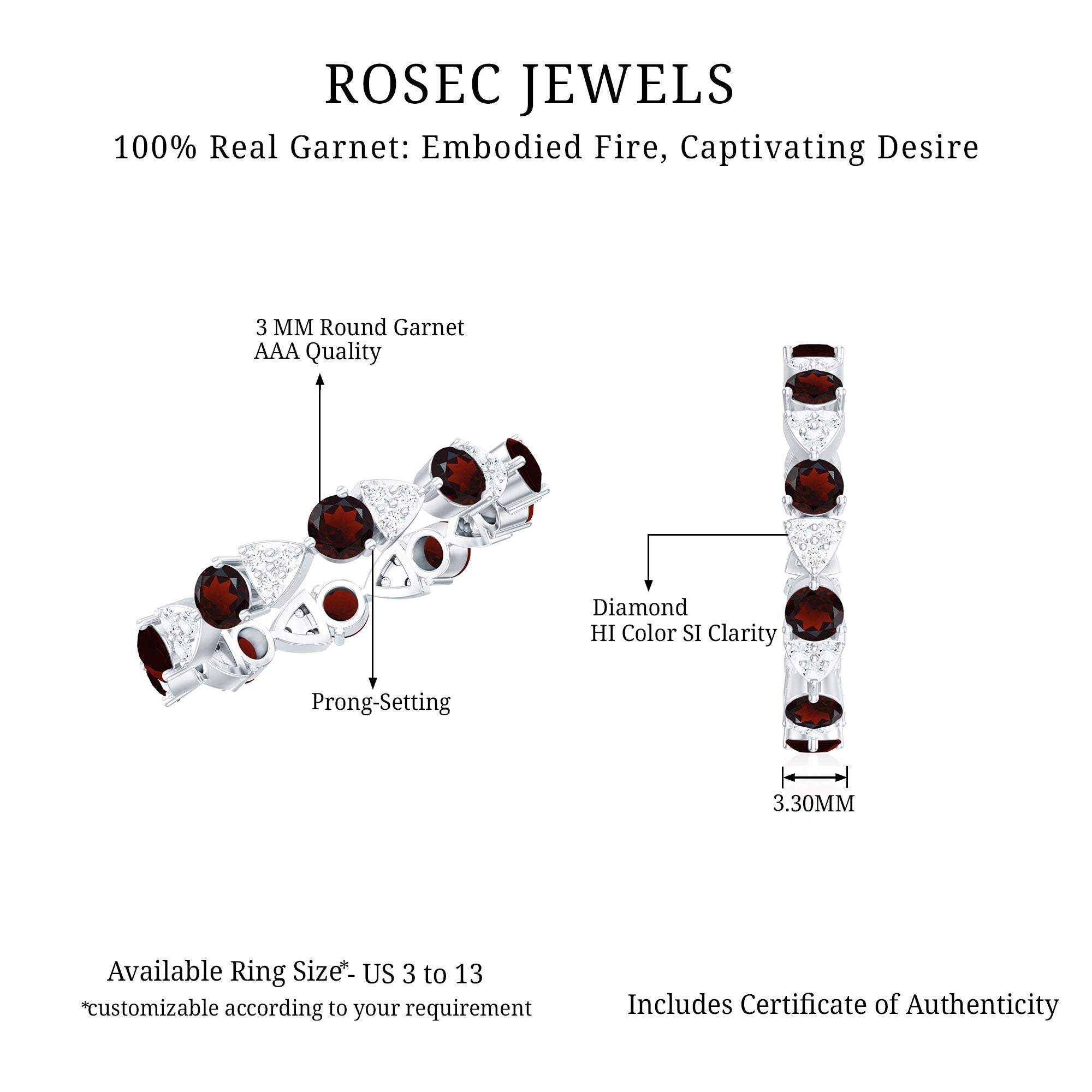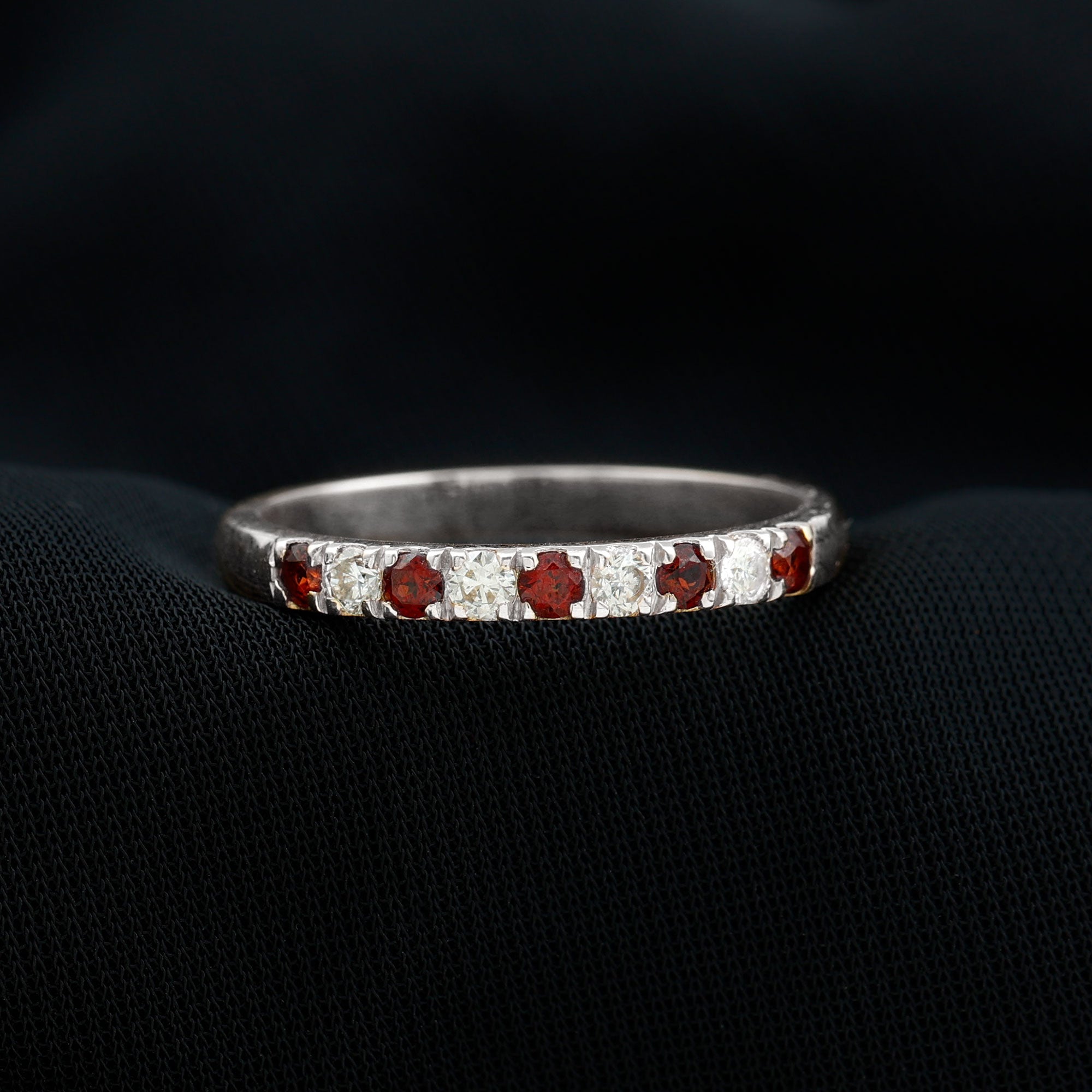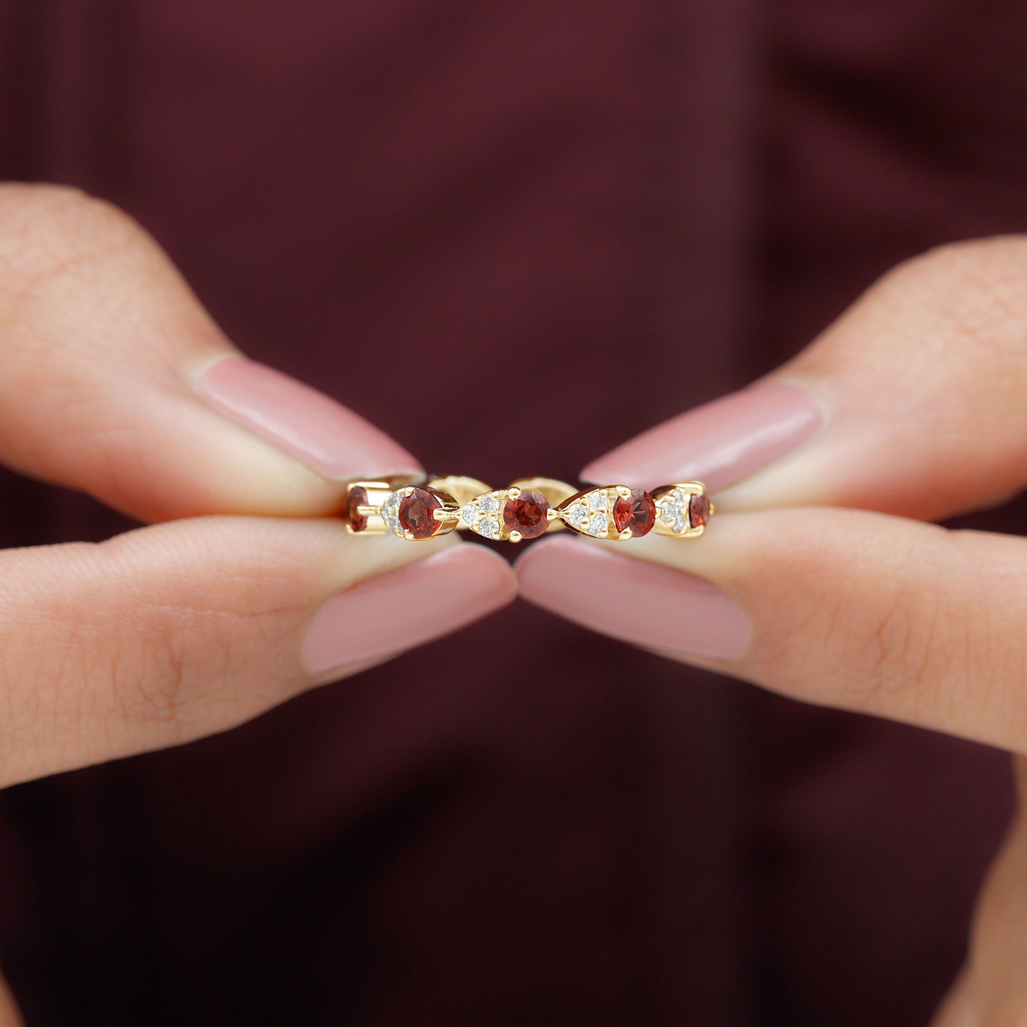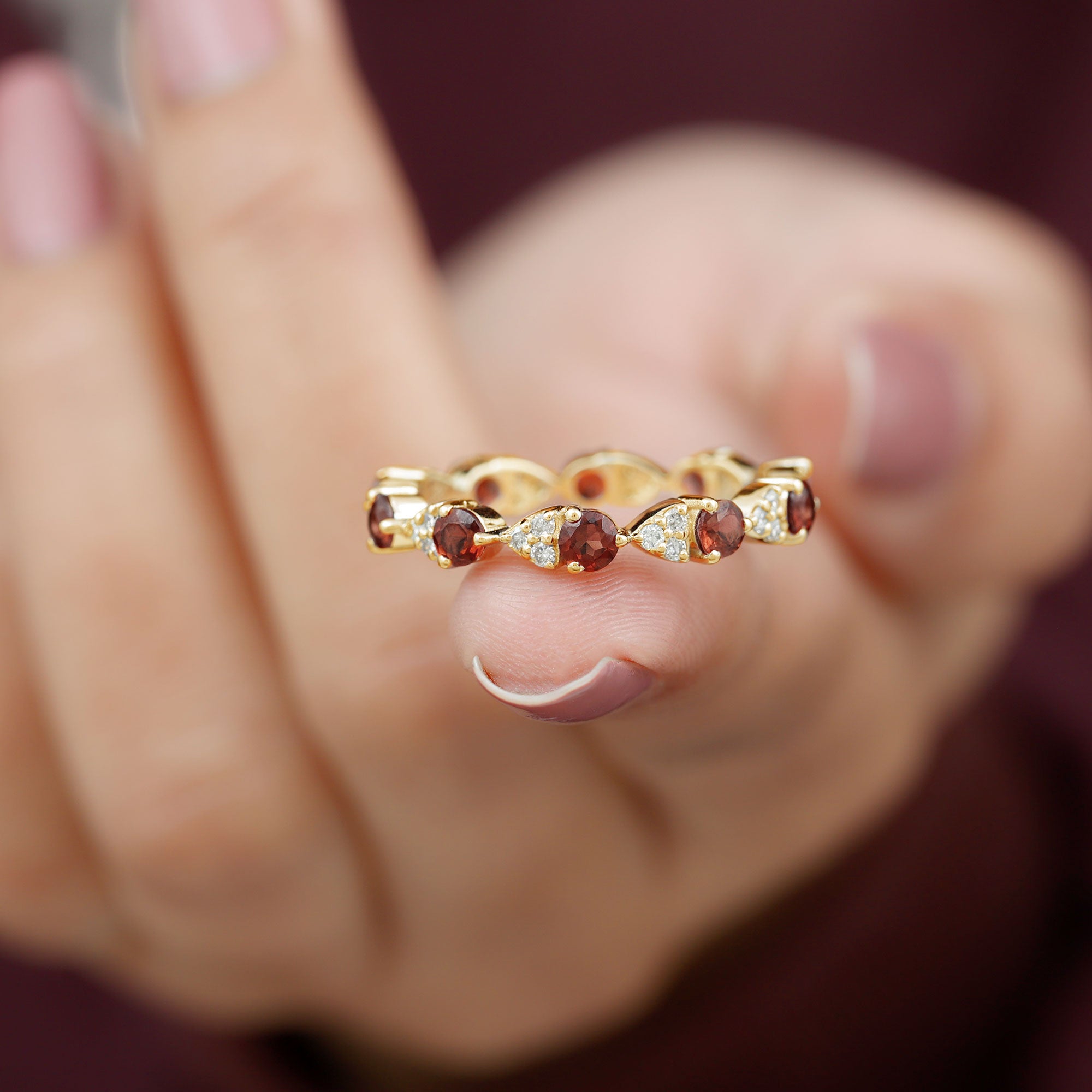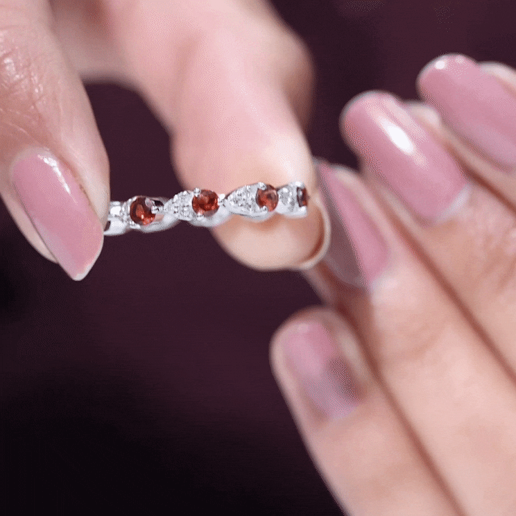 • Garnet Eternity Rings: - An eternity ring showcases a continuous circle of garnets, providing a vibrant burst of color for those seeking more than a solitaire style. With its bold red hue, a garnet eternity ring becomes a classic yet striking accessory in your jewelry collection. Moreover, a garnet and diamond ring in an eternity style offers a unique blend of color and sparkle, making it a truly exotic choice. Beyond its aesthetic appeal, this style symbolizes a love that transcends boundaries, making it a meaningful option for a garnet wedding ring.