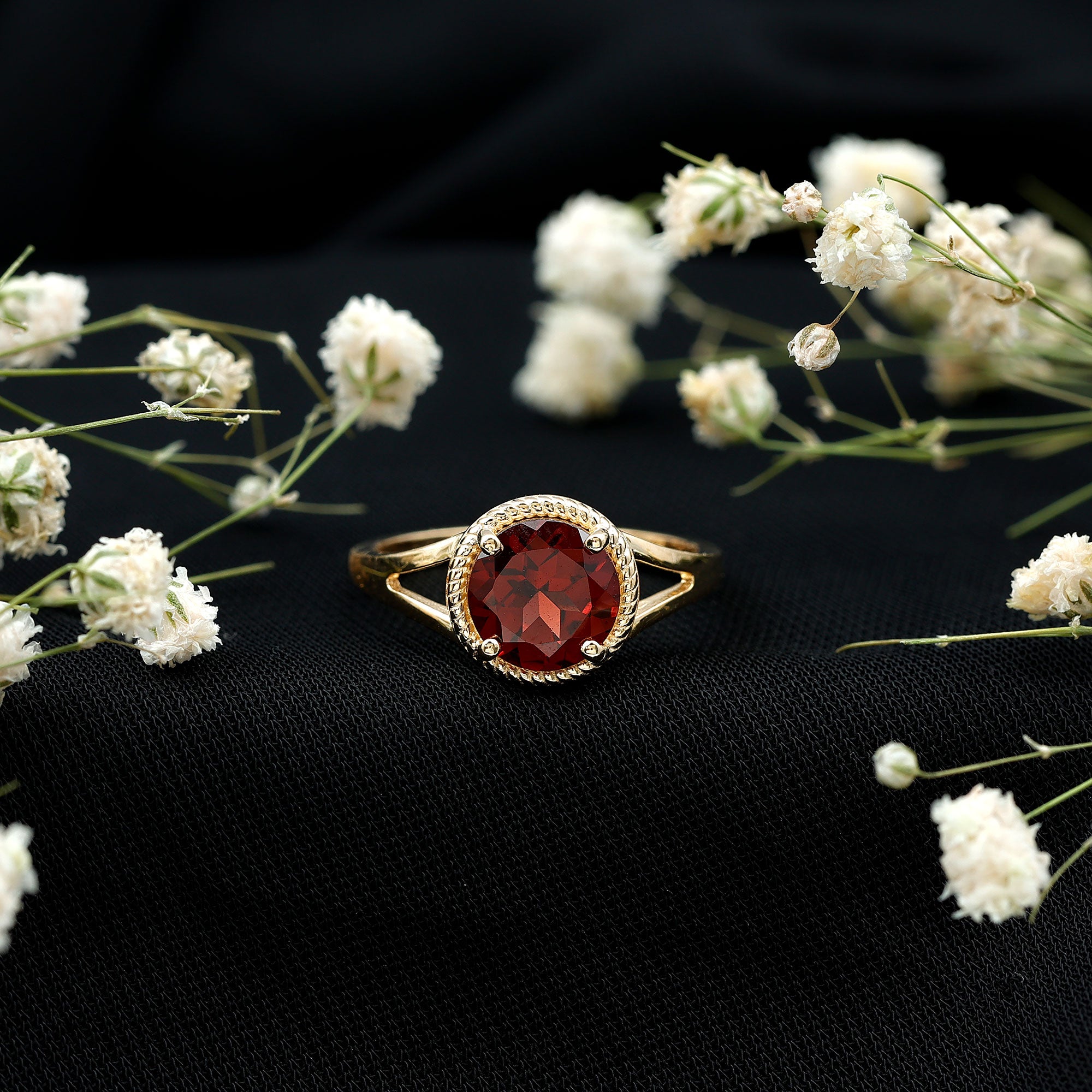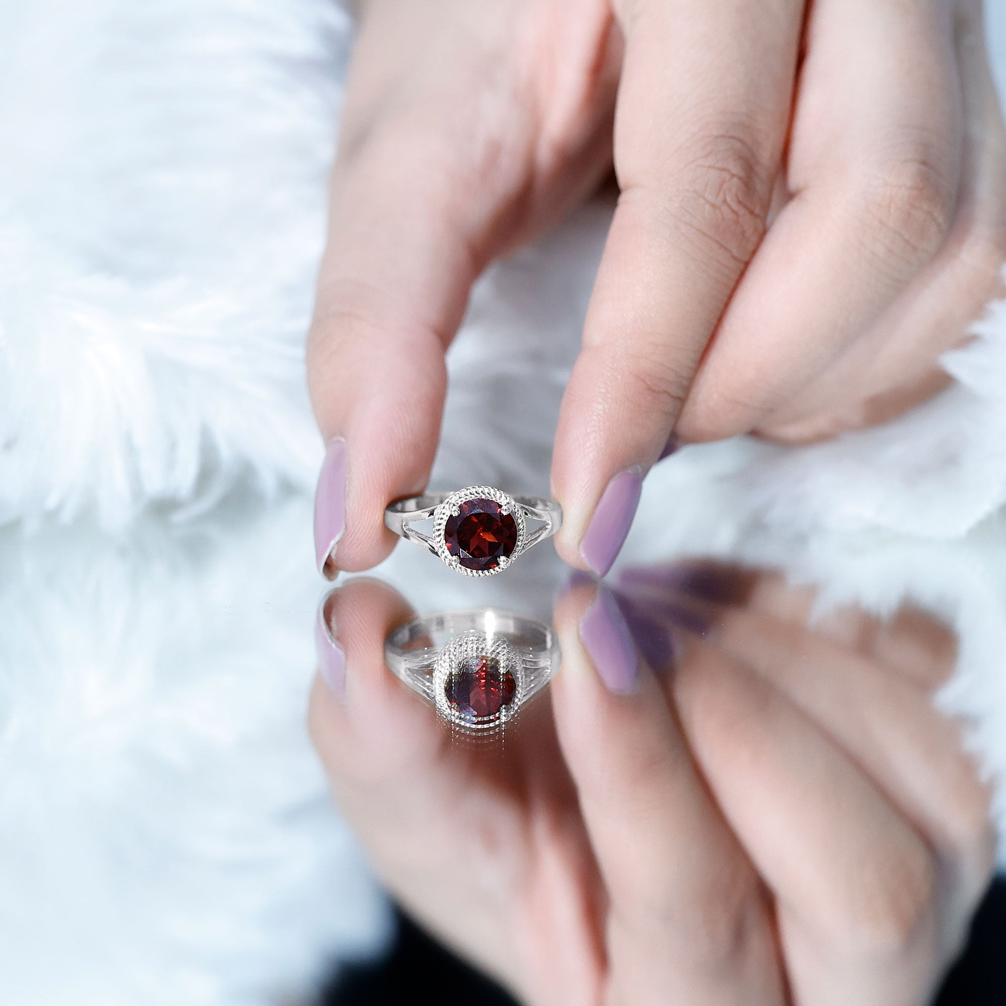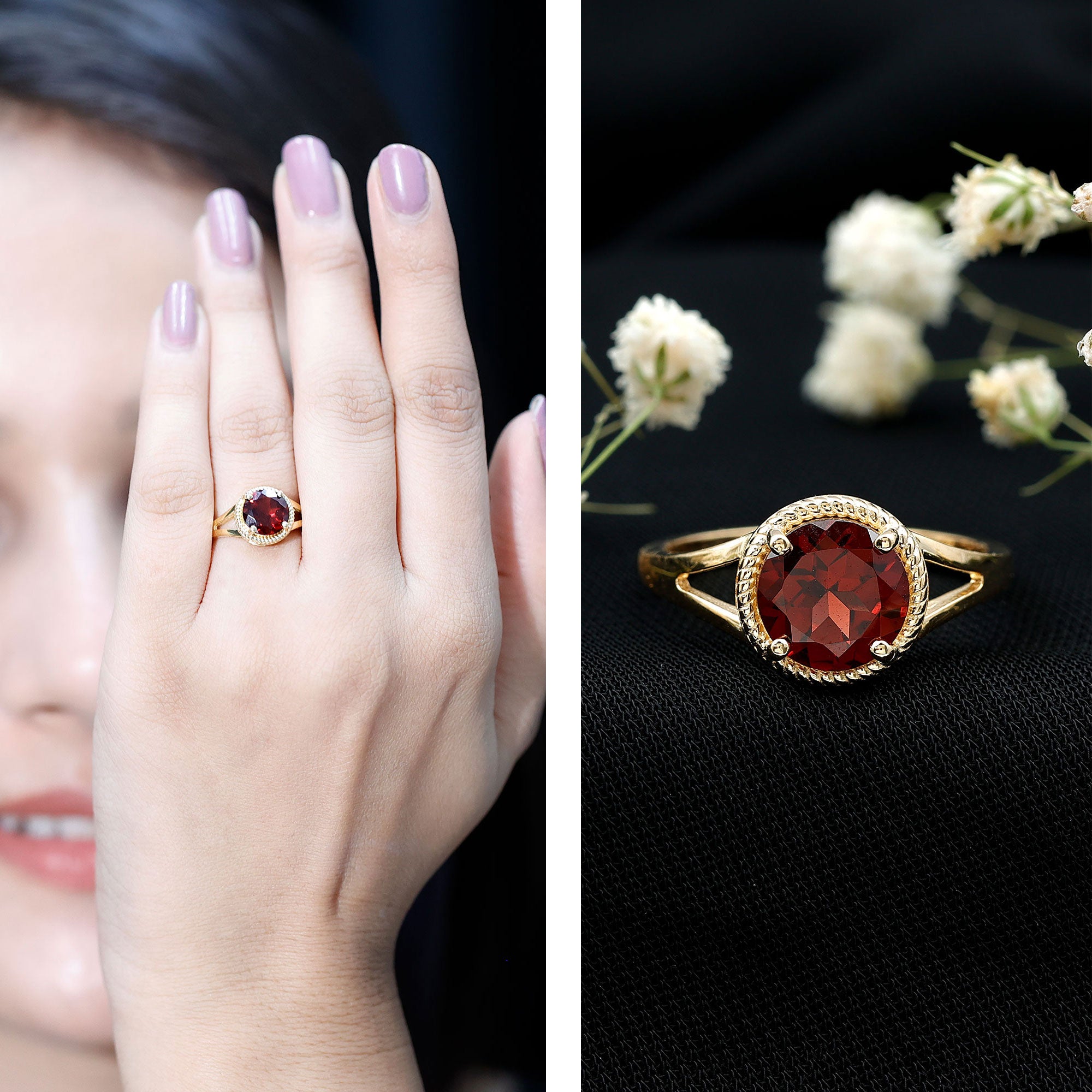 • Garnet Halo Rings: - A fascinating twist on the traditional Solitaire Ring is the “halo ring”, which features a circle of diamond or moissanite surrounding the garnet solitaire. The Halo isn't just about adding sparkle; it adds versatility to the ring. Furthermore, it draws more focus to the garnet, creating the illusion of a larger stone. The halo style makes the ring more unique and attractive.