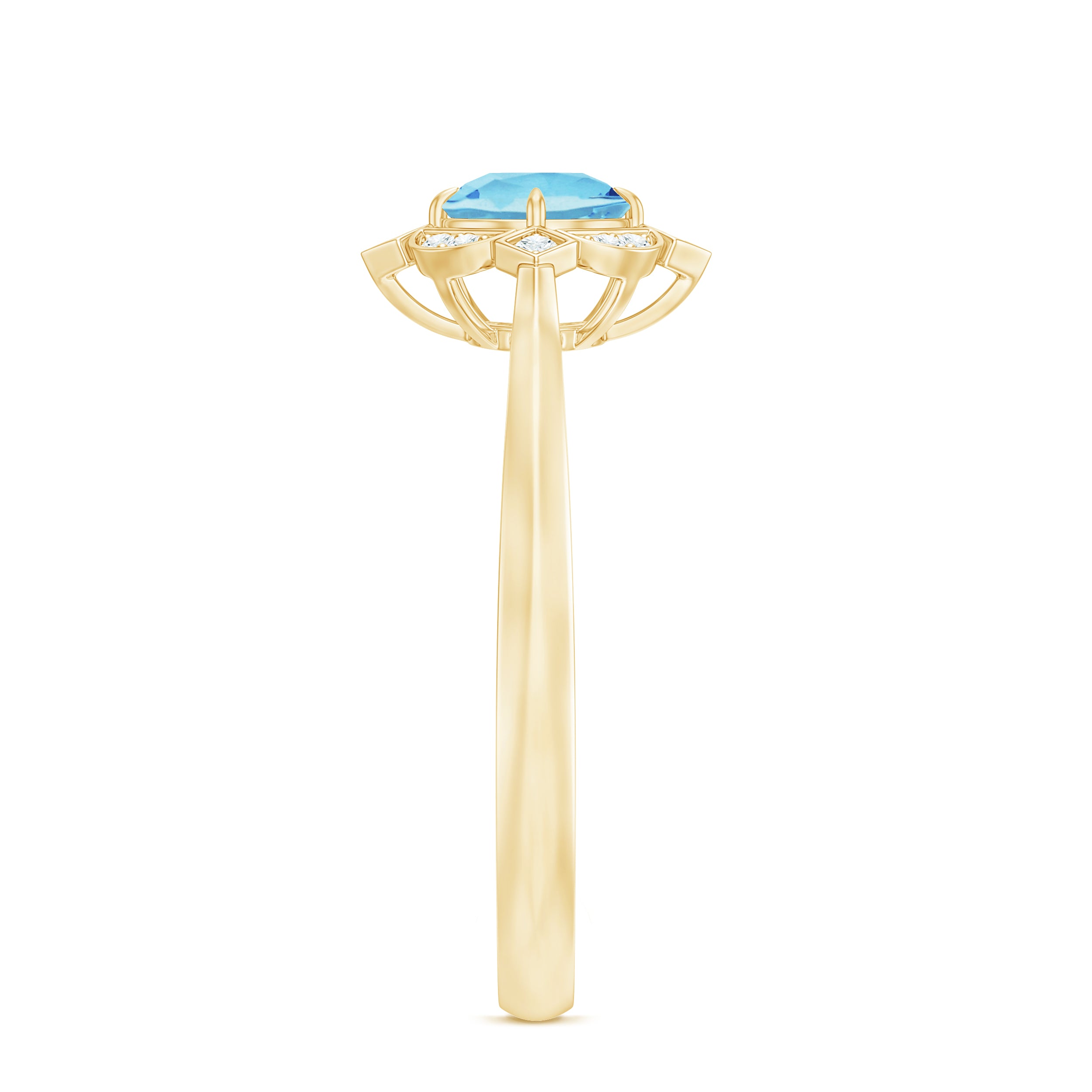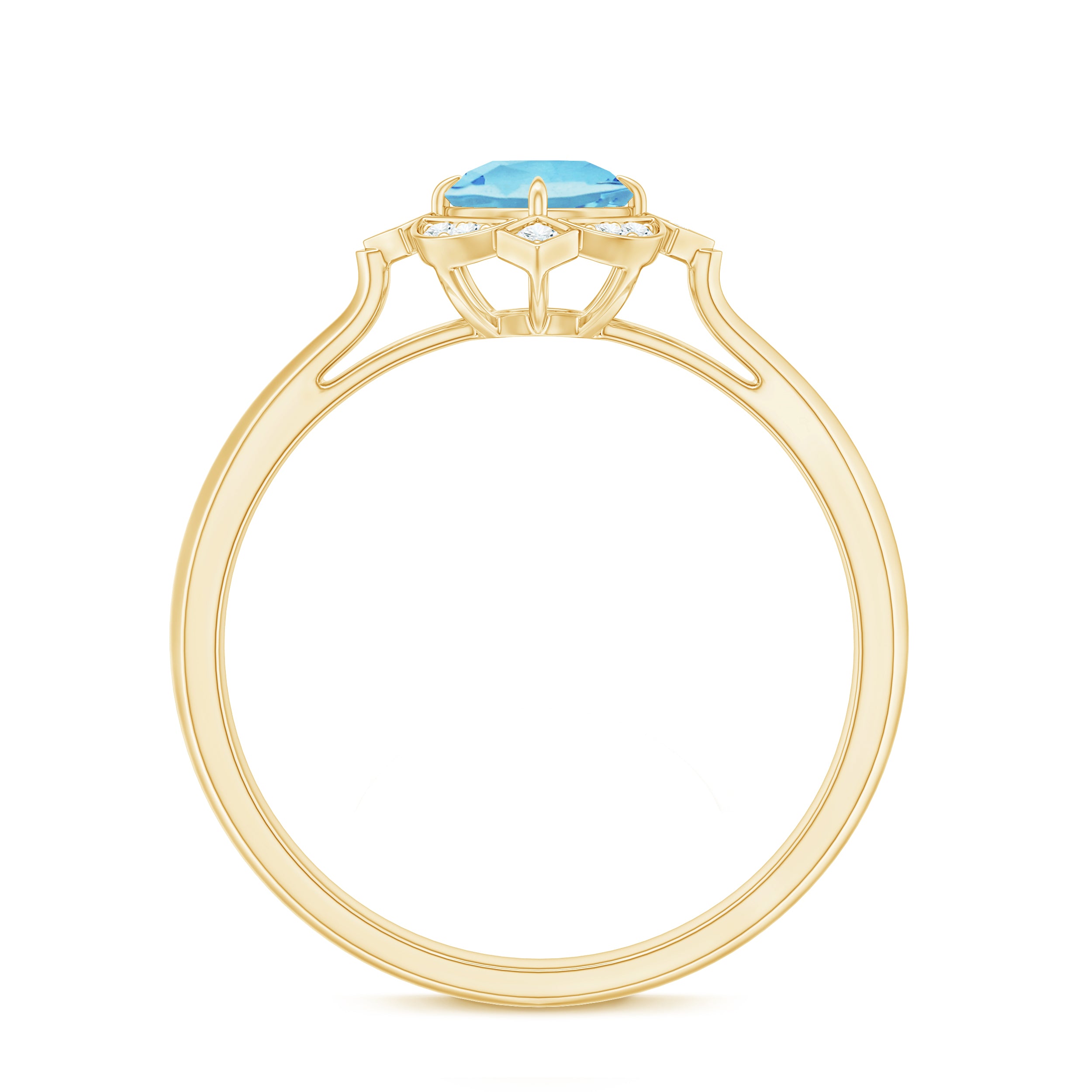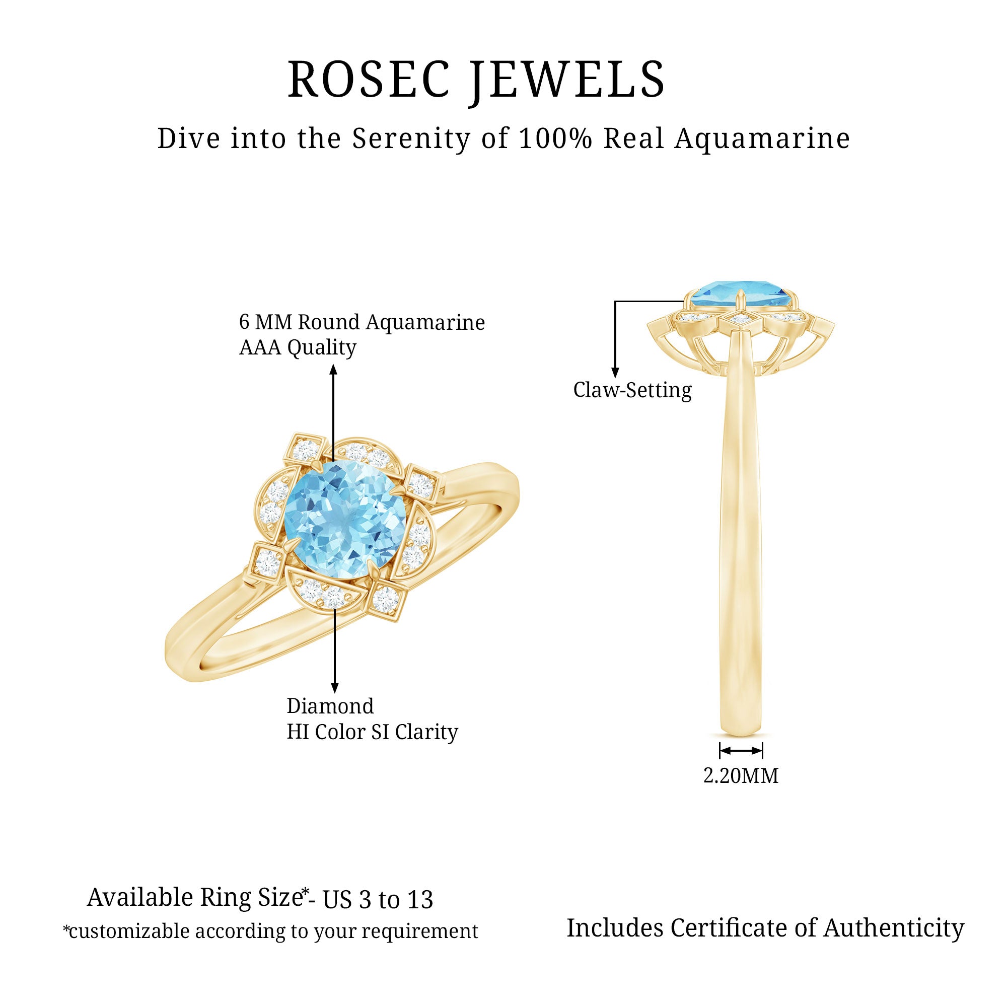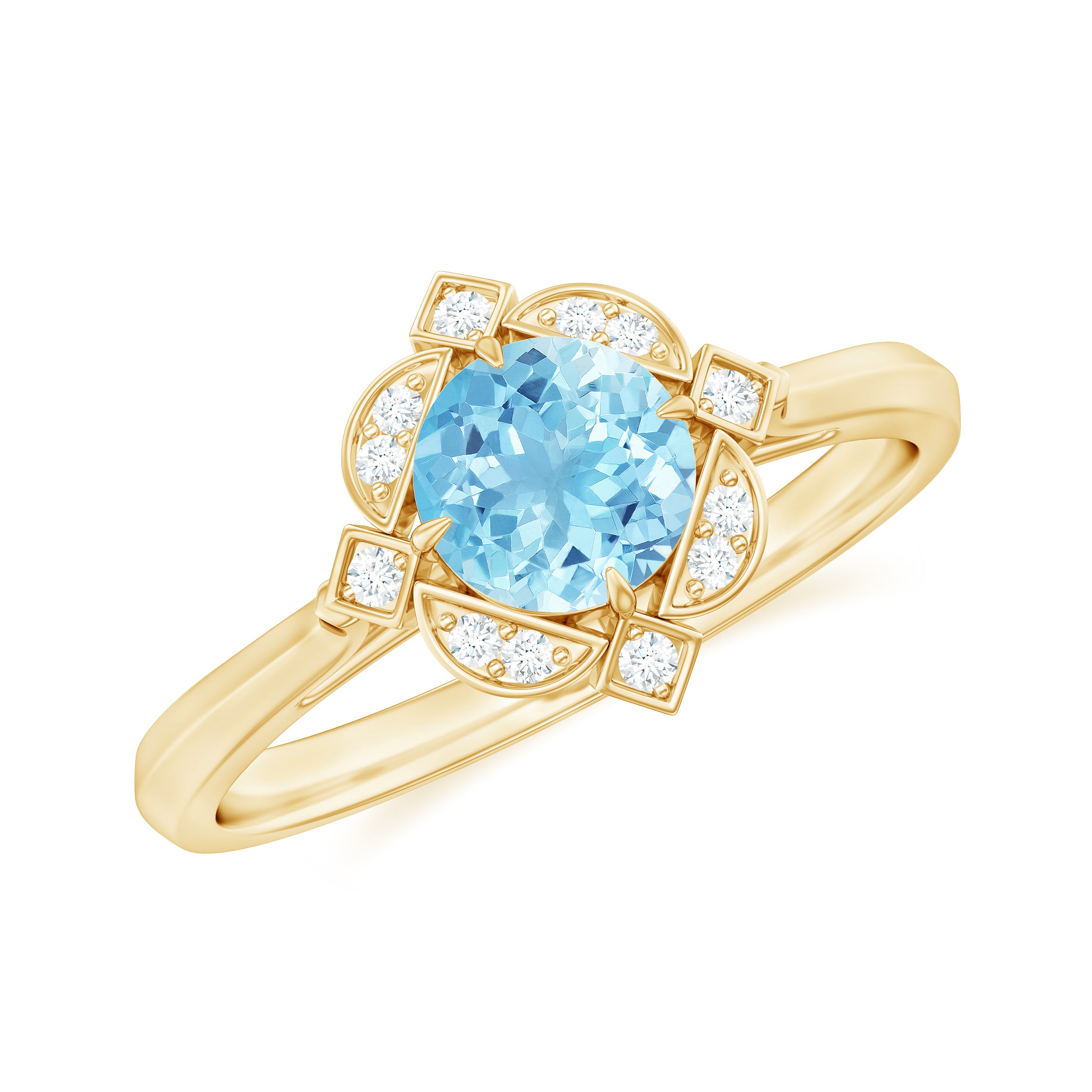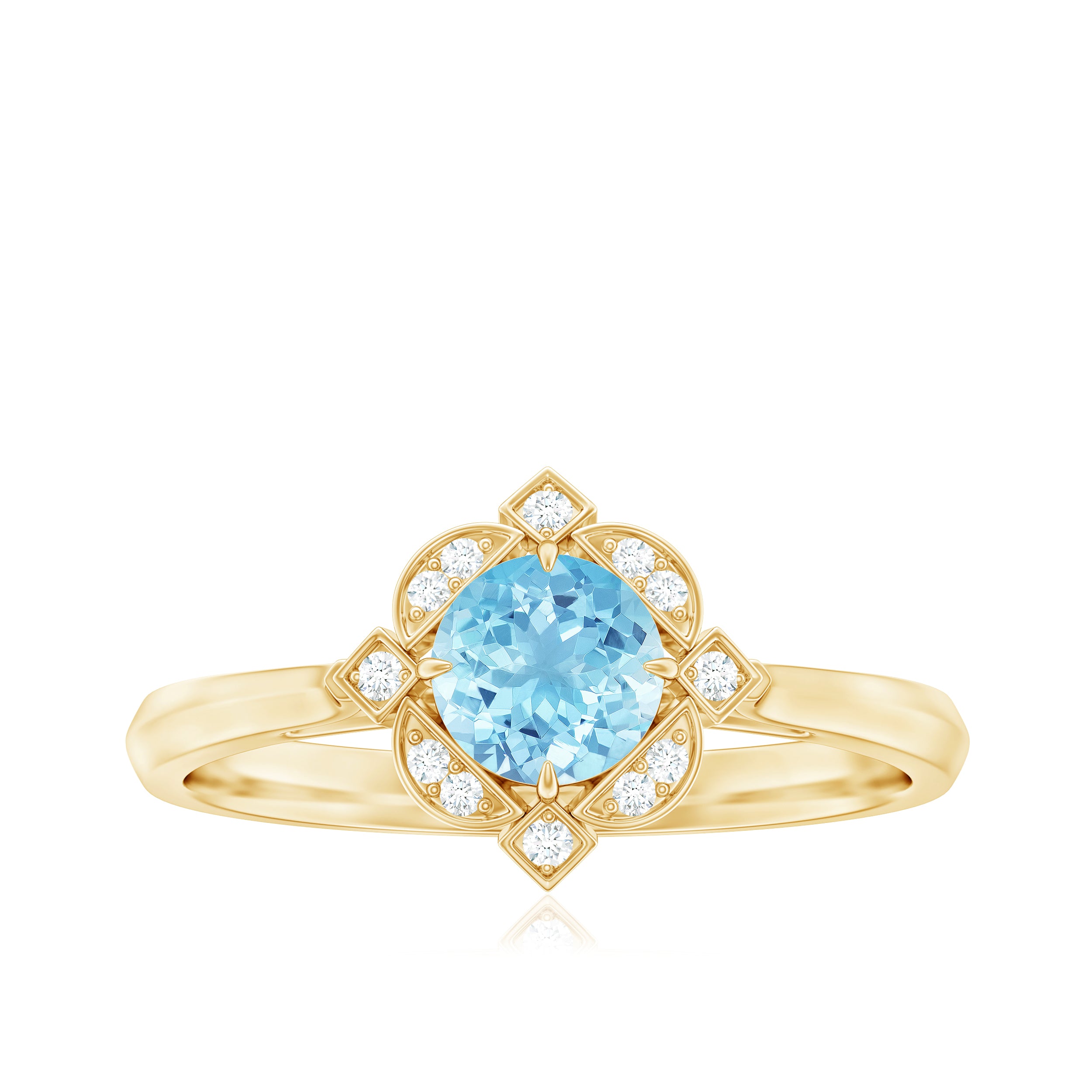 Make a timeless statement with this Aquamarine Classic Vintage Ring. Featuring a Round Shape aquamarine surrounded by a sparkling halo of Diamond stones, this ring is perfect for anniversaries or any other special occasion. Embrace your inner queen and add this beautiful piece to your jewelry collection.