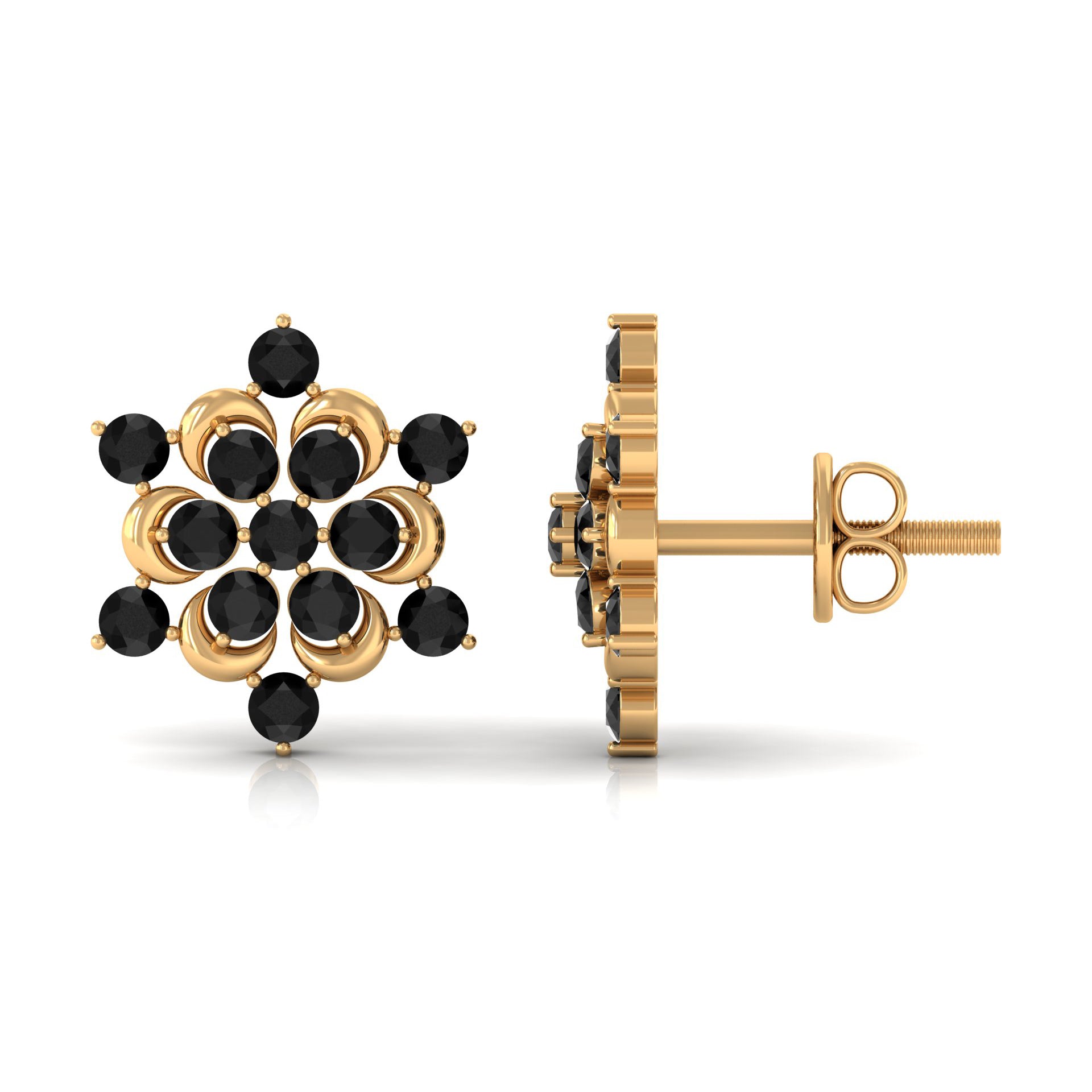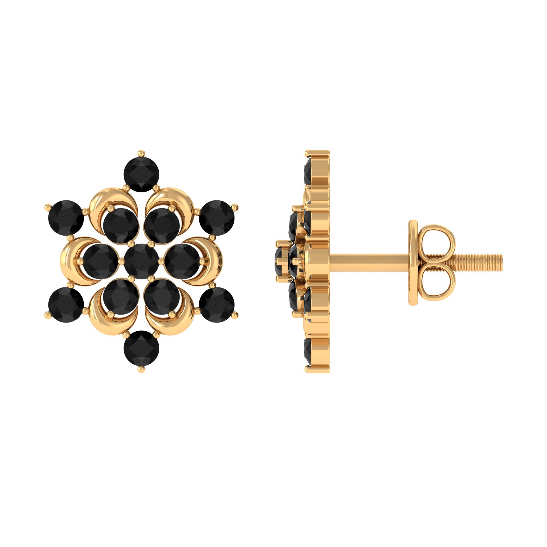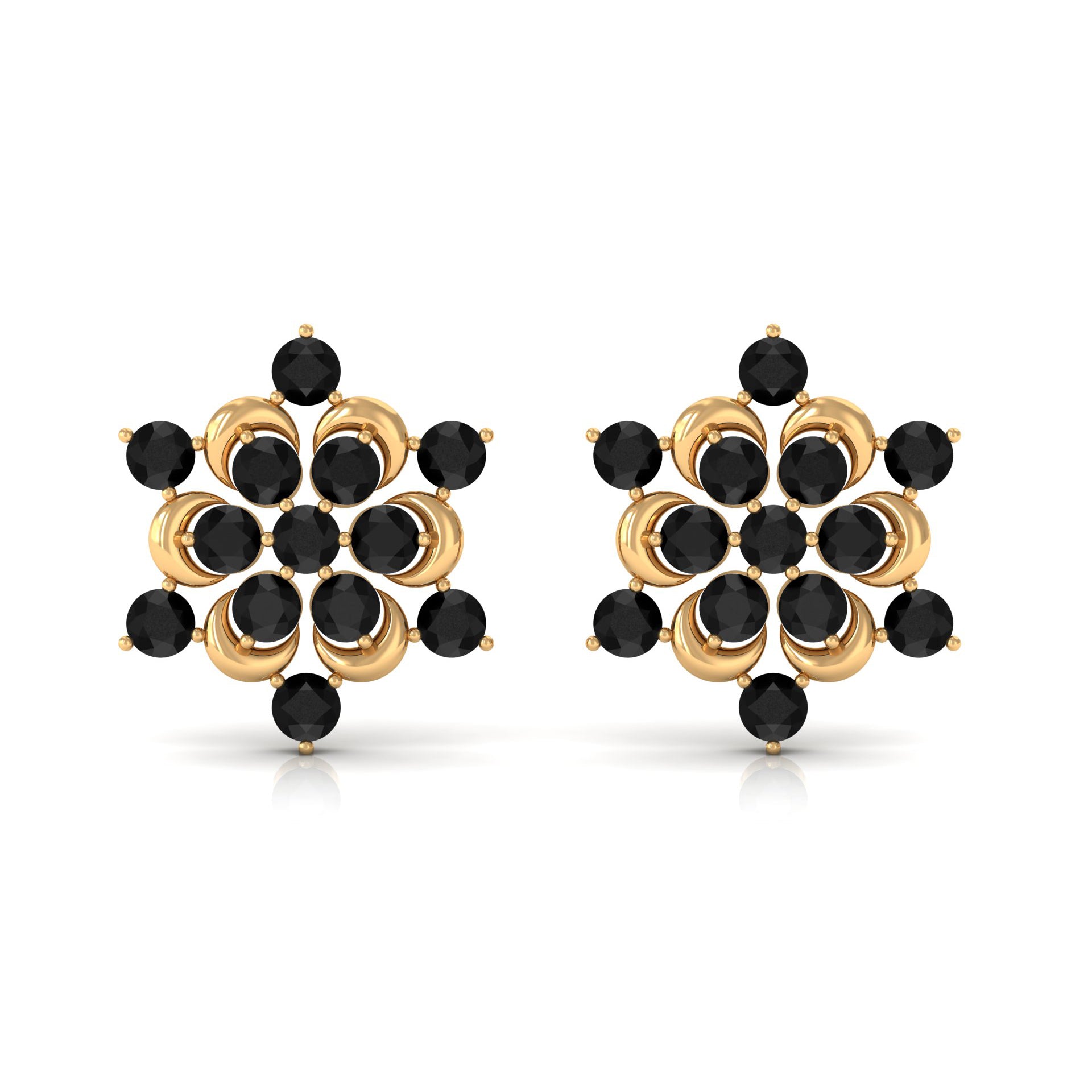 Feel Cute with our Snowflake Stud Earrings featuring Round Cut Black Onyx set in Prong Setting. This Statement Earrings are crafted in Solid Gold.