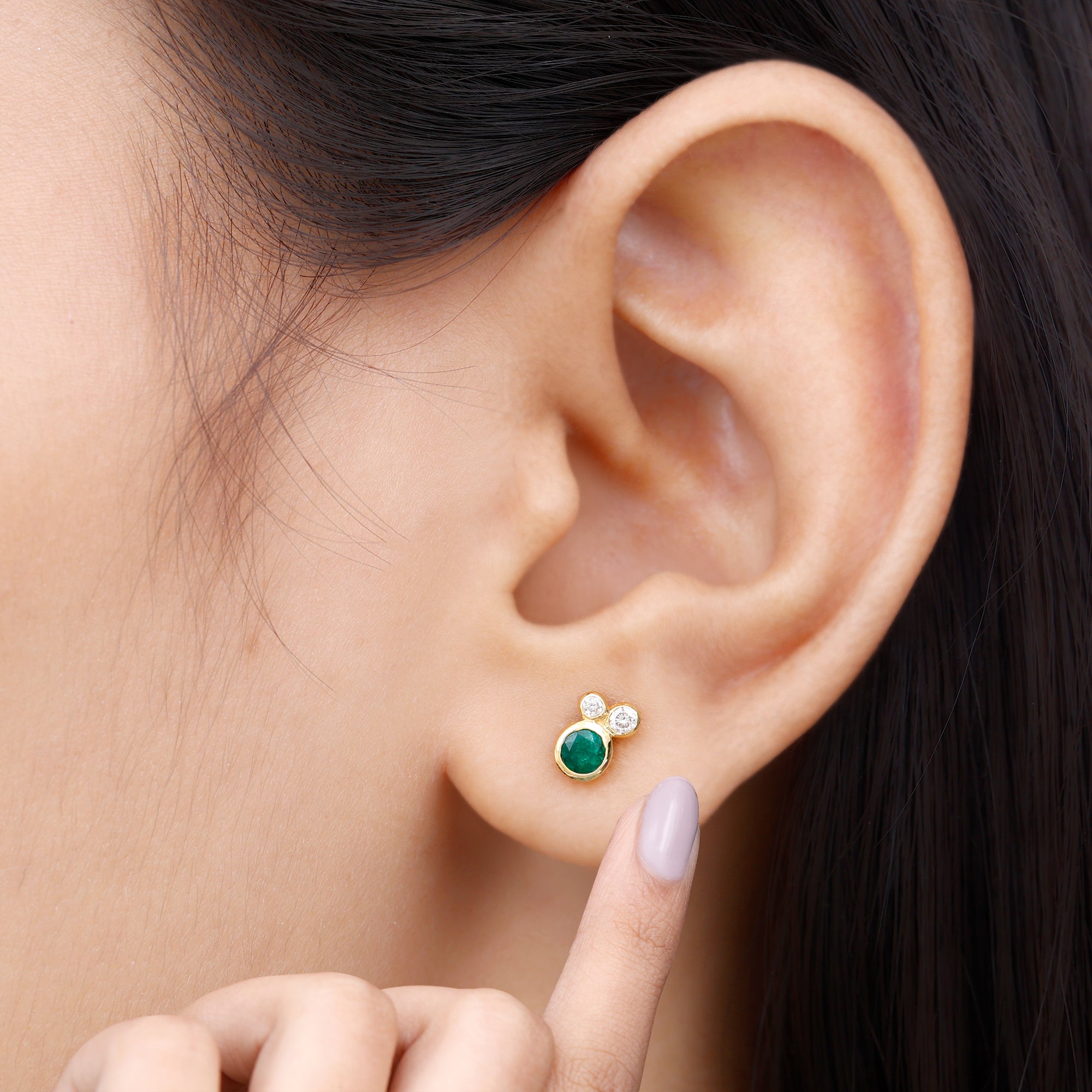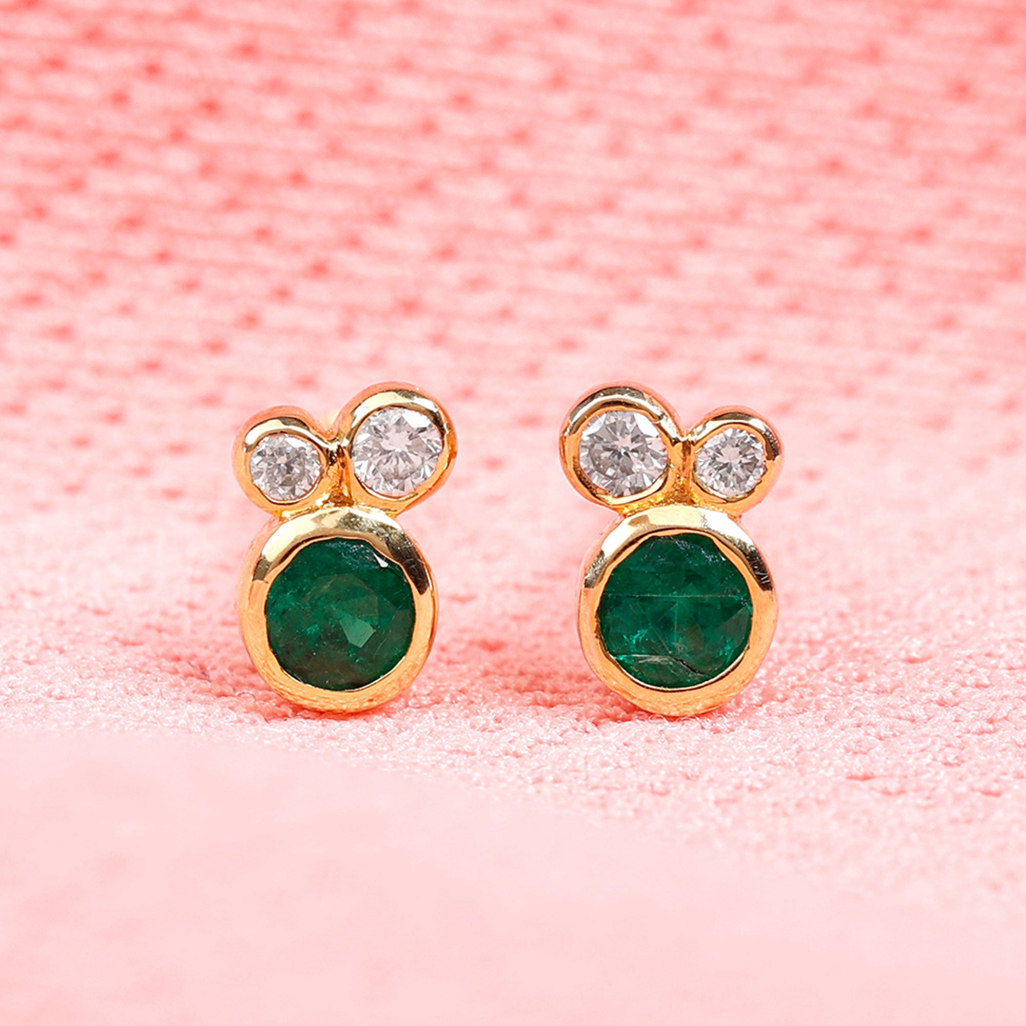 Grab this shinning Three Stone Stud Earrings for your loved one. These Dainty Earrings are embellished with Round Shape Emerald and Diamond in Solid Gold with Bezel Setting.