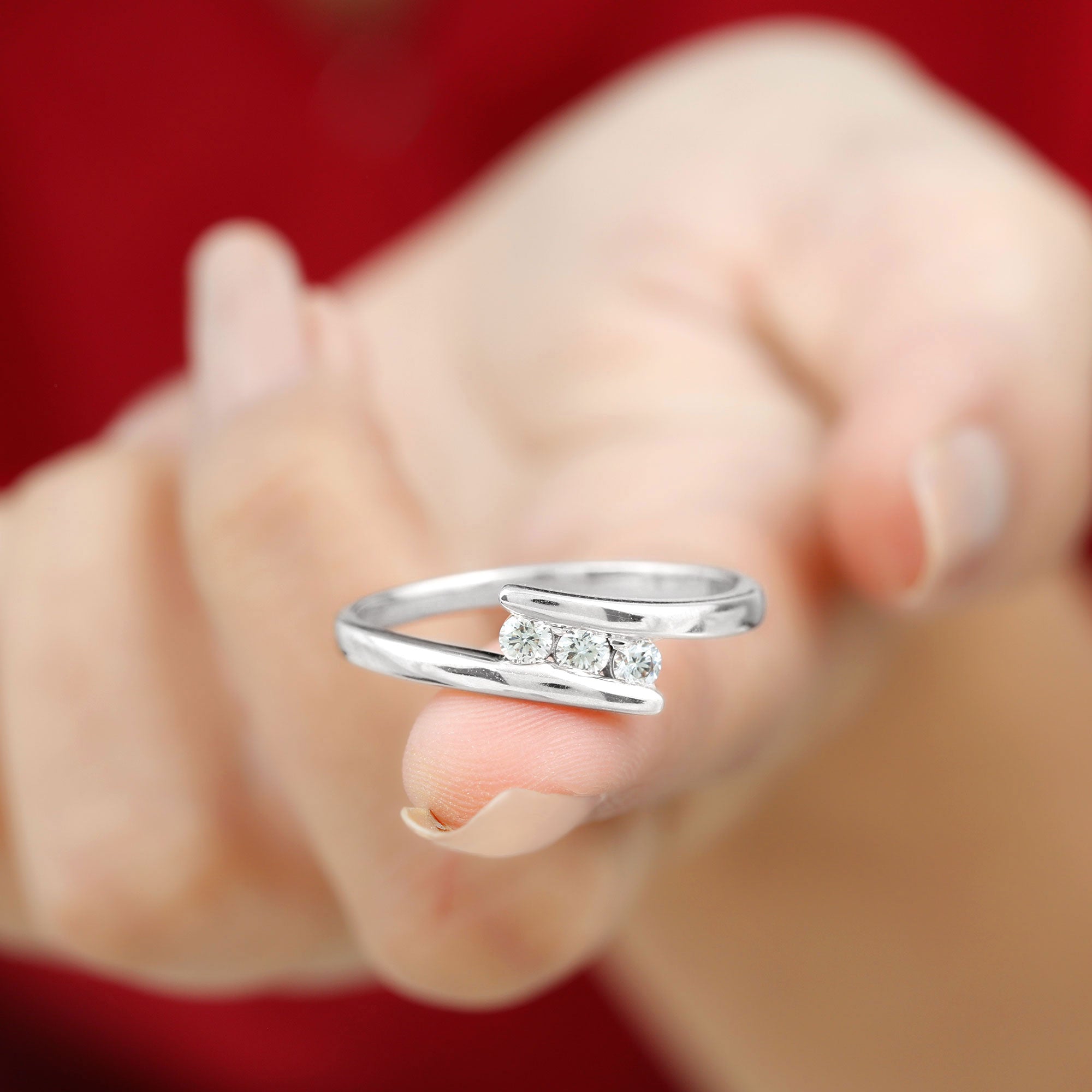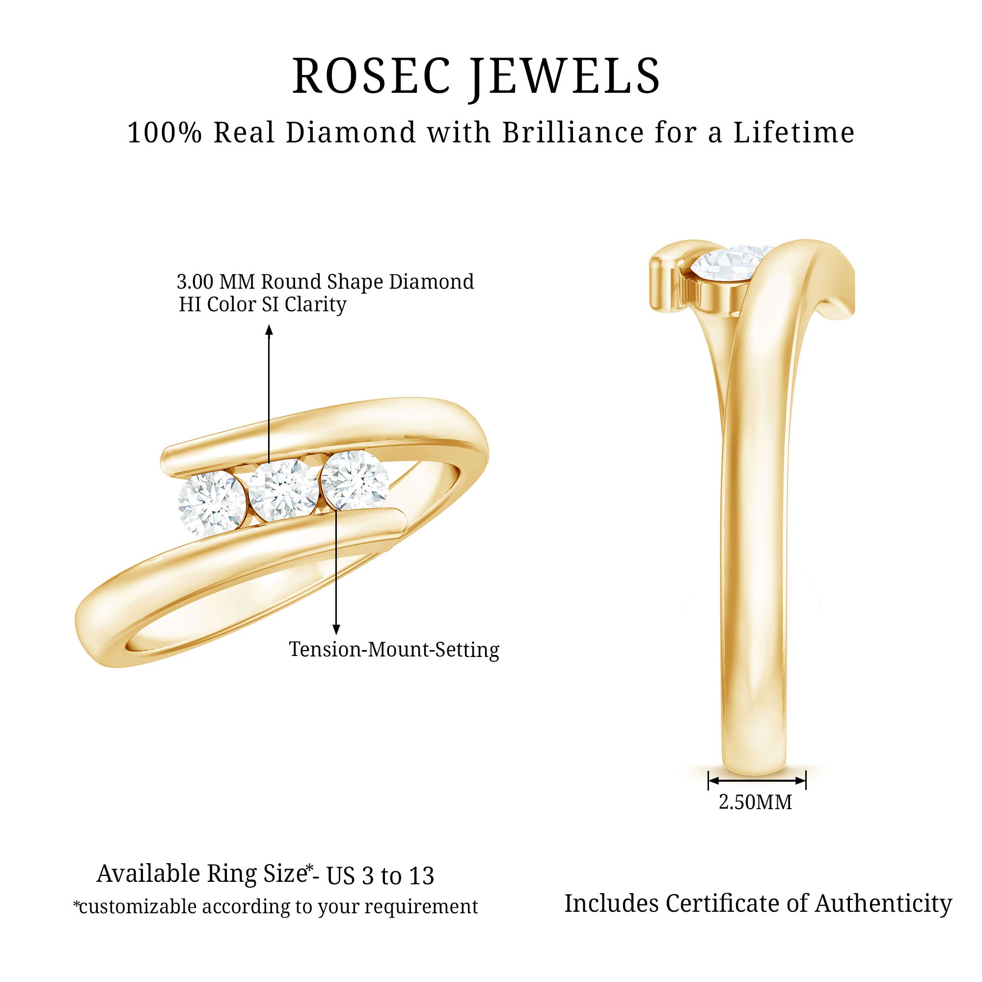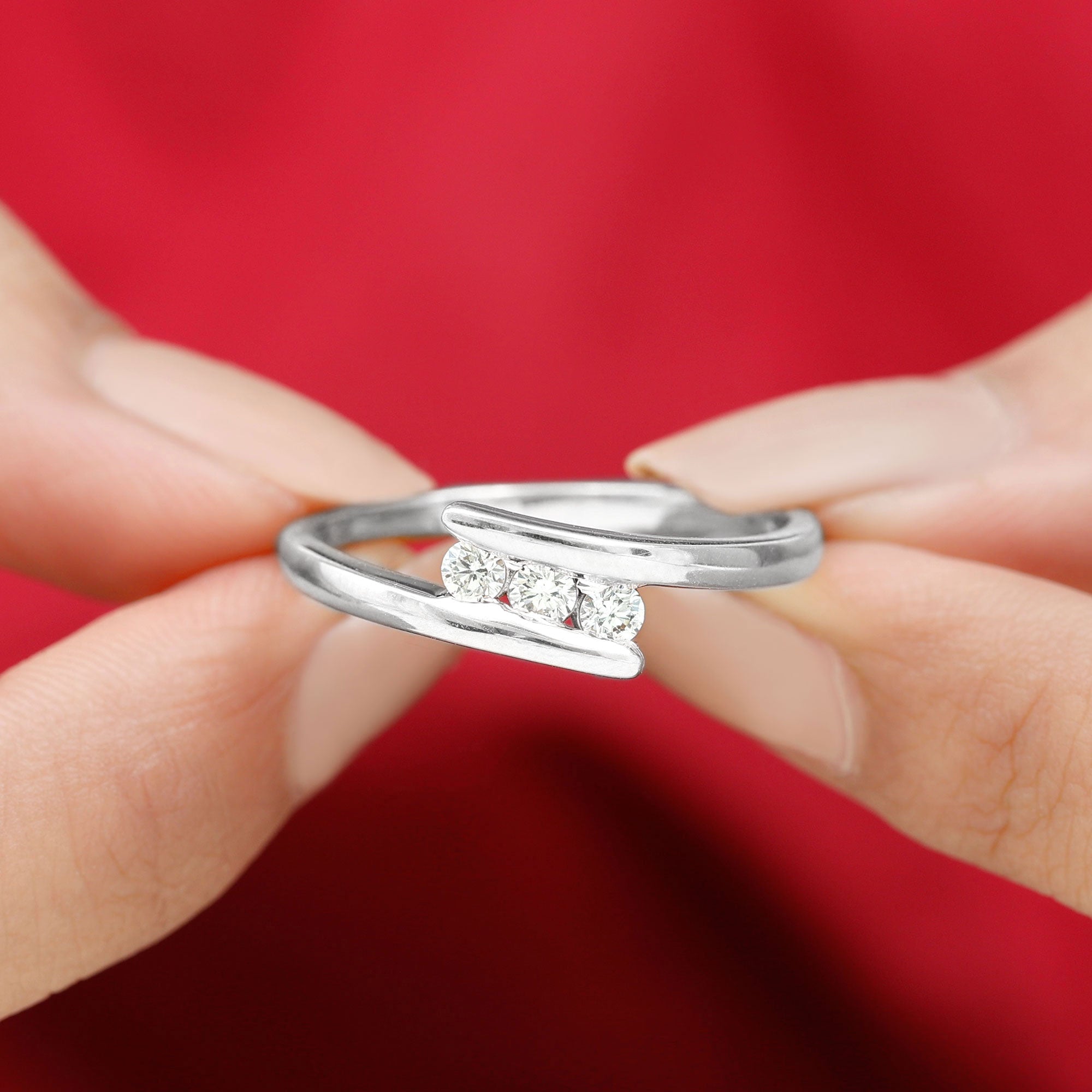 Symbolize your promise of love with this stunning Diamond Promise Ring, featuring a unique bypass shank design that adds an extra touch of elegance. The ring is beautifully adorned with Round Shape Diamond in tension Mount Setting. Flanking it, two equally brilliant Diamonds represent your cherished past and the radiant future you are building together. The bypass shank design adds a modern and unique twist to the classic 3 Stone Ring, making it a perfect choice for those who appreciate both traditional and contemporary styles. Set in a design that highlights their radiance, this Past Present Future Ring has HI Color SI Clarity Diamond that comes together to create a breathtaking display of light and fire. More than just an adornment, it is a tangible testament to enduring commitment, a promise made tangible, and a beautiful symbol of a bond that strengthens with every passing moment. A trio of brilliance, this Simple Promise Ring is a breathtaking embodiment of your past, present, and future, which is a testament to a love that grows stronger with every passing moment, destined to be cherished for a lifetime.