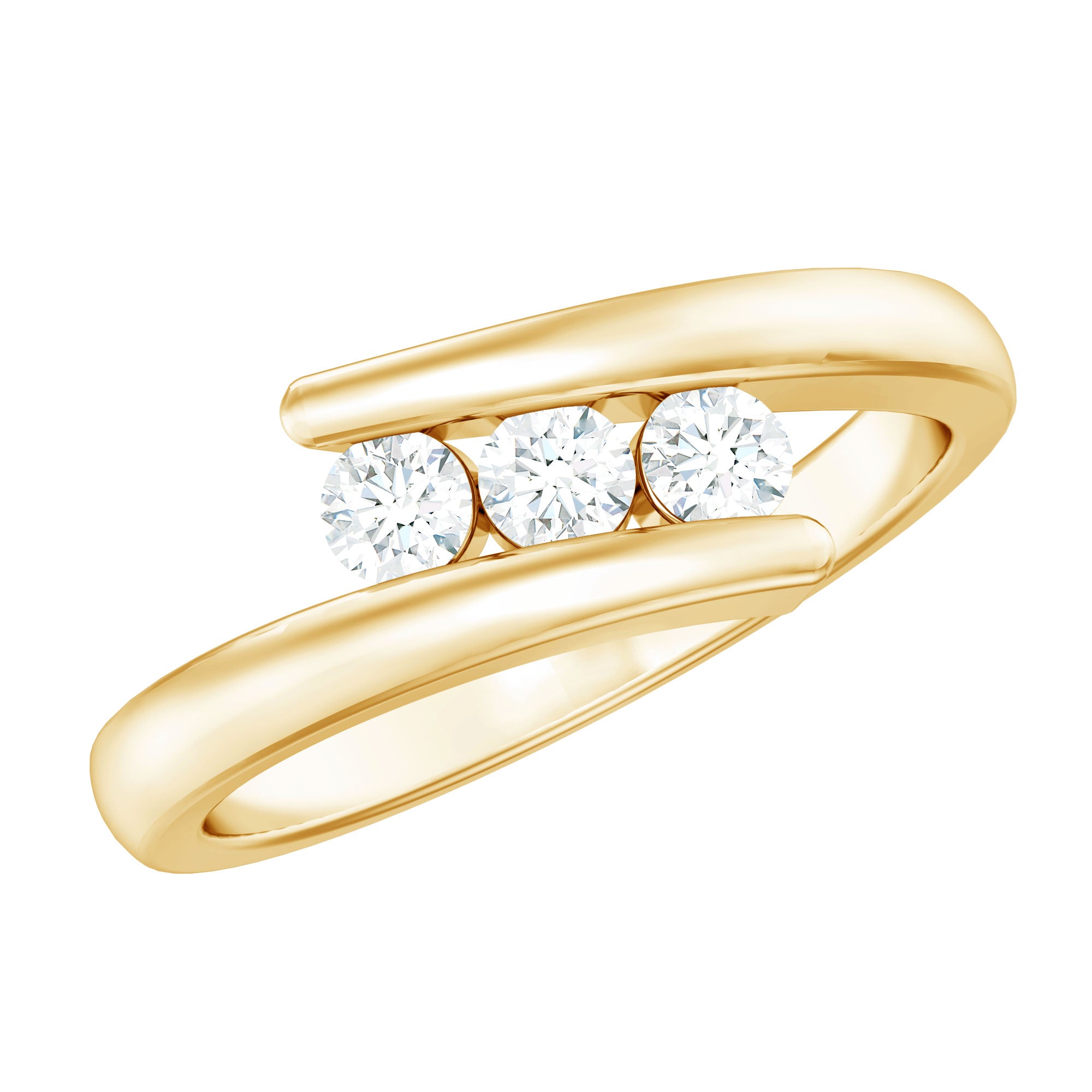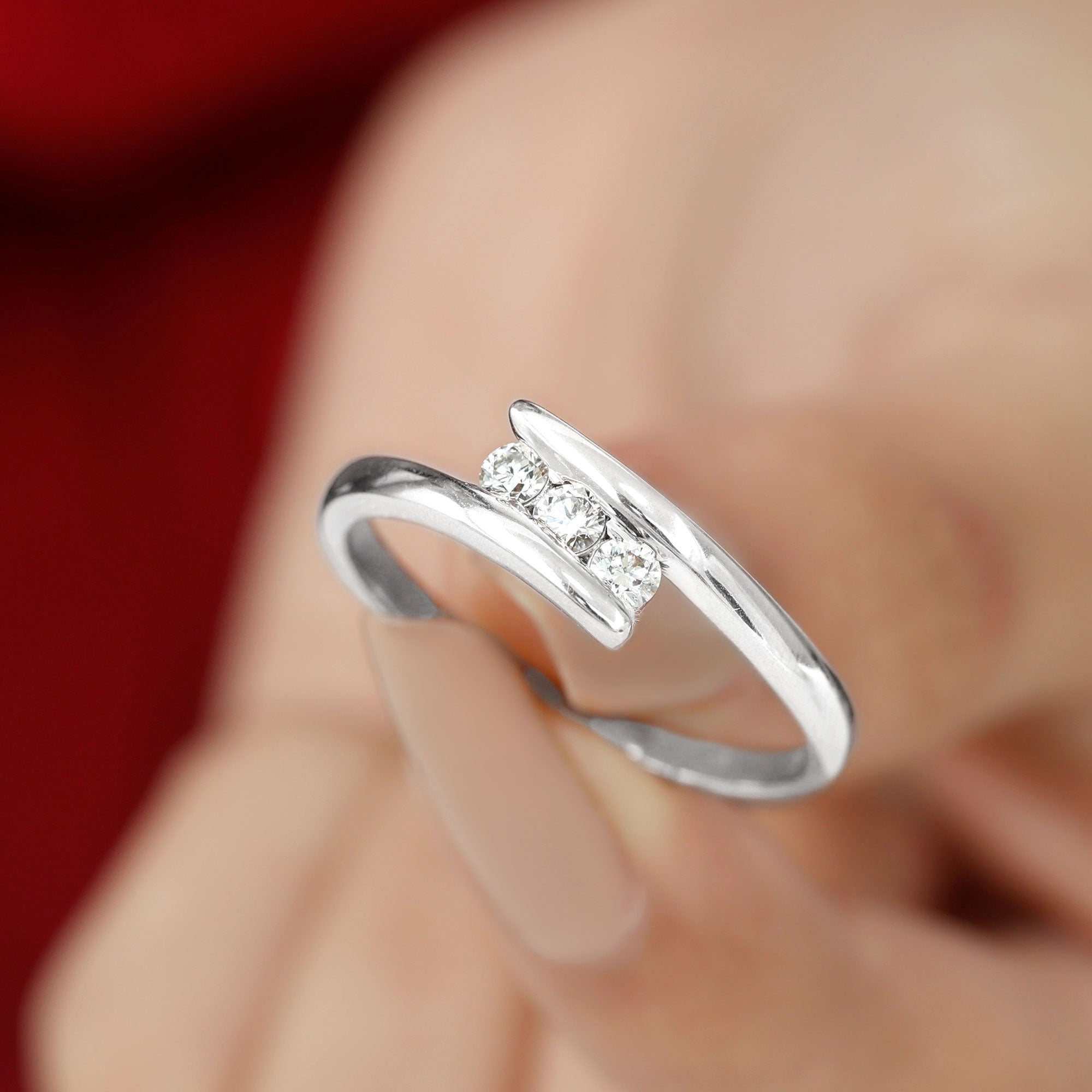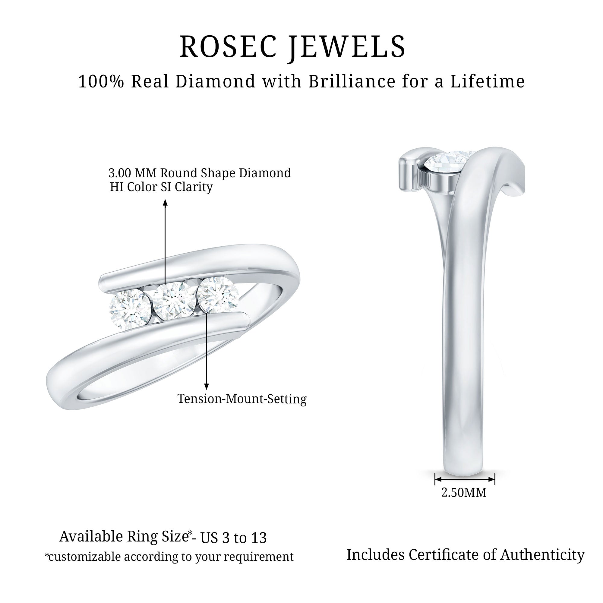 Symbolize your promise of love with this stunning Diamond Promise Ring, featuring a unique bypass shank design that adds an extra touch of elegance. The ring is beautifully adorned with Round Shape Diamond in tension Mount Setting. Flanking it, two equally brilliant Diamonds represent your cherished past and the radiant future you are building together. The bypass shank design adds a modern and unique twist to the classic 3 Stone Ring, making it a perfect choice for those who appreciate both traditional and contemporary styles. Set in a design that highlights their radiance, this Past Present Future Ring has HI Color SI Clarity Diamond that comes together to create a breathtaking display of light and fire. More than just an adornment, it is a tangible testament to enduring commitment, a promise made tangible, and a beautiful symbol of a bond that strengthens with every passing moment. A trio of brilliance, this Simple Promise Ring is a breathtaking embodiment of your past, present, and future, which is a testament to a love that grows stronger with every passing moment, destined to be cherished for a lifetime.