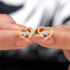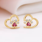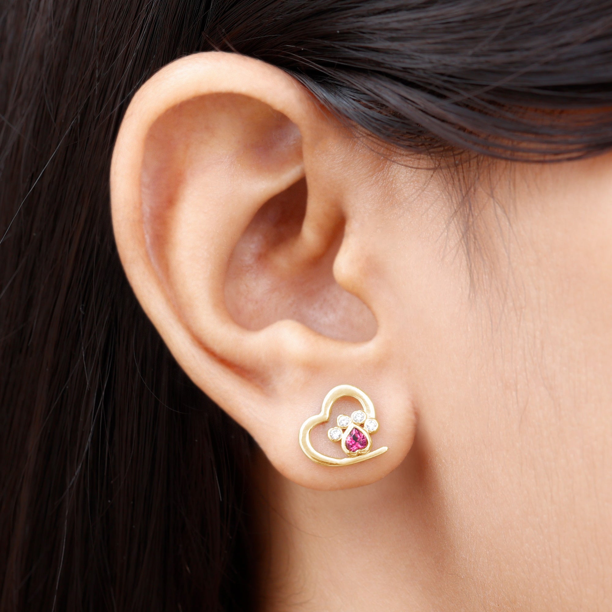 These Cute Heart Paw Stud Earrings embellished with Heart Shape Pink Tourmaline Gemstone are set in a Bezel Setting with small Round Shape Diamond stones also set in a Bezel setting, crafted in Gold.