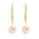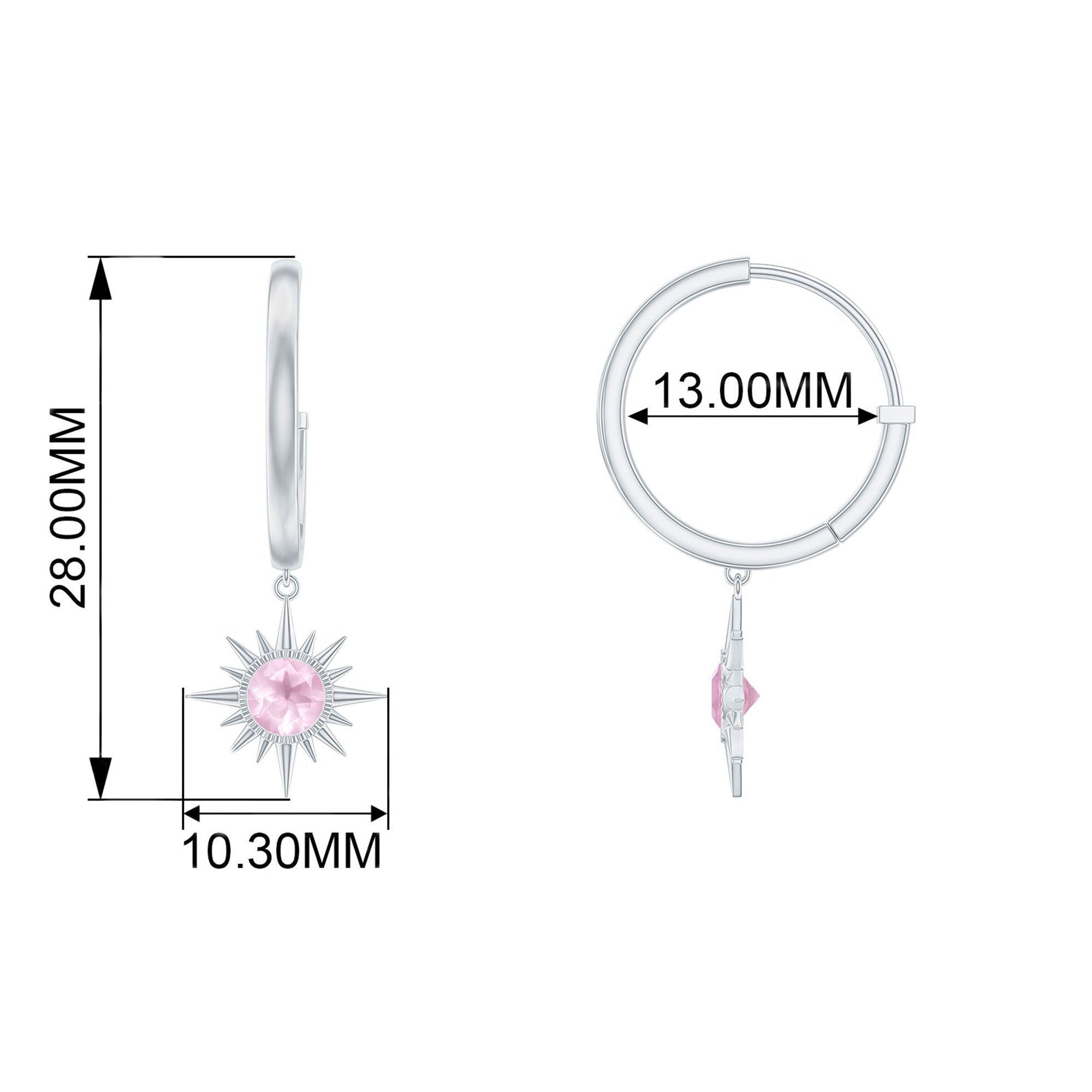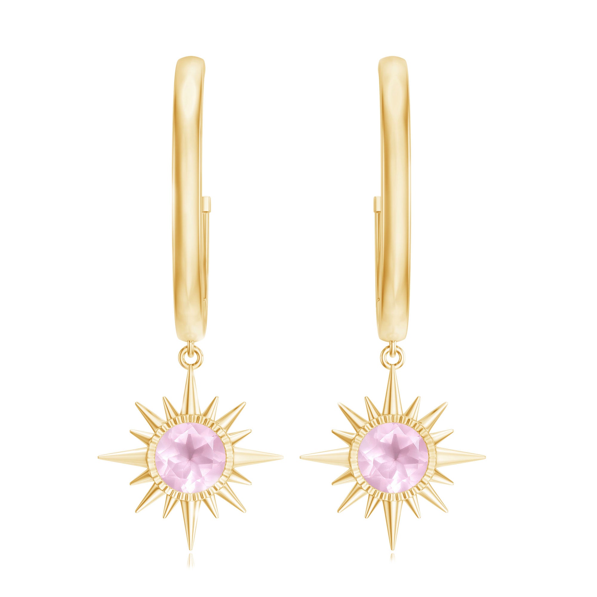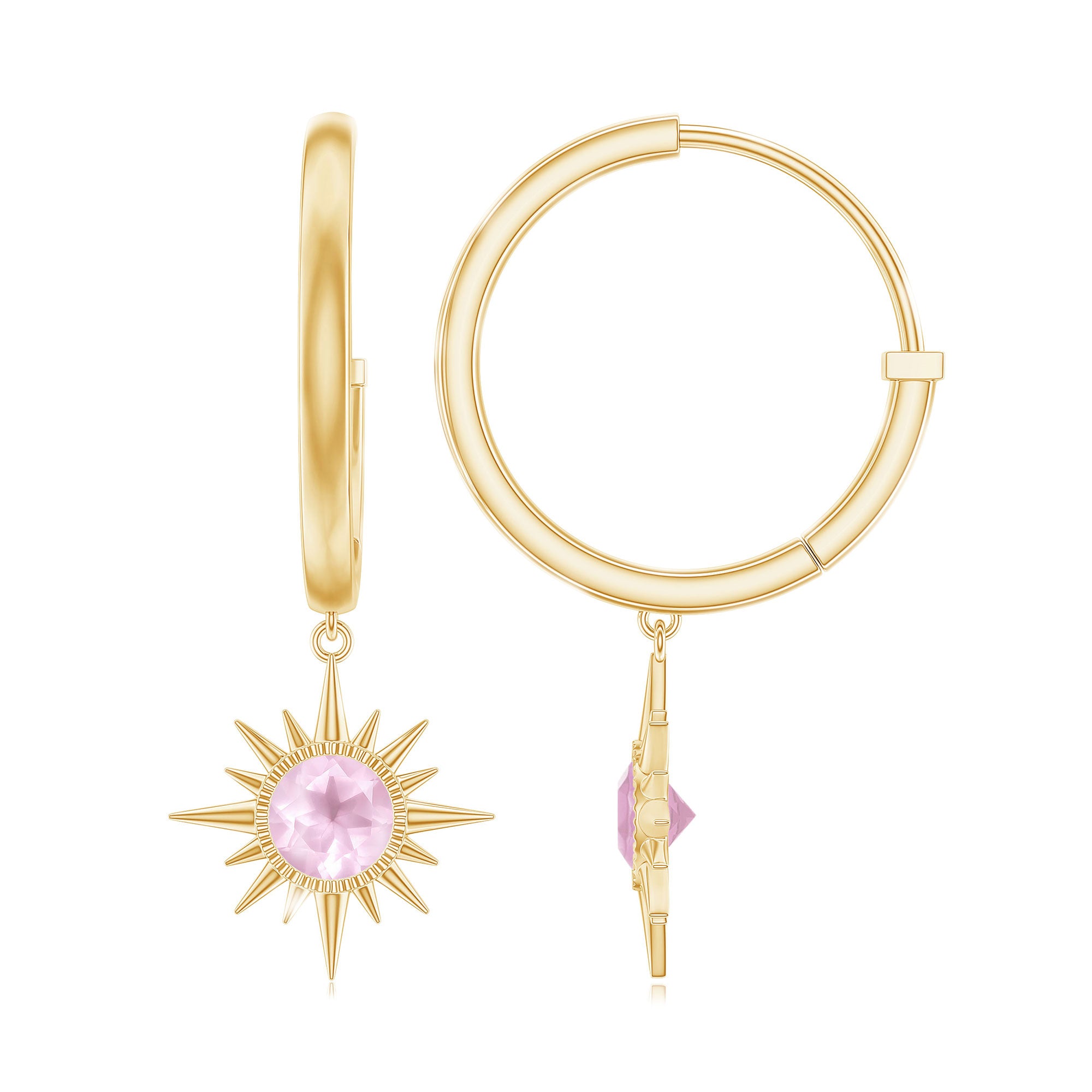Flaunt with these beautiful Sunburst Drop Hoop Earrings adorned with Round Cut Rose Quartz set in Milgrain Bezel Setting. These Stud Earrings are Composed of Solid Gold.