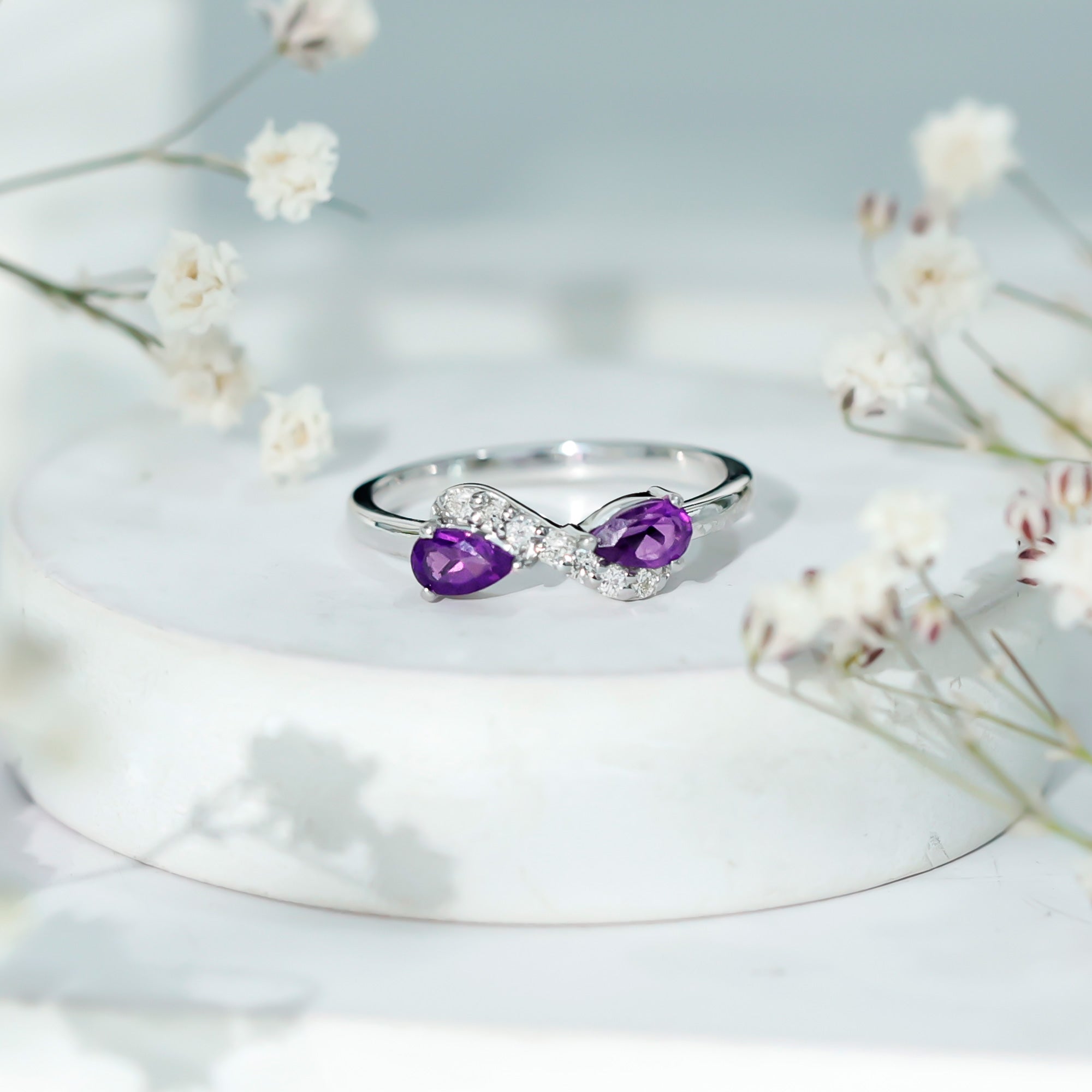Add sparkle to your relationship by presenting this amazing Infinity Promise Ring to her. This Promise Ring is crafted with Pear Cut Amethyst and Round Diamond in a prong setting which makes this ring look glamorous with every outfit, get your hands on this Infinity ring today before its too late.