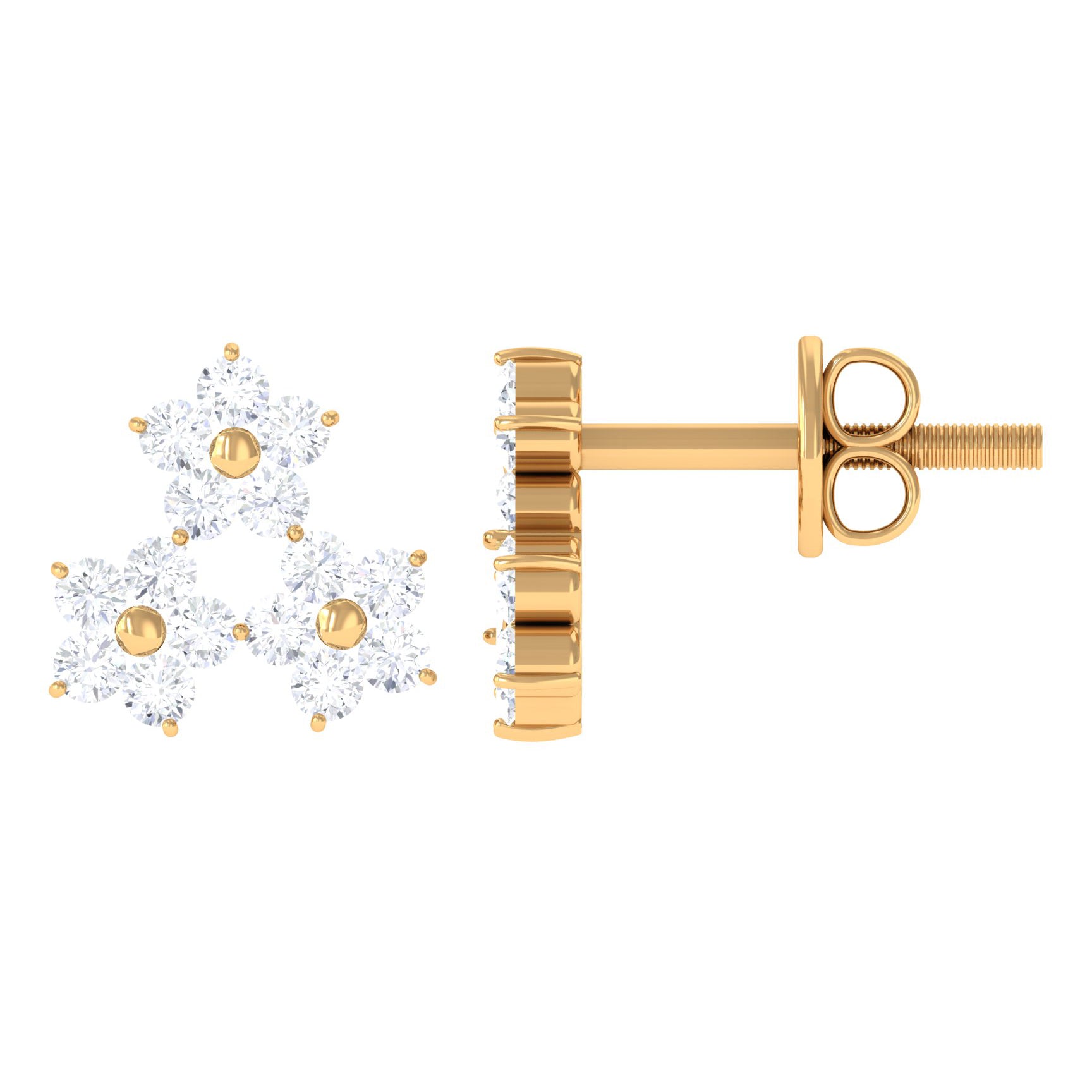 Grab this handpicked elegant jewelry for your loved one and make them happy. The Awesome Floral Stud Earring is adorned with Round Cut Diamonds in Prong Setting studded beautifully as Cluster of Three Flowers. Solid Gold crafting make this Screw Back Finding Stud Earring more Stunning.